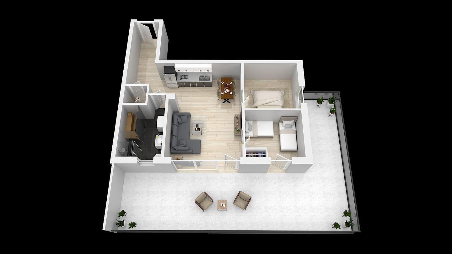 - Die Wohnung befindet sich im Erdgeschoss und bietet eine großzügige Terrasse.