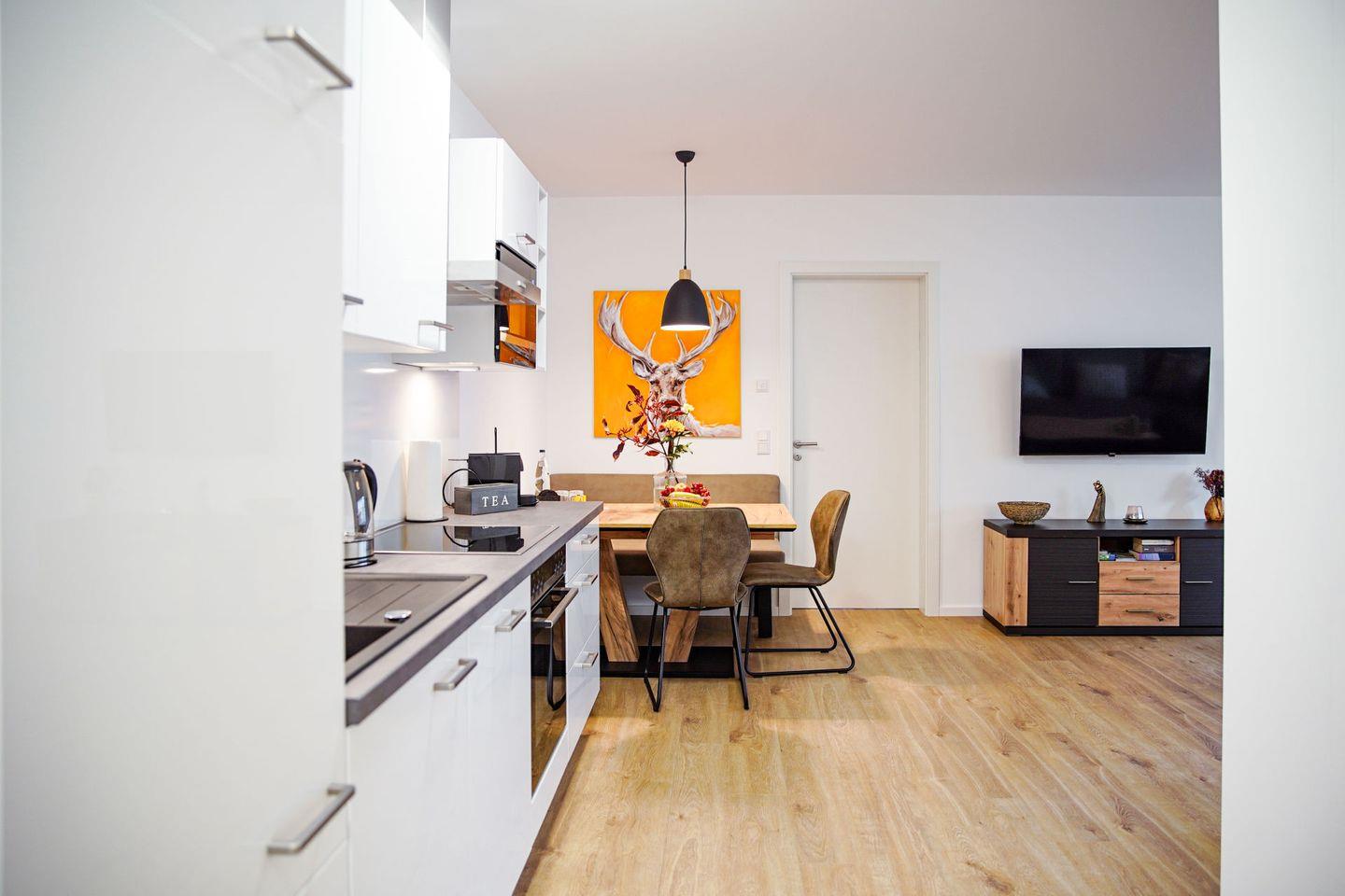 Erleben Sie unvergessliche Momente in unserer modernen Ferienwohnung im Gebirgsresort in Winterberg! Die 65 m² große Unterkunft bietet Platz für bis zu fünf Personen und überzeugt mit zwei gemütlichen Schlafzimmern, einem einladenden Wohnbereich und einer voll ausgestatteten offenen Küche. Entspannen Sie auf der überdachten Terrasse und genießen Sie die komfortablen Annehmlichkeiten wie WLAN, Fußbodenheizung und eine Waschmaschine. Ideal für Familien mit Kinderspielplatz in der Nähe