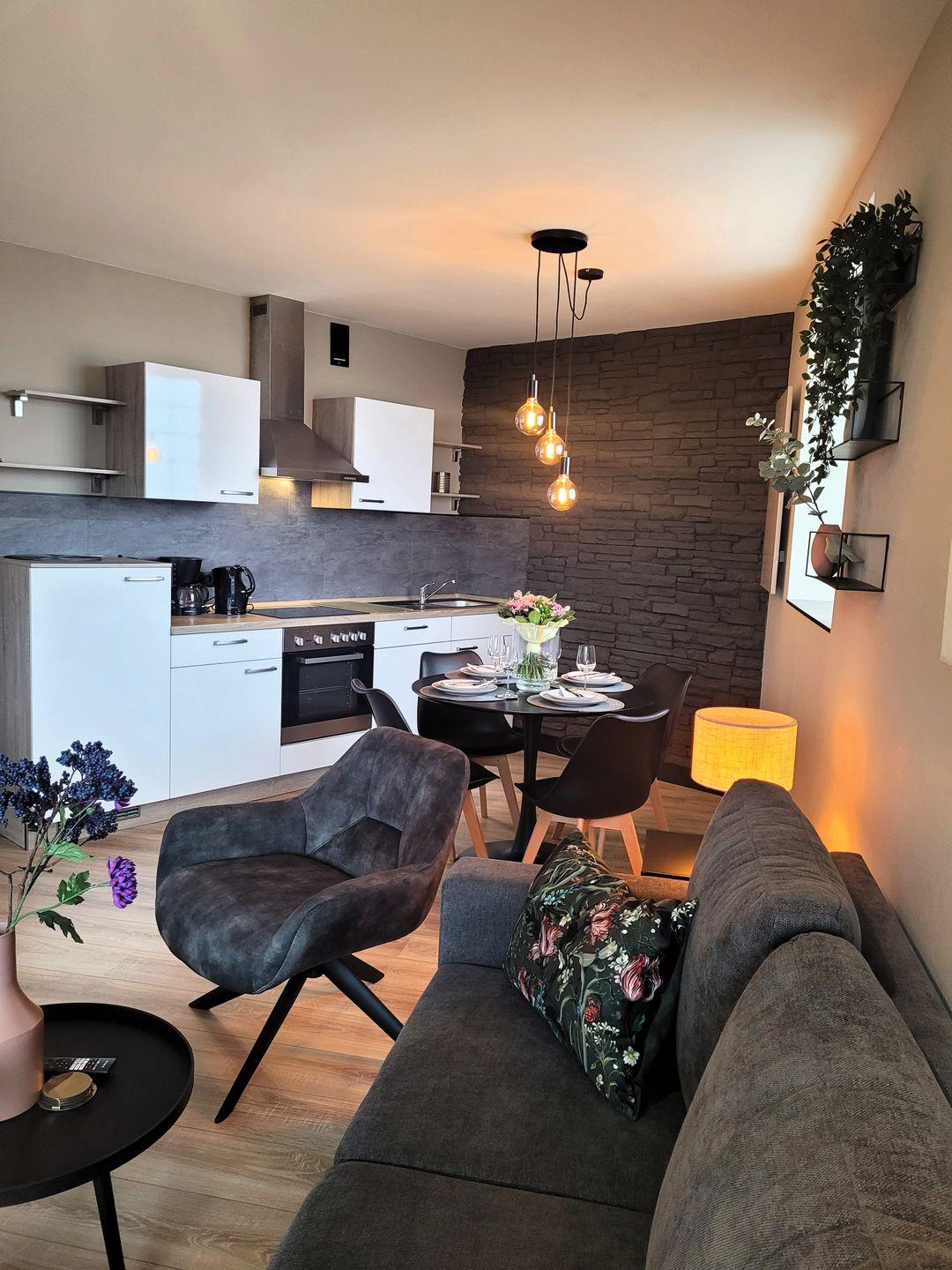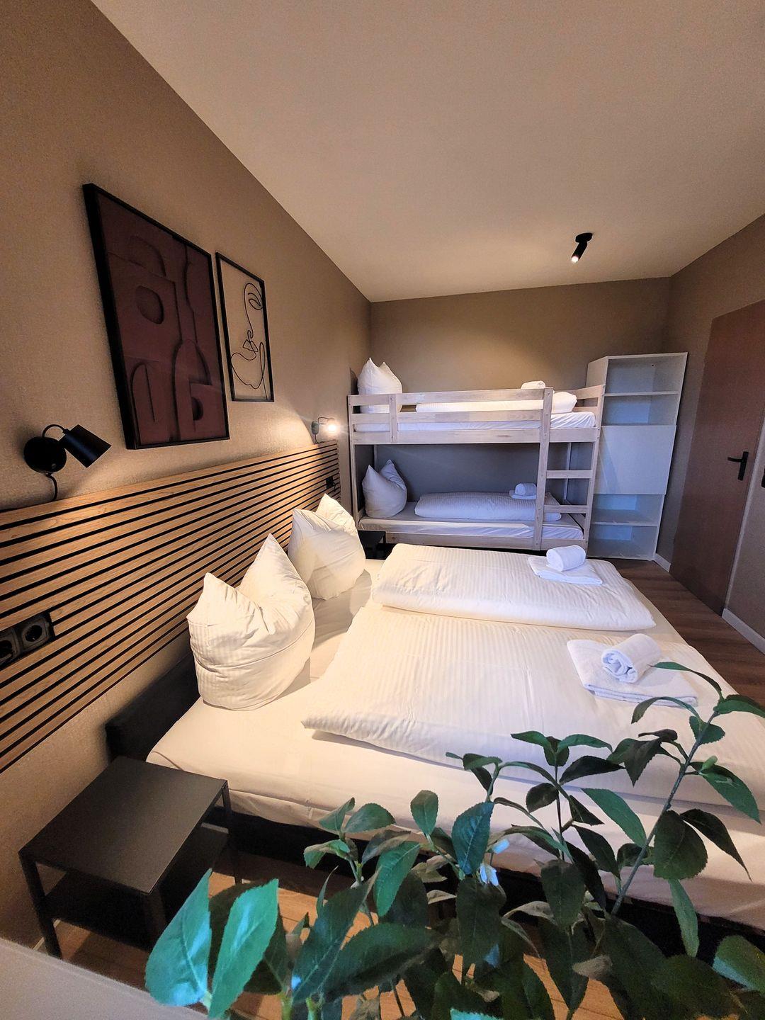 Diese Wohnung verfügt über eine Gesamtwohnfläche von ca. 60 m², die sich auf ein Wohn-Esszimmer mit offener Küche, ein Schlafzimmer mit einem Doppel- und einem Etagenbett, ein Duschbad und einen überdachten Balkon verteilen. Alternativ zum Etagenbett könnten die 3. und 4. Person auch auf der Schlafcouch im Wohnzimmer übernachten. Im Wohnzimmer steht ein Smart-TV zur Verfügung, mit dem auch Netflix zu empfangen ist.