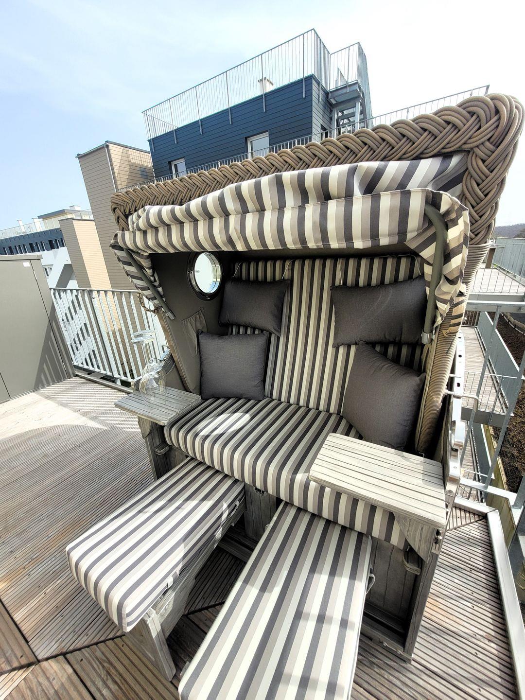 Insgesamt ca. 110 m² Wohnfläche verteilen sich auf eine Diele, ein großes Wohnzimmer mit Fernseher (Magenta TV mit Netflix und Netflix Plus) und einer offenen, perfekt eingerichteten Küche mit großem Esstisch, ein geschmackvolles Schlafzimmer mit Doppelbett und Fernseher und ein weiteres Schlafzimmer mit Doppelbett, Etagenbett und ebenfalls einem Fernseher. Des Weiteren gehört ein großzügiges Badezimmer zur Wohnung, in dem sich außer einer Waschmaschine und einem Wäschetrockner auch noch eine Infrarotkabine für 2 Personen befindet. Zusätzlich gibt es noch ein extra Gäste WC. Vom Wohnzimmer aus haben Sie einen Zugang zum großen Balkon, welcher außerhalb der Wintersaison mit Gartenmöbel bestückt ist. Für die 7. und 8. Person steht das Sofa im Wohnzimmer (ausziehbar) zur Verfügung.