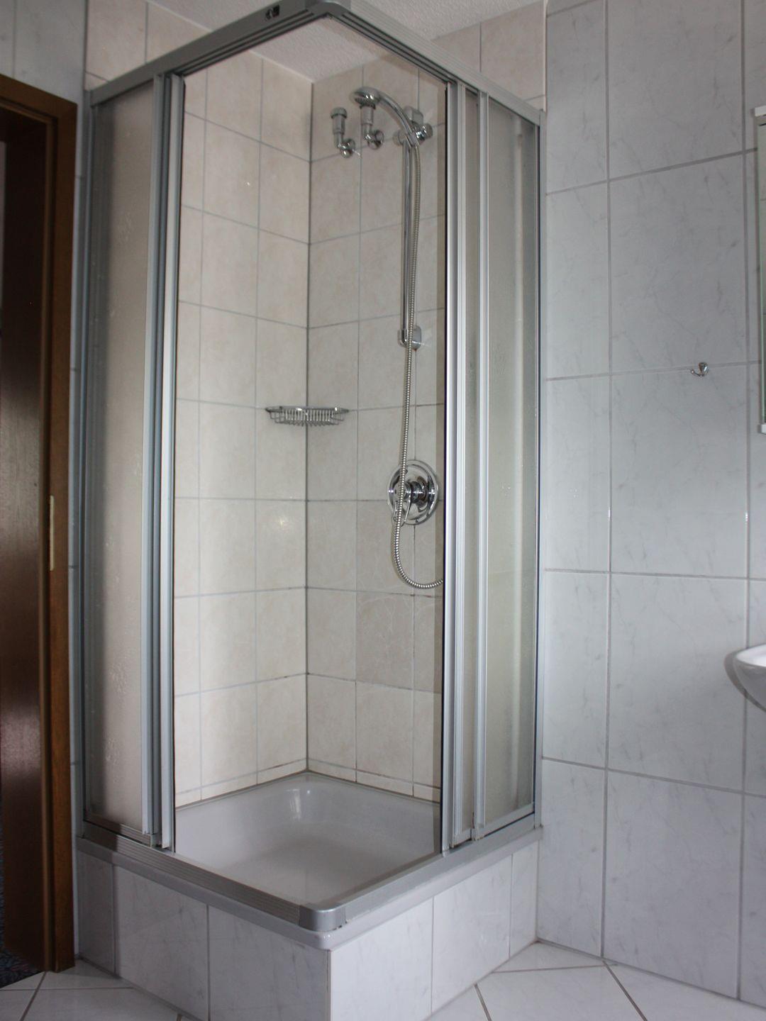 Das angrenzende Duschbad ist praktisch und stilvoll gestaltet, sodass Sie sich nach einem langen Tag erfrischen können.