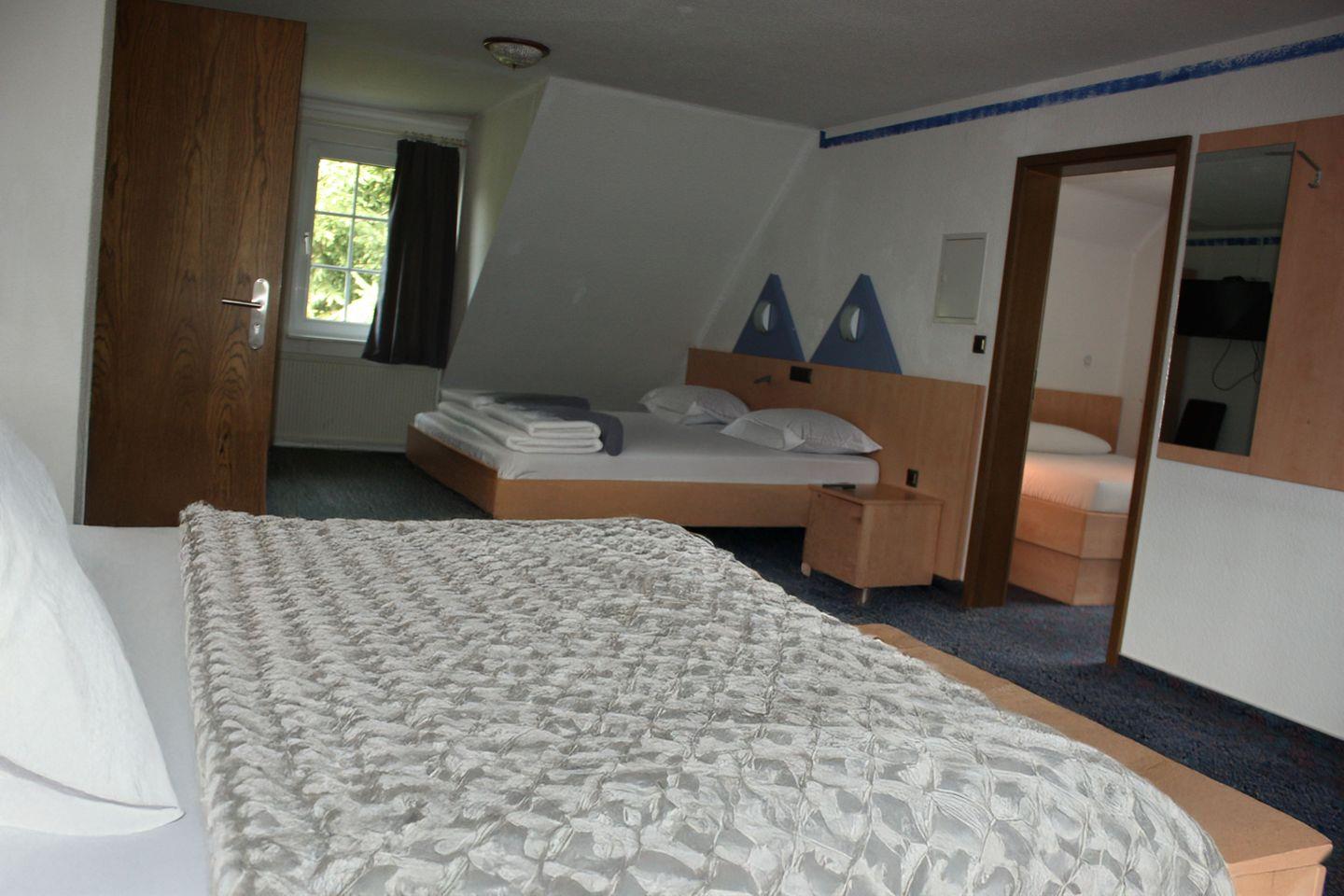 Willkommen in unserem 46 qm großen Zimmer, aufgeteilt auf zwei Schlafräume für 6 Personen. Es ist mit drei komfortablen Doppelbetten ausgestattet. Zudem zwei Fernseher. Das angrenzende Duschbad bietet Ihnen alles für Ihre Erfrischung.