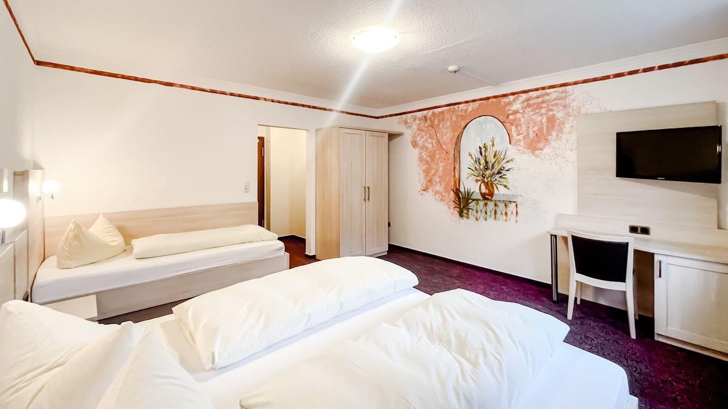 Willkommen in unserem charmanten Zimmer für bis zu drei Personen! Mit 28 qm bietet es ausreichend Platz zum Entspannen. Es verfügt über ein komfortables Doppelbett und ein Einzelbett sowie einen modernen Fernseher.