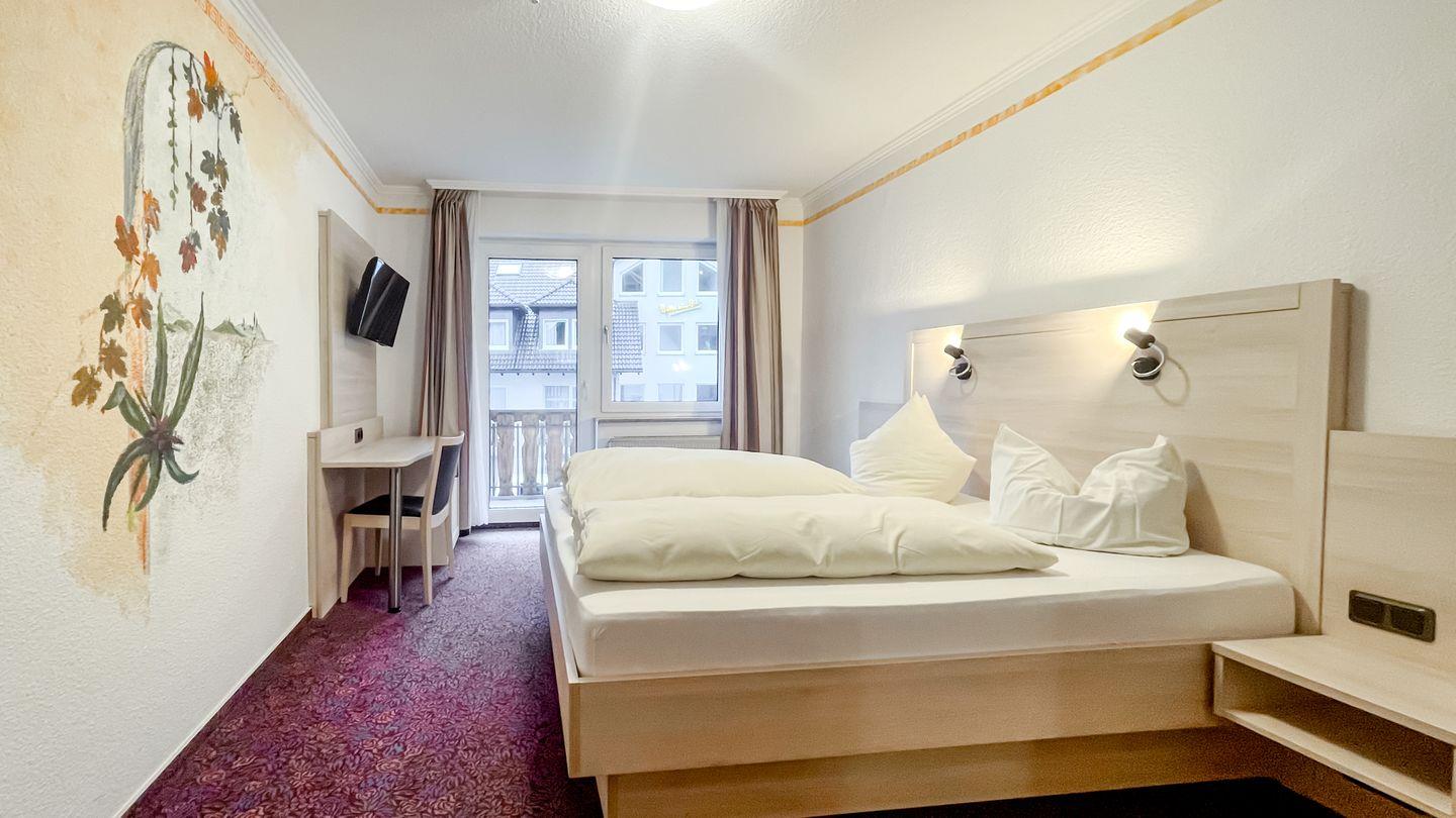 Willkommen in unserem charmanten Zimmer für zwei Personen! Mit 28 qm bietet es ausreichend Platz zum Entspannen. Es verfügt über ein komfortables Doppelbett, sowie einen modernen Fernseher. Ein Balkon ist vorhanden.