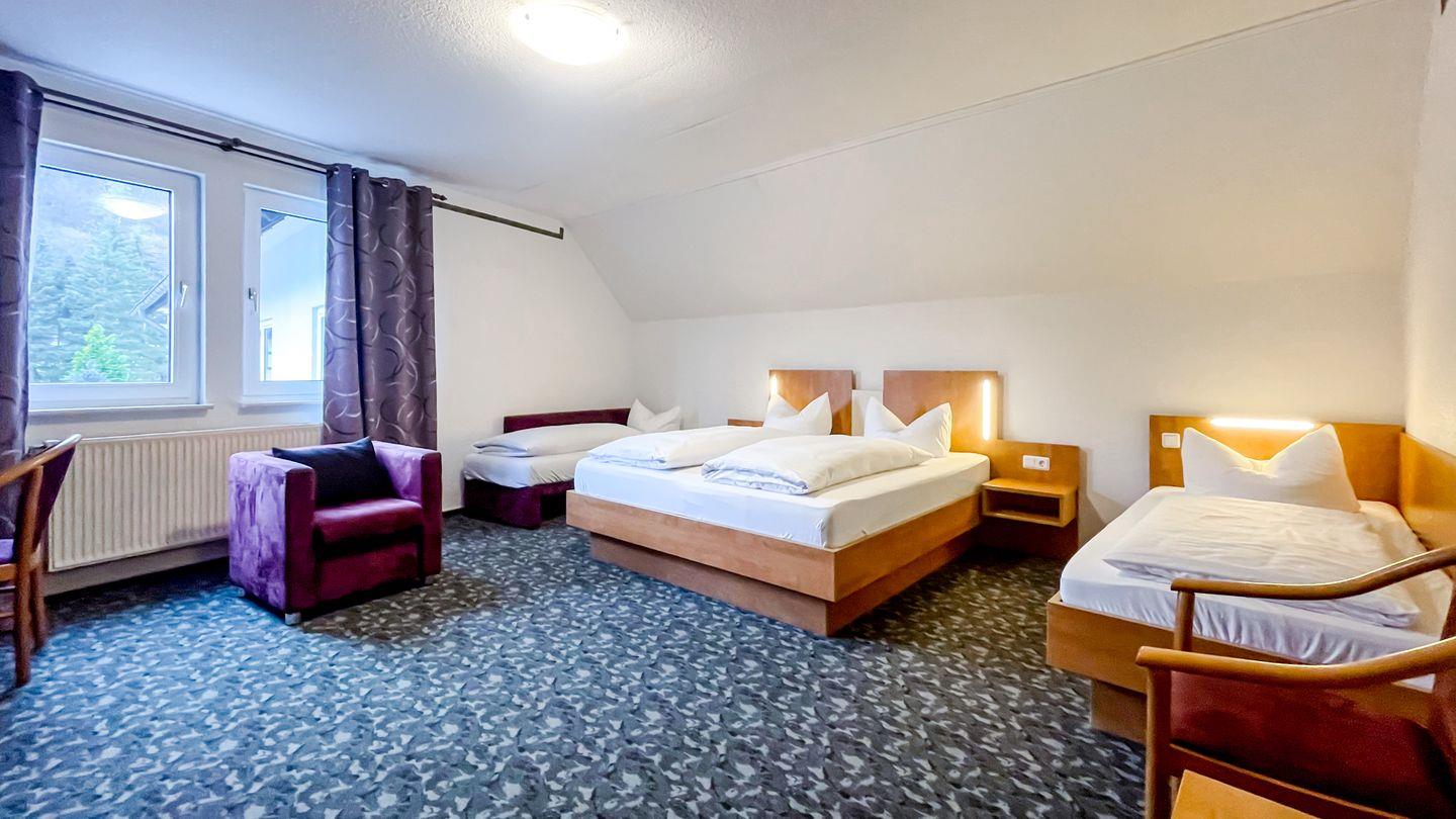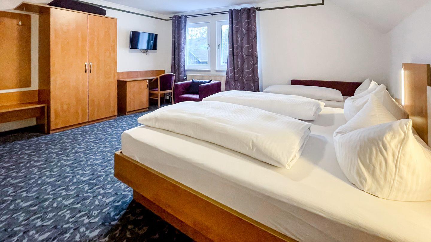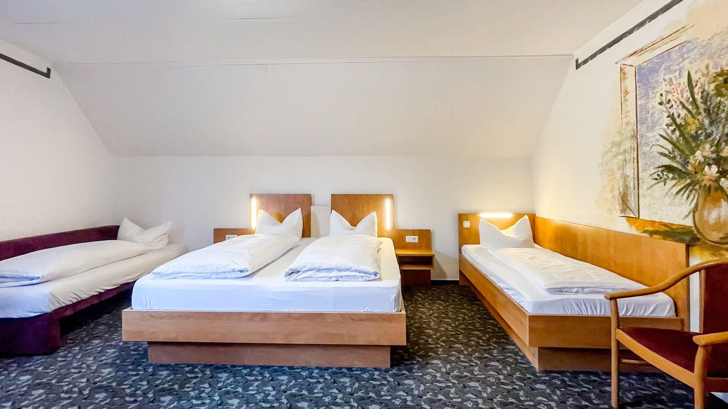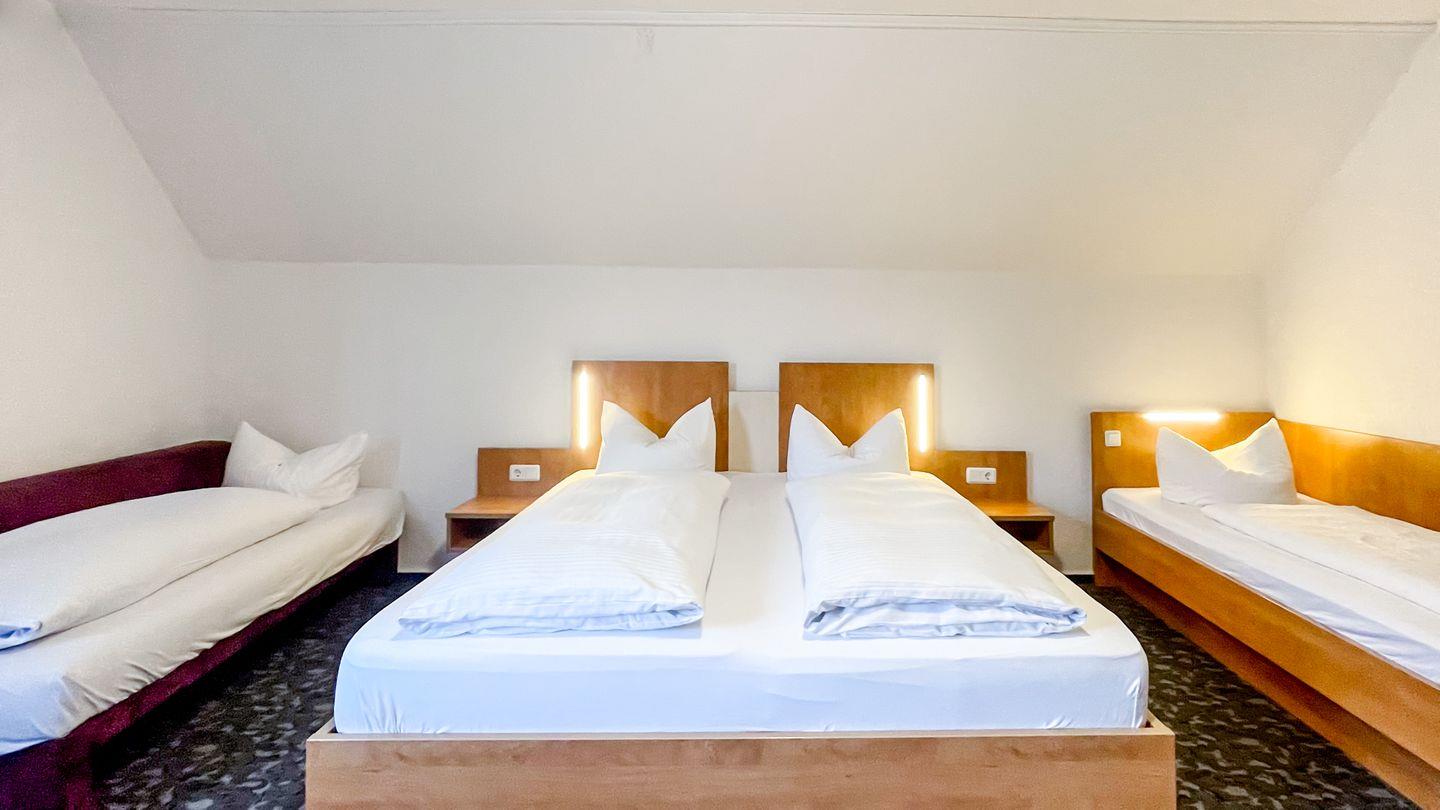 Willkommen in unserem charmanten Zimmer für bis zu vier Personen! Mit 29 qm bietet es ausreichend Platz zum Entspannen. Es verfügt über ein komfortables Doppelbett, einem Einzelbett, einem Schlafsofa, sowie einen modernen Fernseher.