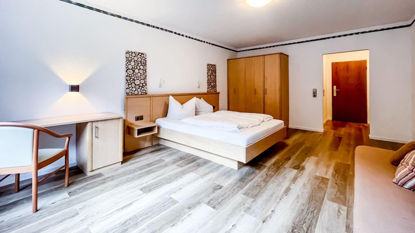 Willkommen in unserem charmanten Zimmer für bis zu 3 Personen! Mit 32 qm bietet es ausreichend Platz zum Entspannen. Es verfügt über ein komfortables Doppelbett, ein Schlafsofa sowie einen modernen Fernseher.