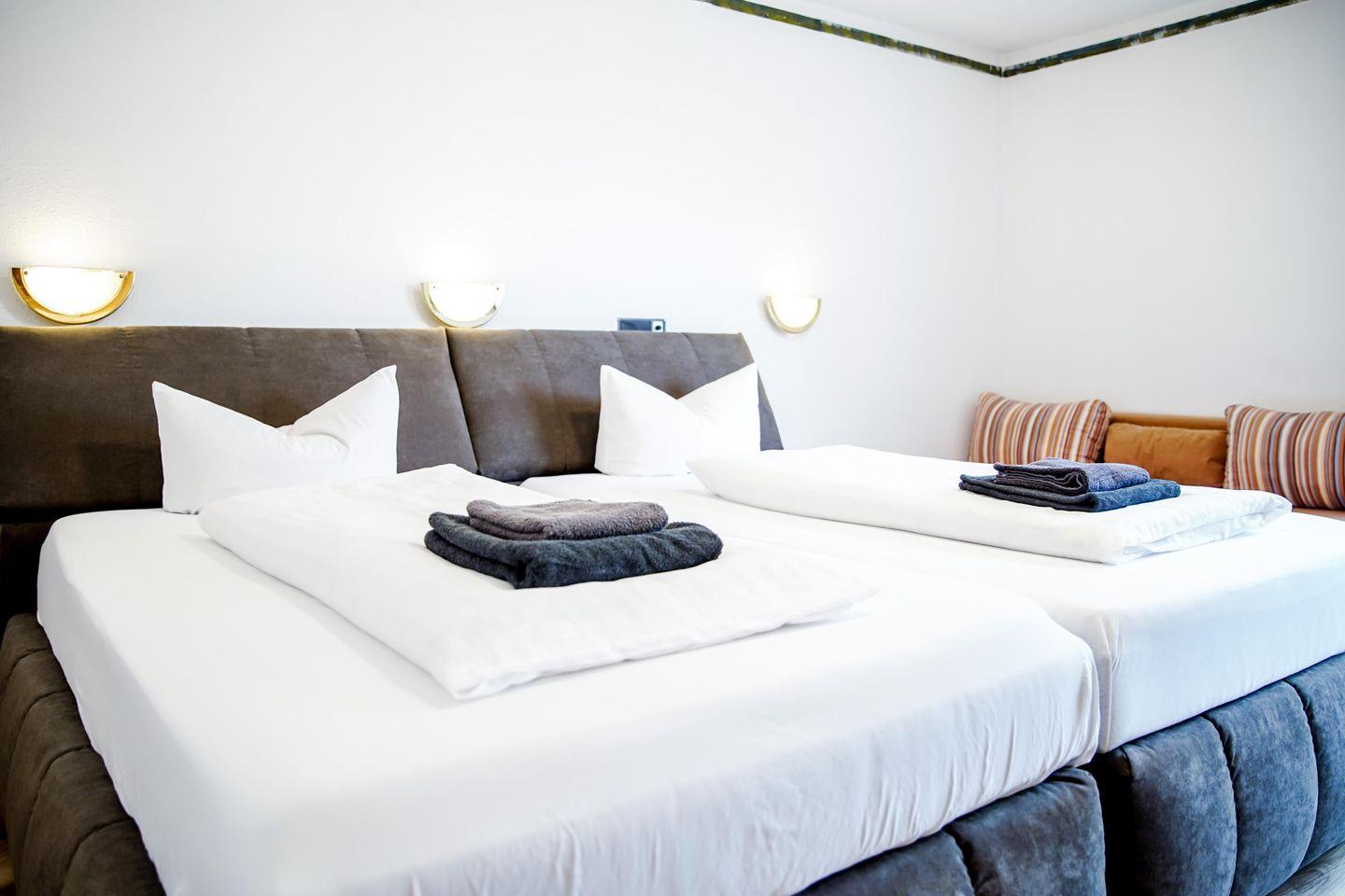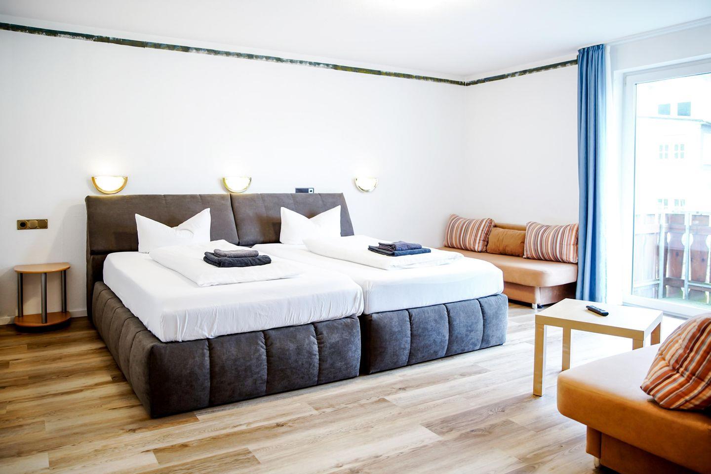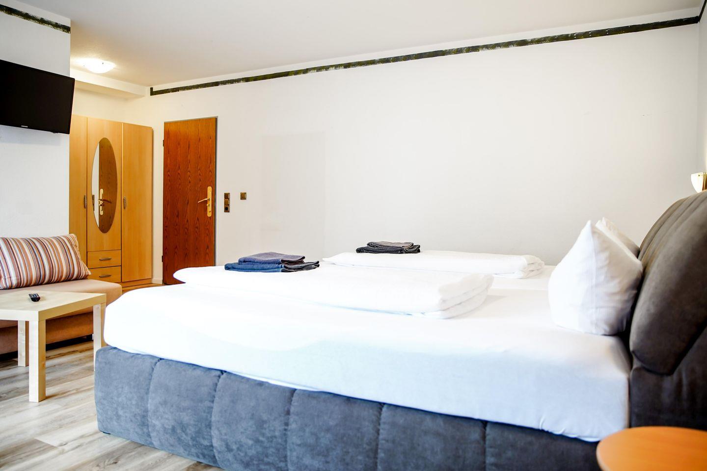 Willkommen in unserem charmanten Zimmer für bis zu 4 Personen! Mit 32 qm bietet es ausreichend Platz zum Entspannen. Es verfügt über ein komfortables Doppelbett, zwei Schlafsofa, sowie einen modernen Fernseher.