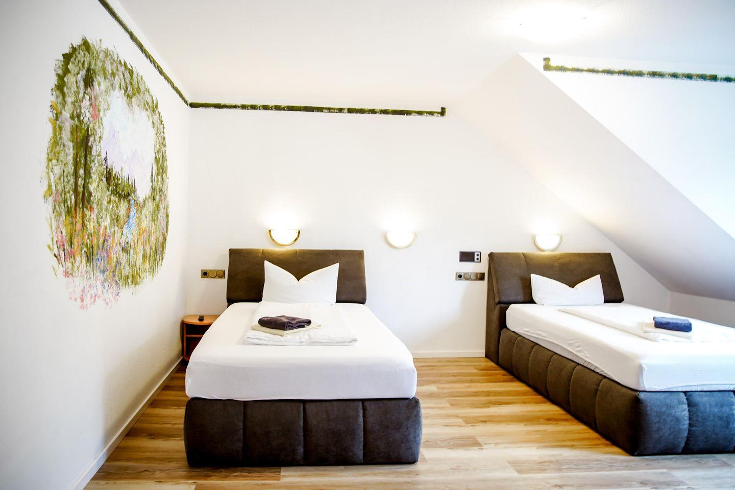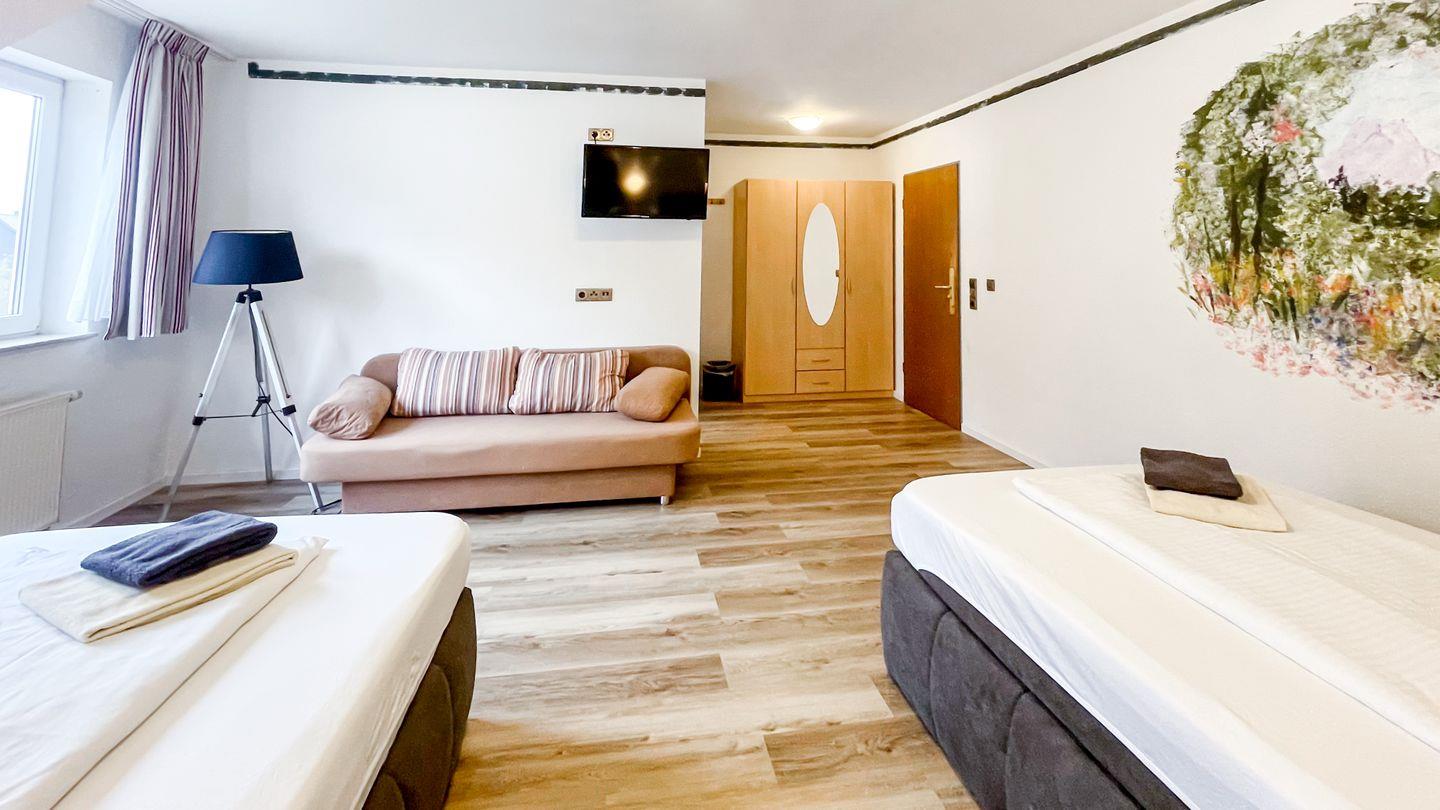 Willkommen in unserem charmanten Zimmer für bis zu 3 Personen! Mit 32 qm bietet es ausreichend Platz zum Entspannen. Es verfügt über ein komfortables Doppelbett, ein Schlafsofa, sowie einen modernen Fernseher. Zwei voll ausgestattete Küchen im Dachgeschoss ermöglichen die Selbstversorgung. Im Erdgeschoss unseres Nachbarhauses "Smart Resorts B&B 1" finden Sie einladende Gemeinschaftsräume mit saisonalem Frühstück, einem Snackautomaten und einer Kaffeemaschine.