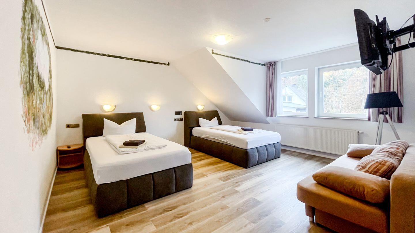 Herzlich willkommen in unserem charmanten Zimmer, das perfekt für 3 Personen geeignet ist. Mit einer großzügigen Fläche von 32 qm bietet es viel Raum zum Entspannen und Wohlfühlen. Ausgestattet mit einem bequemen Doppelbett, ein Schlafsofa, sorgt es für eine erholsame Nachtruhe. Ein moderner Fernseher steht Ihnen zur Verfügung, um Ihre Lieblingssendungen zu genießen. Das angrenzende Duschbad ist sowohl praktisch als auch stilvoll gestaltet und ermöglicht Ihnen eine erfrischende Dusche nach einem langen Tag. Im Dachgeschoss befinden sich zwei voll ausgestattete Küchen für die Selbstversorgung, in denen Sie mit anderen Gästen entspannen oder köstliche Mahlzeiten zubereiten können. Eine Waschmaschine und Trockner steht ebenfalls zur Verfügung, die Sie jederzeit nutzen können. Direkt im Nachbarhaus Smart Resorts B&B 1 finden Sie einladenden Gemeinschaftsräume, in denen je nach Saison ein Frühstück angeboten wird. Dort stehen Ihnen auserdem ein Snackautomat und eine Kaffeemaschine mit verschiedenen Spezialitäten zur Verfügung. Zudem gibt es einen Kicker und viele weitere Unterhaltungsmöglichkeiten. Wir bieten kostenfreie Parkplätze an, die Ihren Aufenthalt noch bequemer gestalten. Ob für einen Kurzurlaub oder einen längeren Aufenthalt – unser Zimmer hat alles, was Sie für eine angenehme Zeit benötigen! **Urlaub bei Smart Resorts inkl. Sauerland SommerCard!** Erleben Sie das Sauerland und die Region Winterberg in vollen Zügen – und das zum Vorteilspreis! Bei Ihrem Aufenthalt erhalten Sie die **Sauerland SommerCard** völlig kostenlos dazu. Mit dieser Karte genießen Sie von April bis Oktober eine Vielzahl von Freizeitaktivitäten und Attraktionen in der Region kostenfrei oder stark vergünstigt. **Ihre Vorteile mit der Sauerland SommerCard:** - **Kostenloser Eintritt** zu über 40 beliebten Attraktionen, wie z. B. Schwimmbädern, Kletterparks, Sommerrodelbahnen und Museen. - **Öffentlicher Nahverkehr** inklusive, um das Sauerland bequem und umweltfreundlich zu erkunden. - **Top-Attraktionen in der Nähe** wie die Bobbahn Winterberg, das Panoramabad und der Erlebnisberg Kappe – ohne zusätzliche Kosten. - **Ermäßigte Angebote** bei weiteren Freizeit- und Wellness-Aktivitäten. Nutzen Sie die Sauerland SommerCard, um das Beste aus Ihrem Aufenthalt herauszuholen. Mit dieser Karte können Sie entspannt die Vielfalt des Sauerlands entdecken – und das alles ohne zusätzliche Ausgaben für Freizeitaktivitäten! **Buchen Sie jetzt Ihren Urlaub bei Smart resorts und sichern Sie sich die Sauerland SommerCard als kostenloses Extra!**