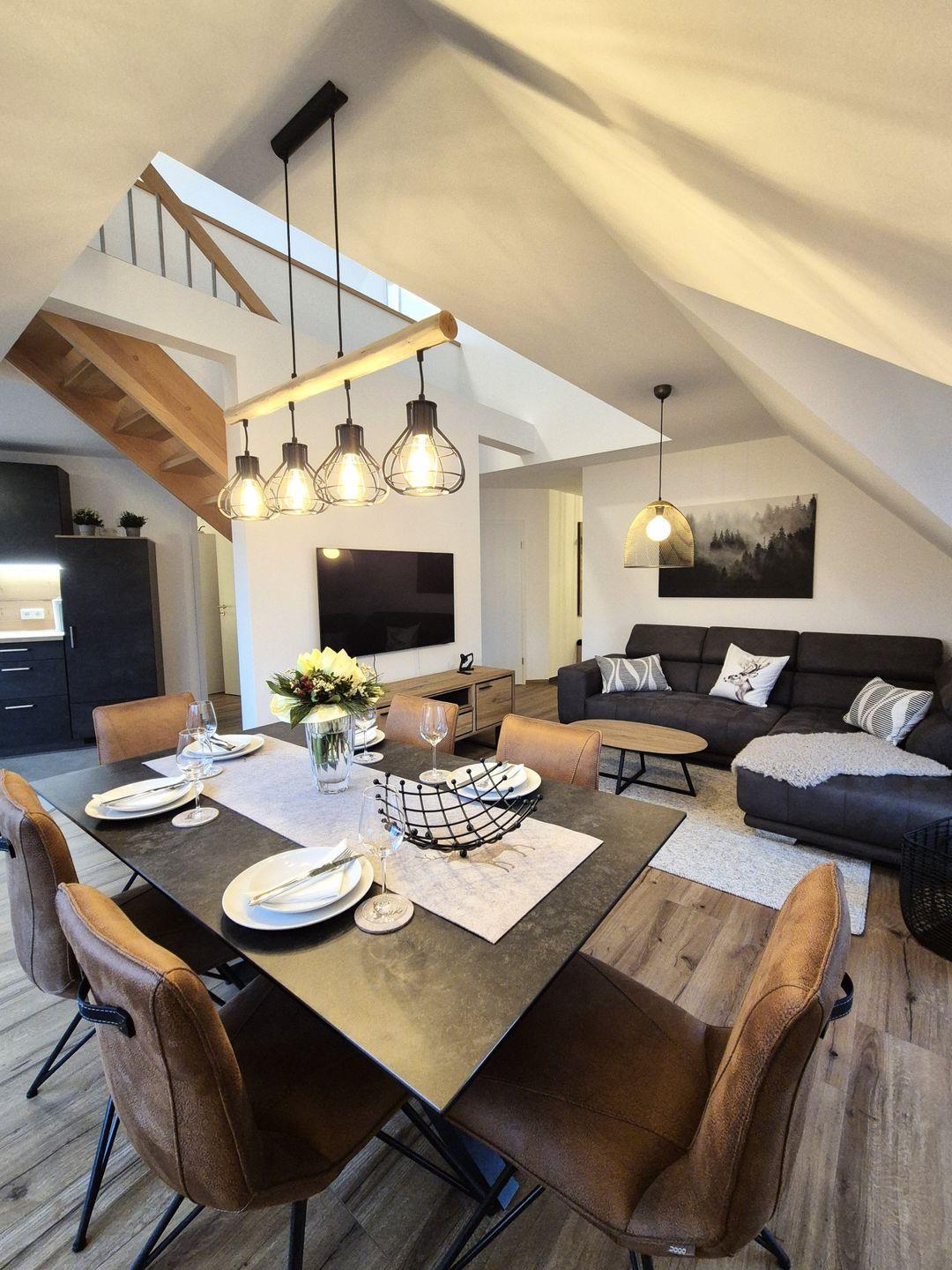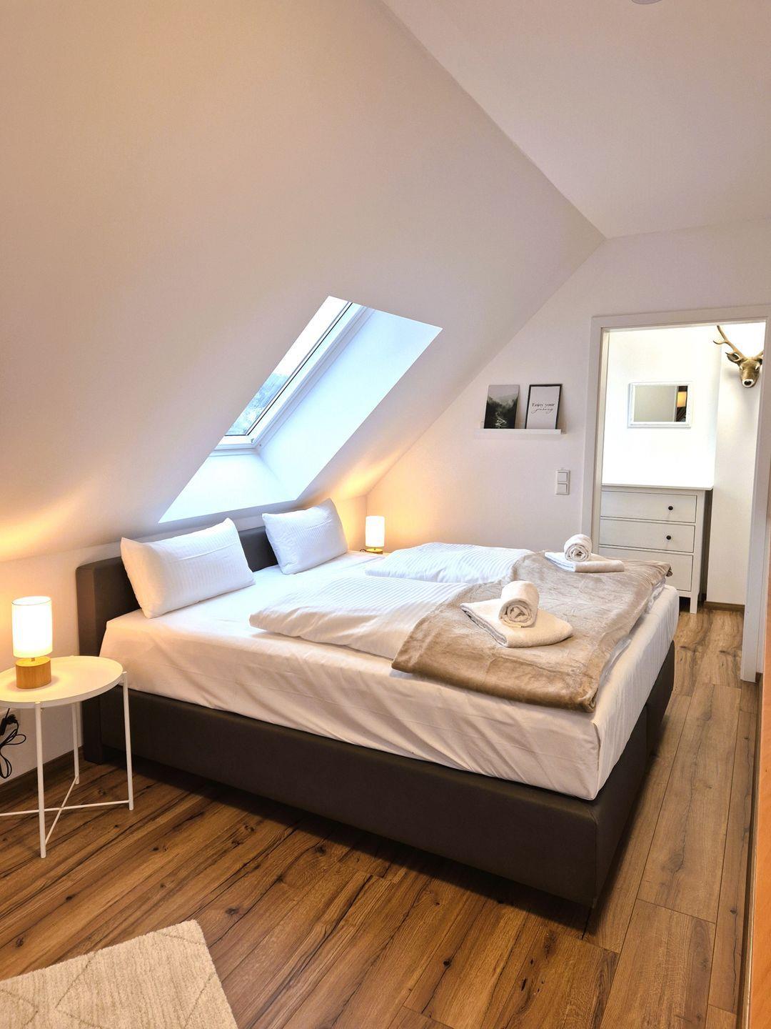 Insgesamt gut 96 m² Wohnfläche verteilen sich über zwei Etagen. Auf der unteren Ebene befinden sich eine Diele mit Garderobe, ein großer Wohn-Essraum mit Fernseher und eine offene Küche mit Zugang zum Balkon, ein geräumiges, gemütliches Doppelschlafzimmer mit Boxspringbett, ein Gäste-WC sowie ein großes Bad mit Doppelwaschbecken, Badewanne und barrierefreier Dusche. Vom Wohnzimmer aus geht es über eine Treppe zu einer offenen Galerie, auf der das zweite Doppelschlafzimmer, ebenfalls mit einem Boxspringbett ausgestattet, untergebracht ist. Hierbei handelt es sich nicht um einen geschlossenen Raum. Von der Galerie aus gibt es den Zugang zum 3. Schlafzimmer, welches mit einem Einzelbett bestückt ist.
