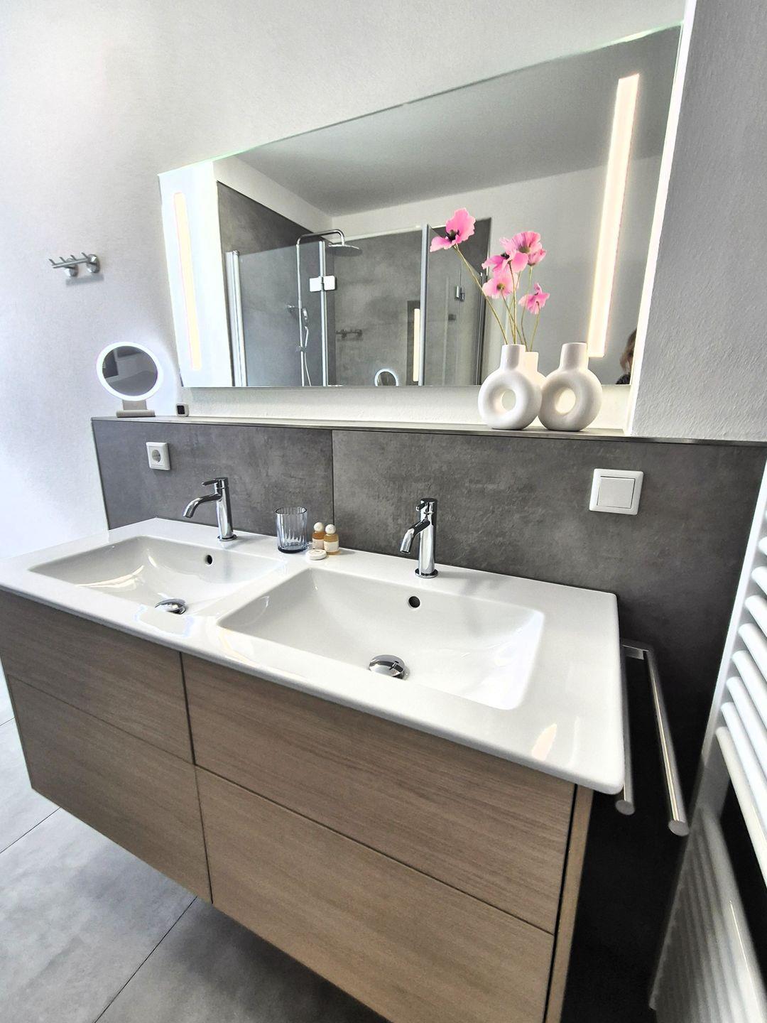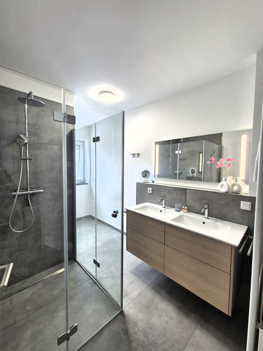 Insgesamt gut 65 m² Wohnfläche verteilen sich auf den Eingangsbereich mit Garderobe und Gäste WC, einen Wohn-Essraum mit SmartTV und offener Küche mit Zugang zur Terrasse sowie ein großes Bad mit Toilette, Doppelwaschbecken und barrierefreier Dusche, ein Doppelschlafzimmer mit einem 1,80 m breiten Boxspringbett (und mit einem weiteren Zugang zur Terrasse) und ein Doppelschlafzimmer mit einem 1,40 m breiten Standardbett. Die Wohnung verfügt außerdem über elektrische Rollläden. Das Sofa im Wohnzimmer ist ausgeklappt die Schlafmöglichkeit für die 5. Person.