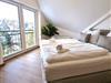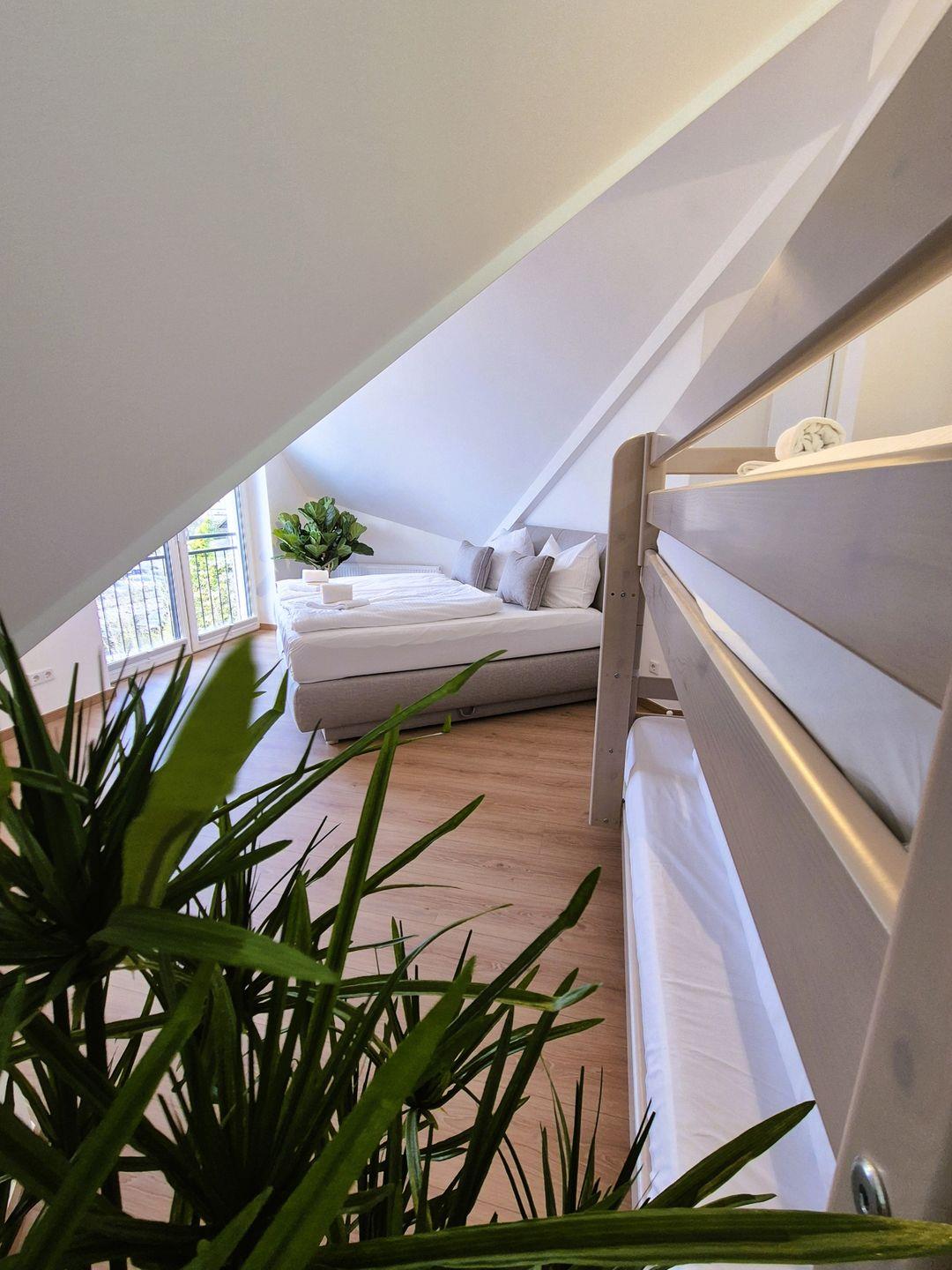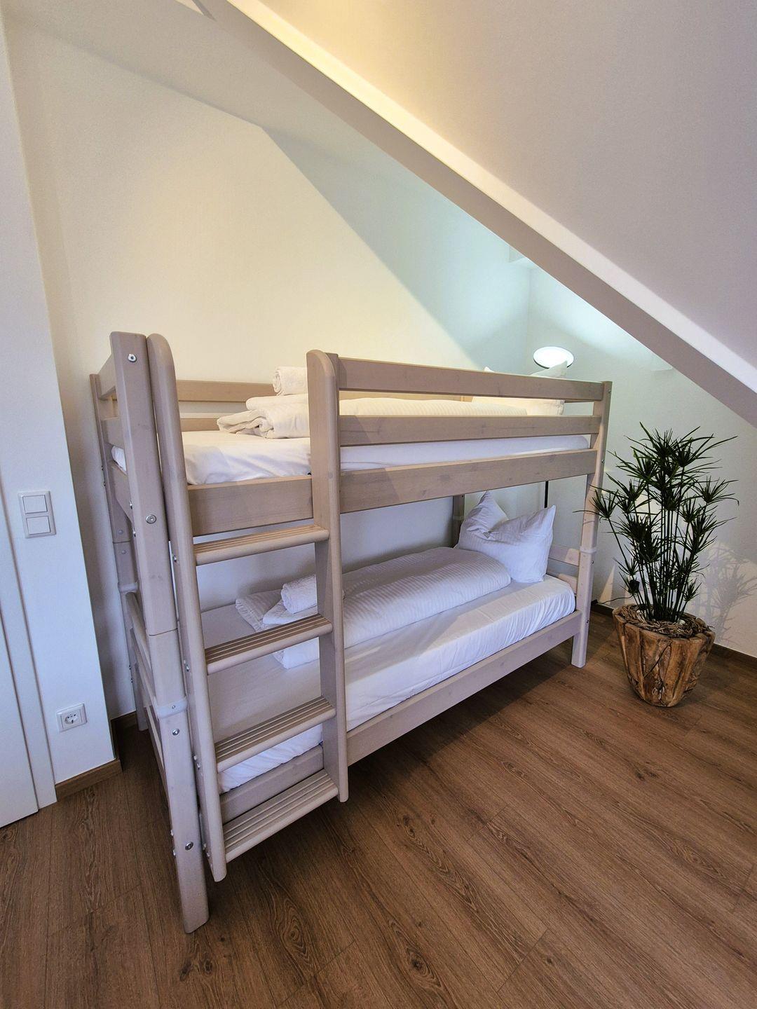 Insgesamt gut 130 m² Wohnfläche verteilen sich über zwei Etagen. Auf der unteren Ebene befinden sich eine Diele mit Garderobe, ein großer Wohn-Essraum mit Fernseher und eine Küche, ein gemütliches Doppelschlafzimmer mit Boxspringbet, Hochbett und einem weiteren Fernseher, ein Gäste-WC mit Waschmaschine sowie ein großes Bad mit Waschbecken, Badewanne und barrierefreier Dusche. Der große Balkon ist sowohl von der Küche als auch vom Wohnzimmer aus begehbar und im Sommer mit Gartenmöbeln bestückt. Vom Flur aus geht es über eine Treppe in die obere Etage, auf der sich zwei weitere Schlafzimmer und das zweite Bad befinden. Ein Schlafzimmer verfügt über ein 1,60 m breites Boxspringbett und ein Hochbett sowie einen Fernseher, das andere Schlafzimmer verfügt über ein 1,80 m breites Boxspringbett und ebenfalls über einen Fernseher. In dem großzügigen Badezimmer mit Dusche, WC und Waschtisch befindet sich außerdem eine Infrarotsauna.