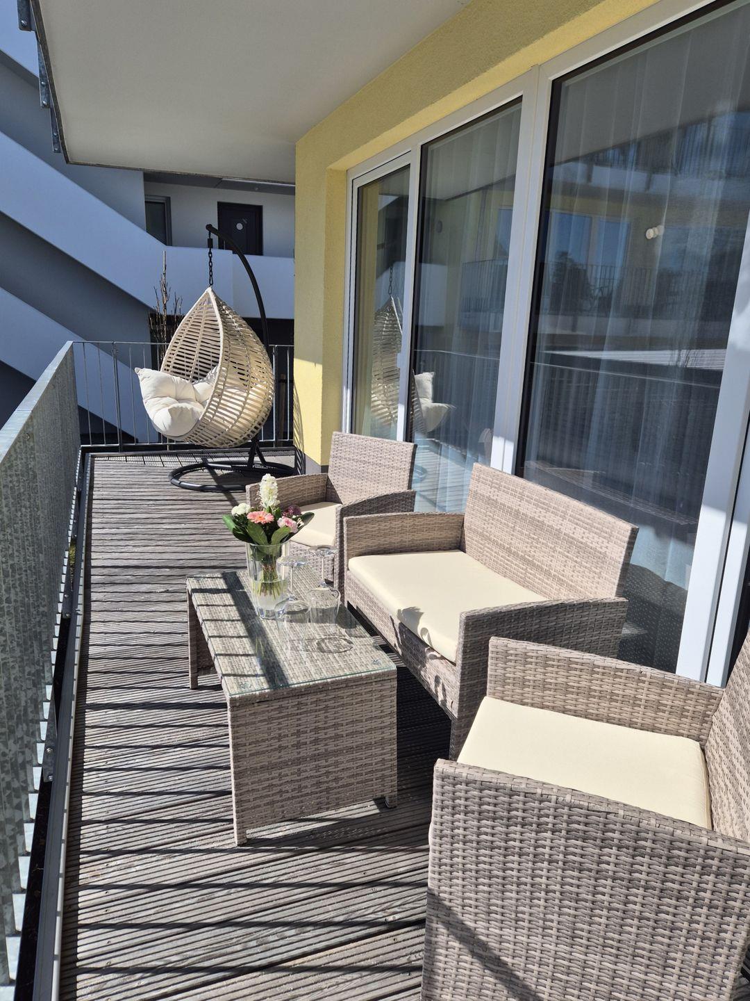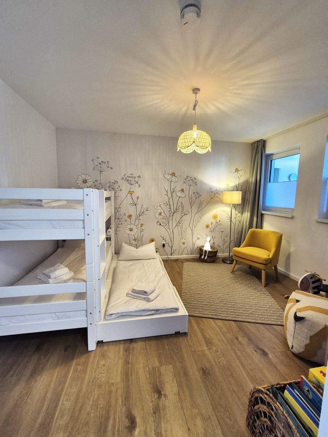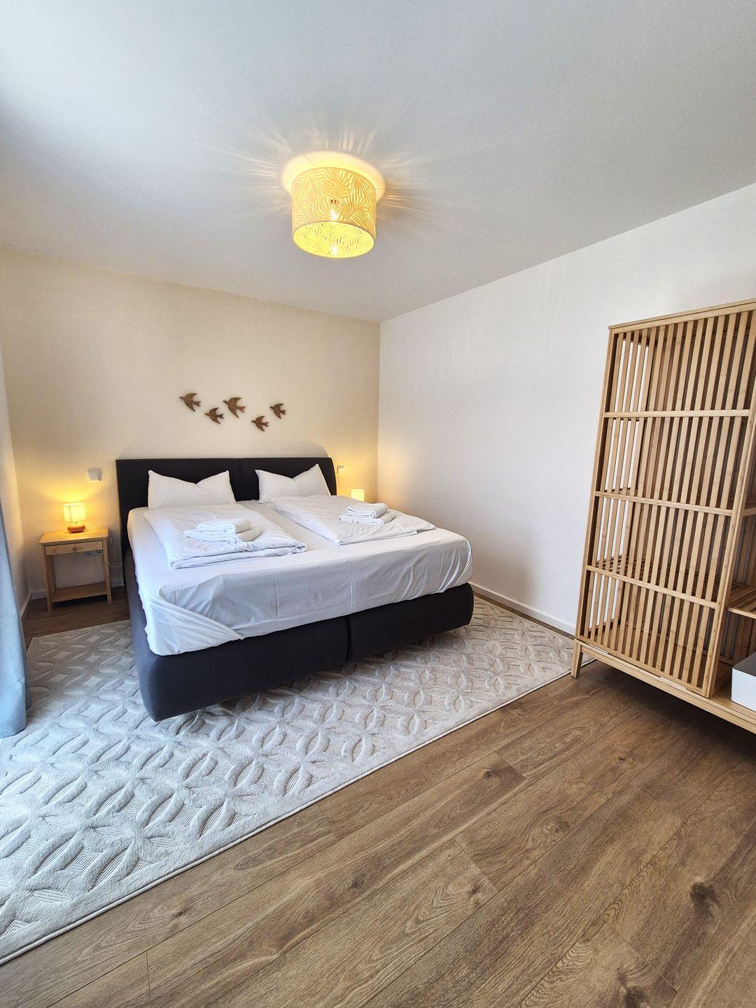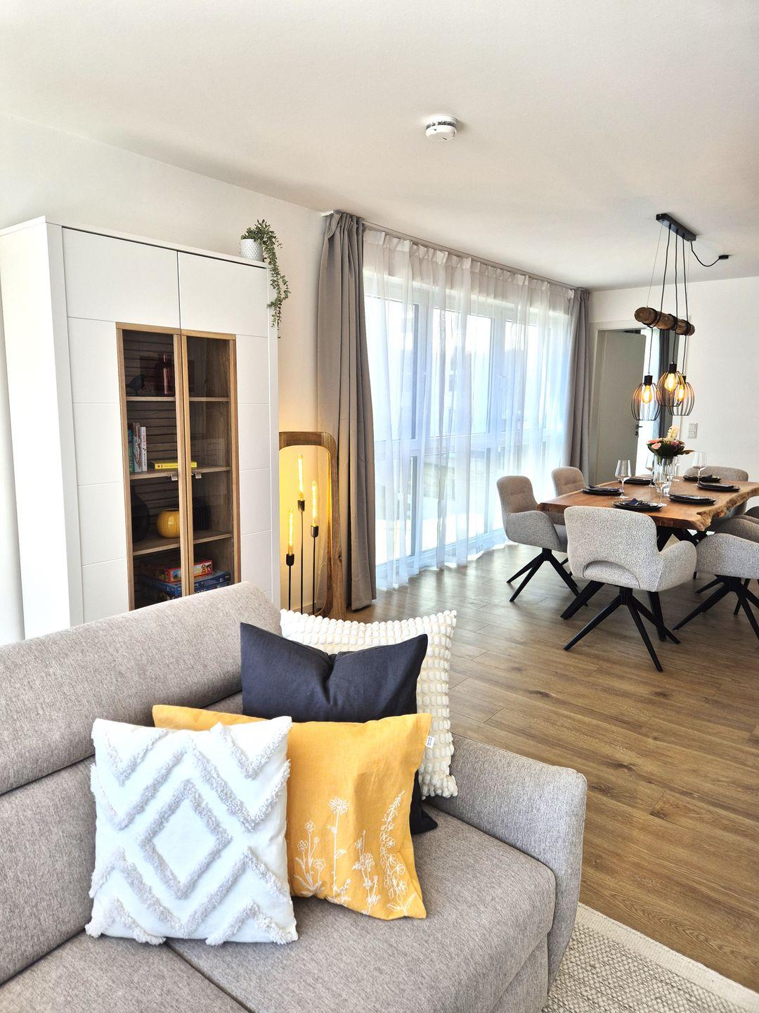 Insgesamt ca. 110 m² Wohnfläche verteilen sich auf eine Diele, ein sehr großes Wohnzimmer mit Fernseher, einer offenen, perfekt eingerichteten Küche mit großem Esstisch und einem bequemen Schlafsofa für die 5. und 6. Person, ein geschmackvolles Schlafzimmer mit Doppelbett und Fernseher und ein weiteres schönes Schlafzimmer mit einem Hochbett für 2 Personen mit einem Ausziehbett für die dritte Person. Dieses ist jedoch aufgrund der Länge nur für ein Kind ausgelegt. In diesem Schlafzimmer befinden sich auch Spiele und Bücher. Beide Fernseher in der Wohnung sind Smart TV's und haben Netflix-Empfang. Des Weiteren gehört ein großzügiges Badezimmer zur Wohnung, in dem sich auch noch eine Infrarotkabine für 2 Personen und eine Waschmaschine befinden. Vom Wohnzimmer aus haben Sie einen Zugang zum großen Balkon, welcher außerhalb der Wintersaison mit Gartenmöbeln bestückt ist.