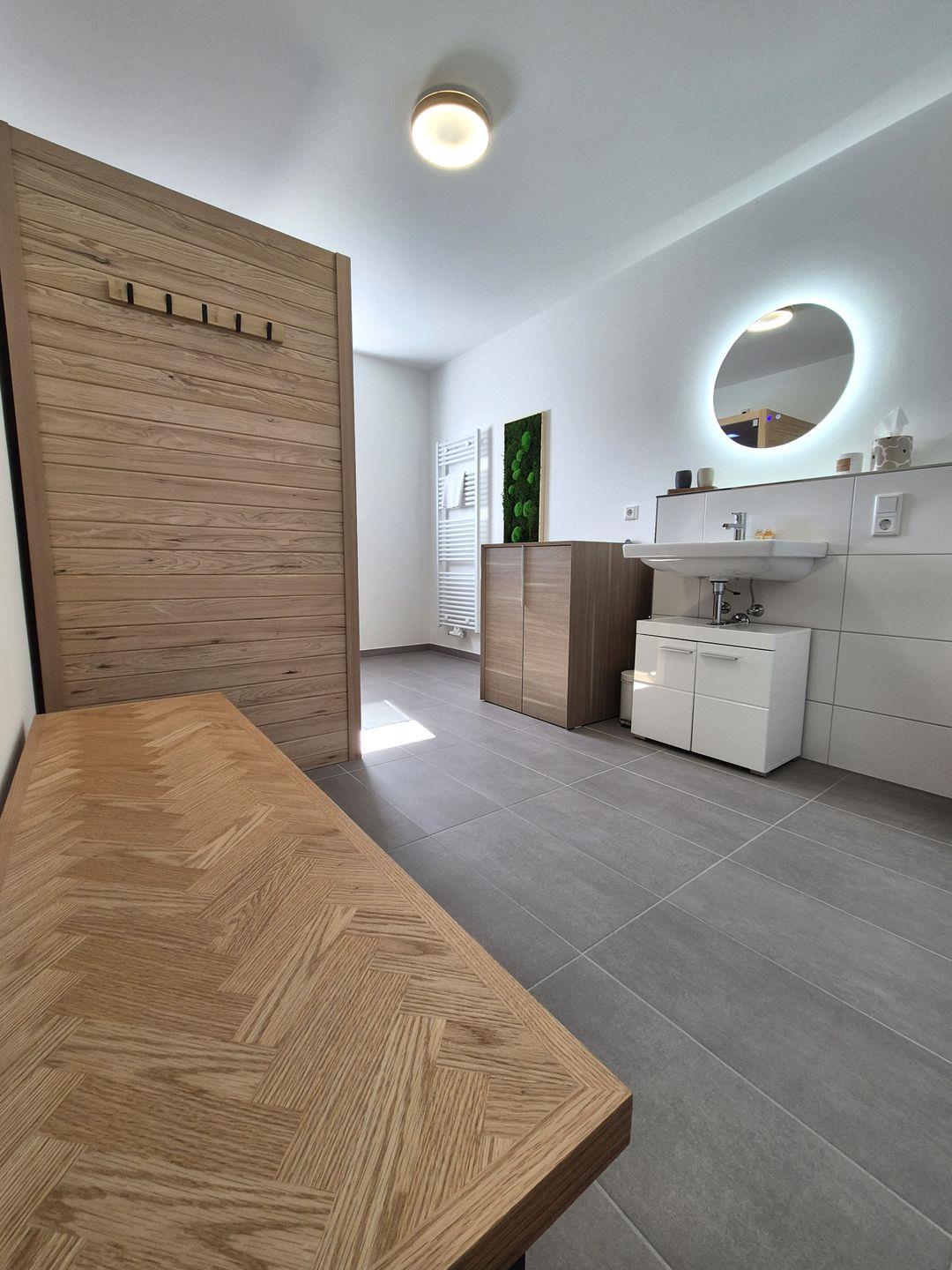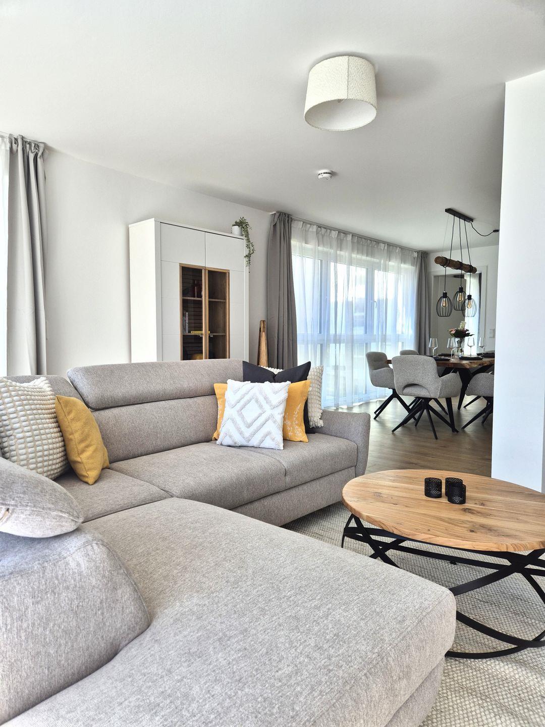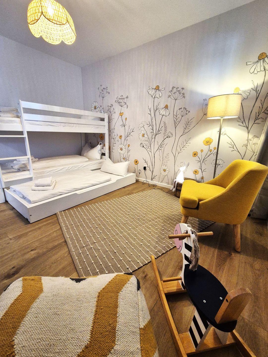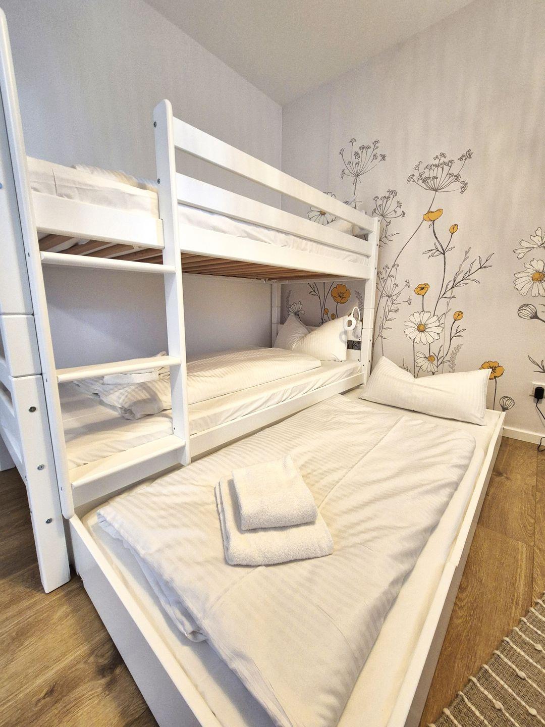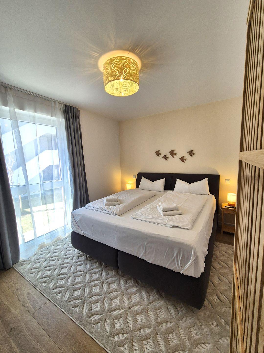 Insgesamt ca. 110 m² Wohnfläche verteilen sich auf eine Diele, ein sehr großes Wohnzimmer mit Fernseher, einer offenen, perfekt eingerichteten Küche mit großem Esstisch und einem bequemen Schlafsofa für die 5. und 6. Person, ein geschmackvolles Schlafzimmer mit Doppelbett und Fernseher und ein weiteres schönes Schlafzimmer mit einem Hochbett für 2 Personen mit einem Ausziehbett für die dritte Person. Dieses ist jedoch aufgrund der Länge nur für ein Kind ausgelegt. In diesem Schlafzimmer befinden sich auch Spiele und Bücher. Beide Fernseher in der Wohnung sind Smart TV's und haben Netflix-Empfang. Des Weiteren gehört ein großzügiges Badezimmer zur Wohnung, in dem sich auch noch eine Infrarotkabine für 2 Personen und eine Waschmaschine befinden. Vom Wohnzimmer aus haben Sie einen Zugang zum großen Balkon, welcher außerhalb der Wintersaison mit Gartenmöbeln bestückt ist.