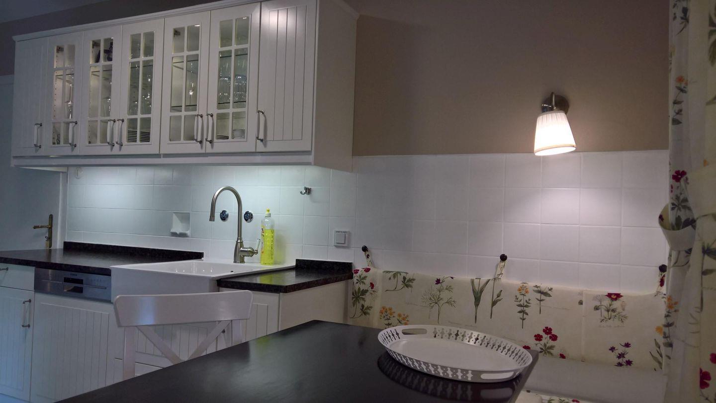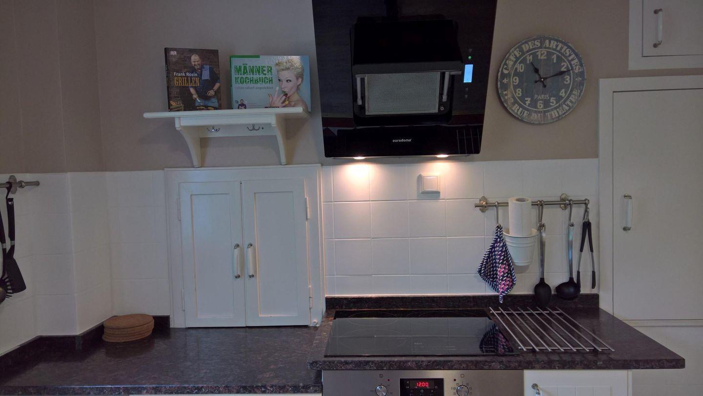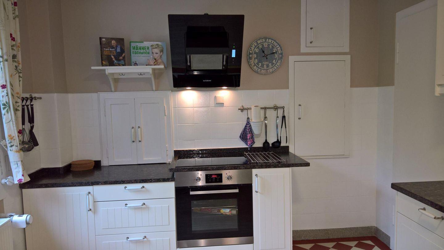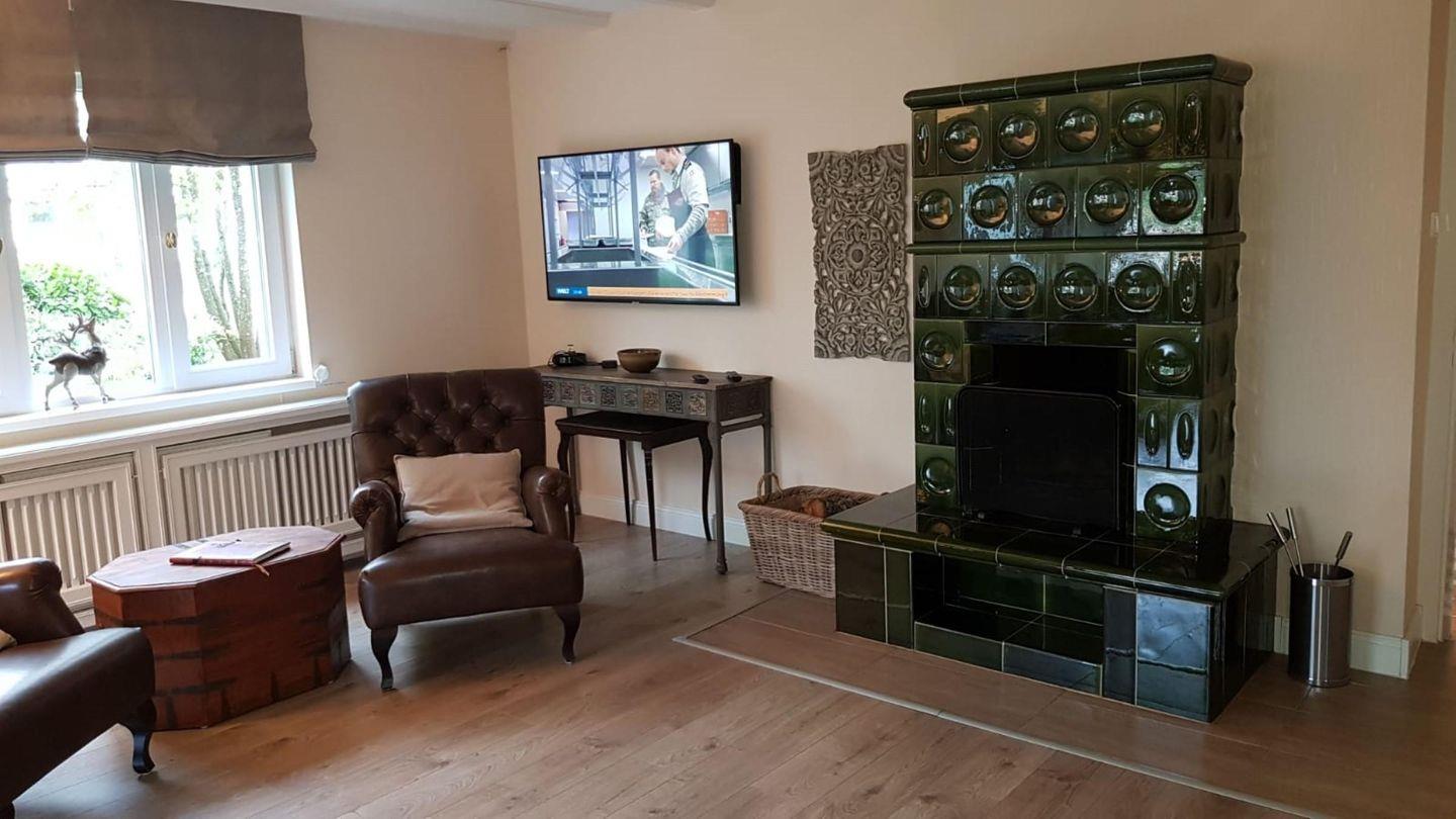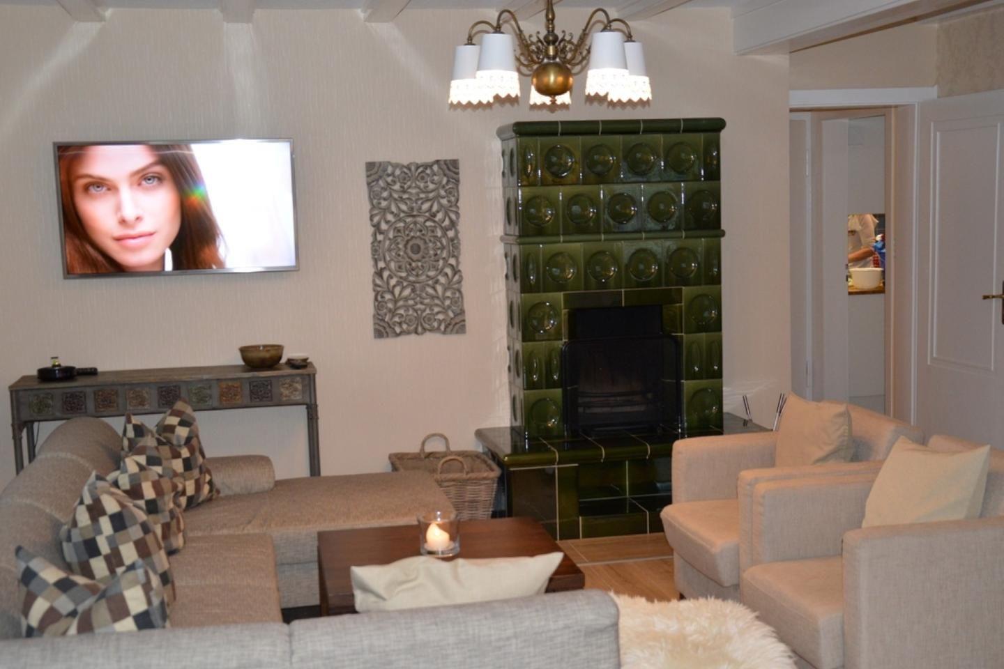 Im Innenbereich erwartet Sie eine geschmackvolle Mischung aus modernem Komfort und wohnlicher Atmosphäre. Die großzügige, geschlossene Küche ist mit hochwertigen Geräten wie Induktionsherd, Backofen, Mikrowelle, Spülmaschine, großem Kühlschrank samt Gefrierfach, Kaffeemaschine, Wasserkocher, Toaster, Eierkocher sowie umfassendem Küchenzubehör ausgestattet und macht das Kochen für größere Gruppen besonders angenehm. Eine offene Ess- und Wohnlandschaft, ausgestattet mit komfortablem Sofa, Sesseln, Esstisch und offenem Kamin, lädt zum gemeinsamen Entspannen ein. Drei TVs (digitaler Satellitenempfang), HiFi-Anlage, Blu-ray- und DVD-Player sowie Bücher, Spiele und DVDs sorgen für Unterhaltung an ruhigen Tagen.