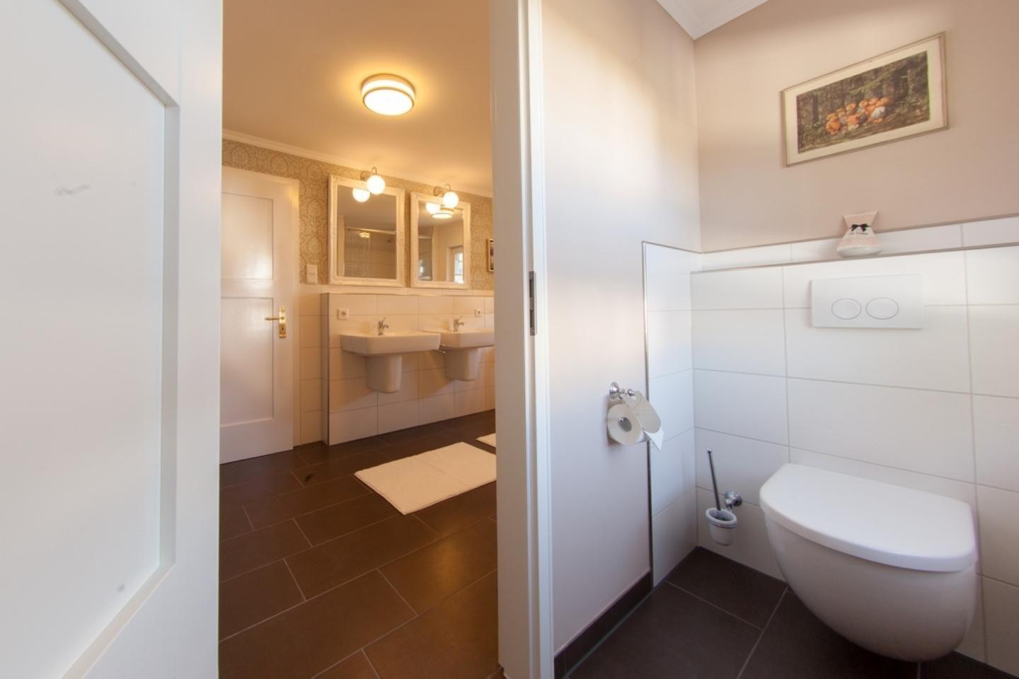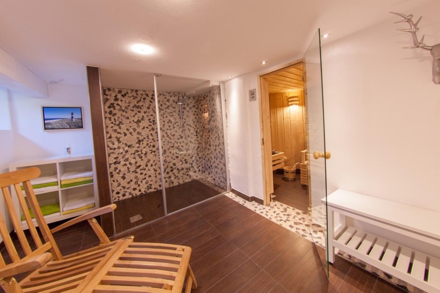 Besonderen Wert legt das Haus auf Ihr Wohlbefinden und Ihre Erholung. Das hauseigene Wellness-Angebot umfasst eine Sauna mit Ruheraum, die ausschließlich zur Eigennutzung zur Verfügung steht. Badezimmer sind sowohl mit Duschen als auch mit einer Badewanne ausgestattet. Handtücher, Badetücher und Bettwäsche sind ebenso vorhanden wie ein Haartrockner und Kosmetikspiegel. Hinzu kommen Waschmaschine, Trockner, Wäscheständer, Bügeleisen und Bügelbrett, sodass auch längere Aufenthalte komfortabel gestaltet werden können.