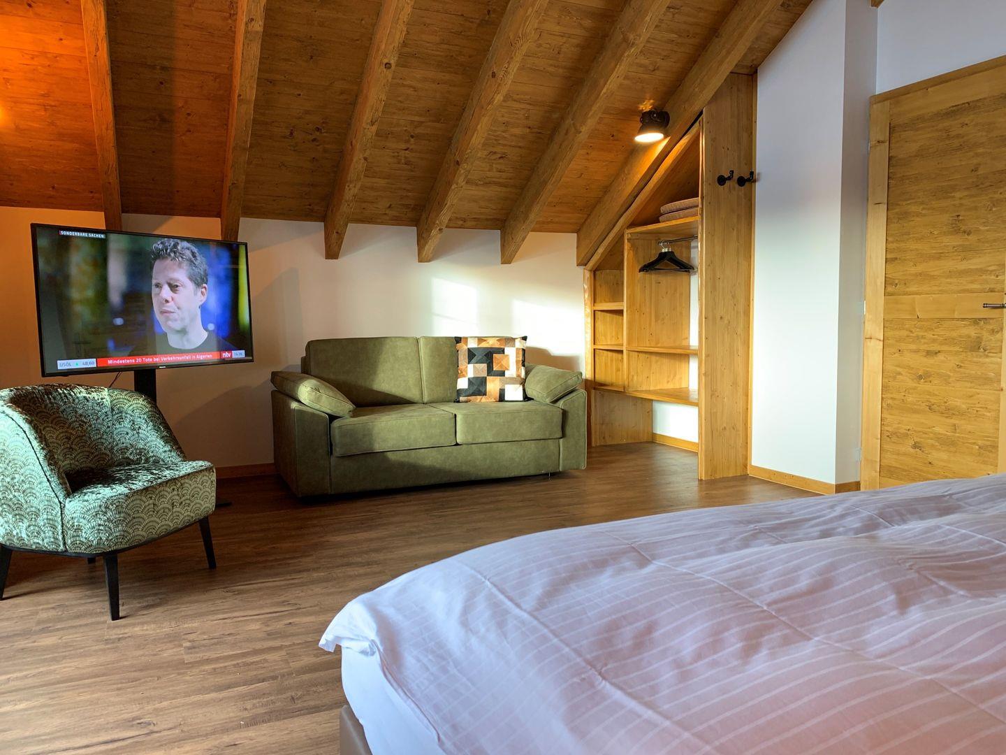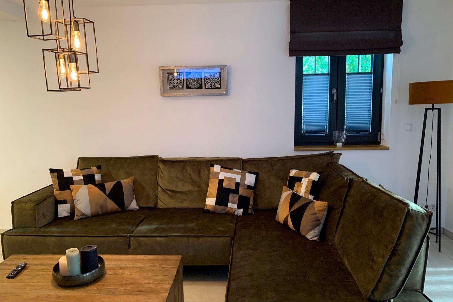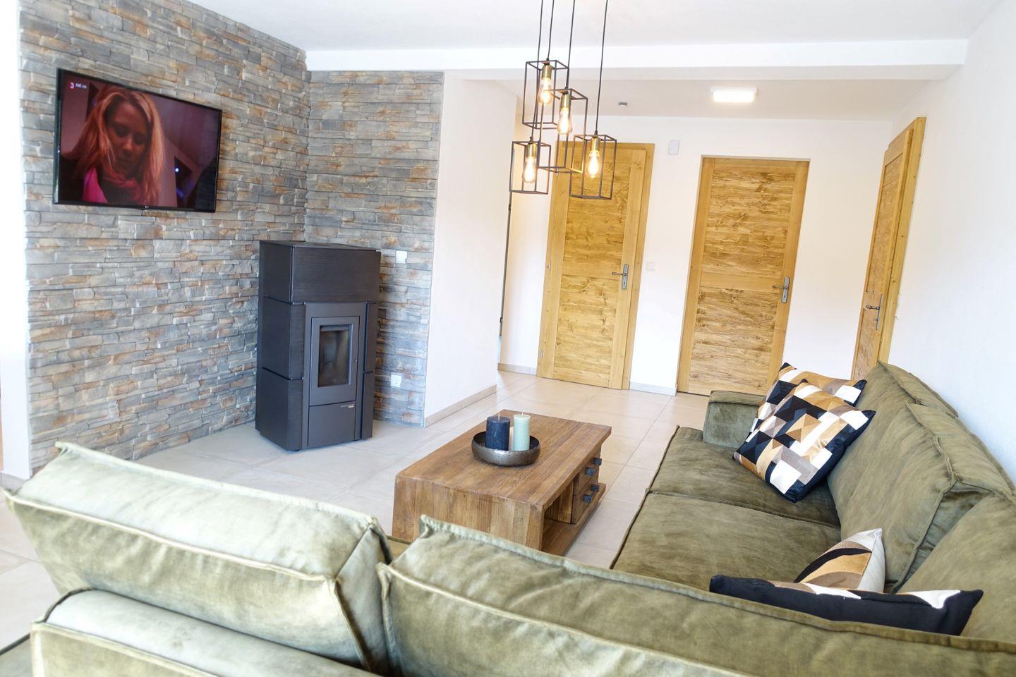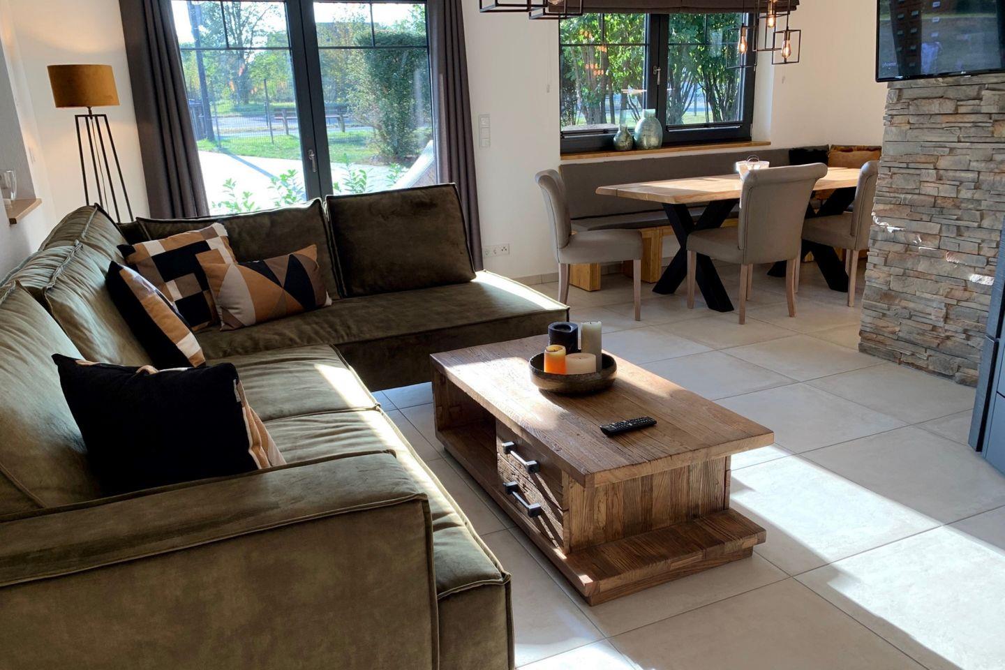 Die exklusive Ausstattung umfasst eine offene, vollständig ausgestattete Küche, die direkt an das großzügige Wohnzimmer angeschlossen ist. Hier finden Sie neben Induktionsherd, Backofen, Mikrowelle, Spülmaschine, Kühlschrank mit Gefrierfach und zahlreichen Küchenutensilien auch eine Kaffeemaschine sowie eine Espressomaschine (Senseo). Geschirr, Besteck, Küchenhandtücher, Eierkocher, Toaster und Wasserkocher sind ebenfalls vorhanden, sodass die Selbstversorgung leicht fällt. In der gemütlichen Sofaecke mit Sessel und Kaminofen können Sie entspannte Abende verbringen, während Ihnen vier moderne Satelliten-TVs (35–44 Zoll) mit internationalen Kanälen, eine HiFi-Anlage, Radio und kostenfreies WLAN mit VDSL-Geschwindigkeit (ab 25 MBit/s) beste Unterhaltung und Komfort bieten.