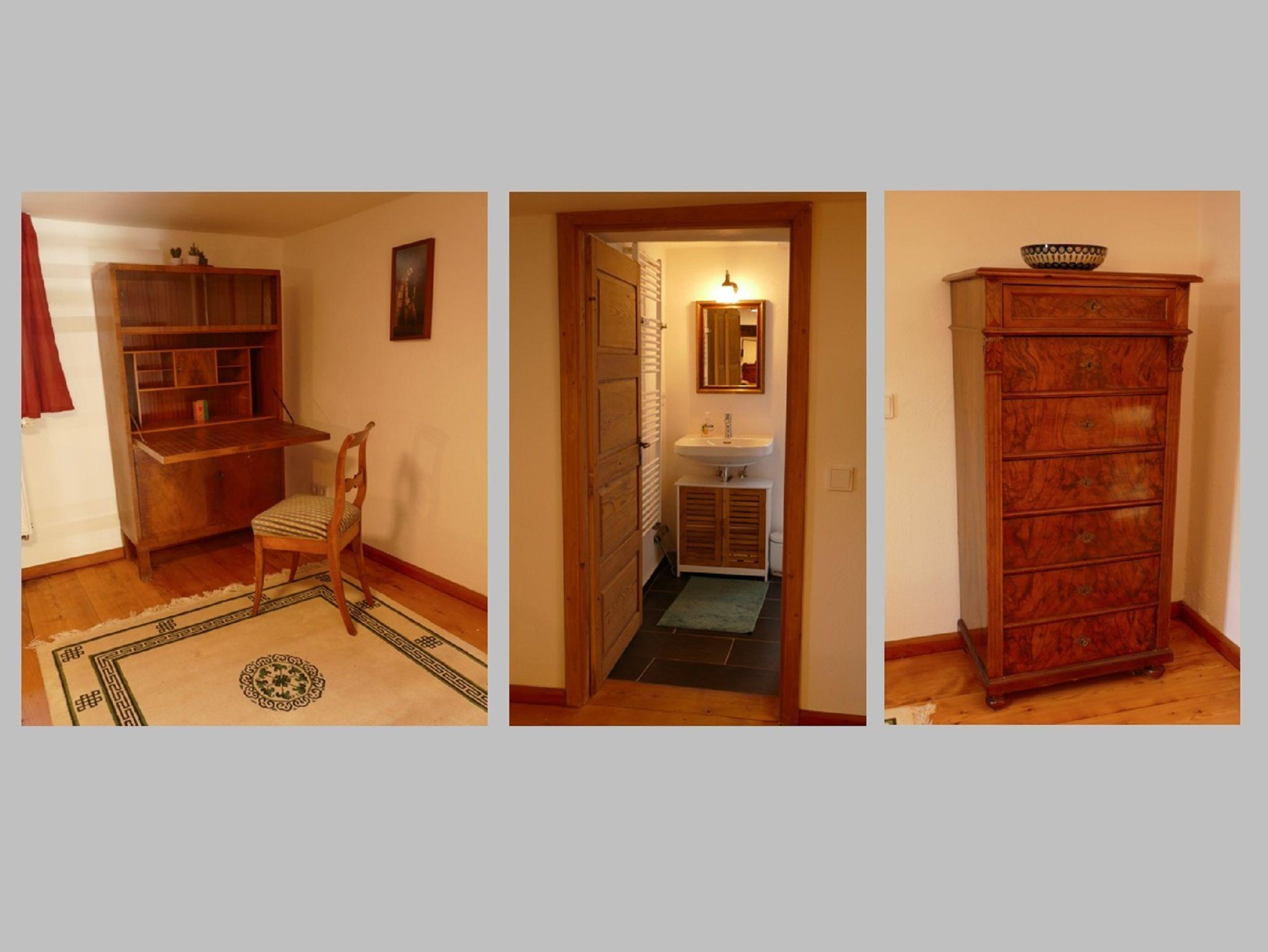 SCHLAFZIMMER: 2 antike Betten, Nachttisch, historischer Sekretär und antike Kommode. Babybett.