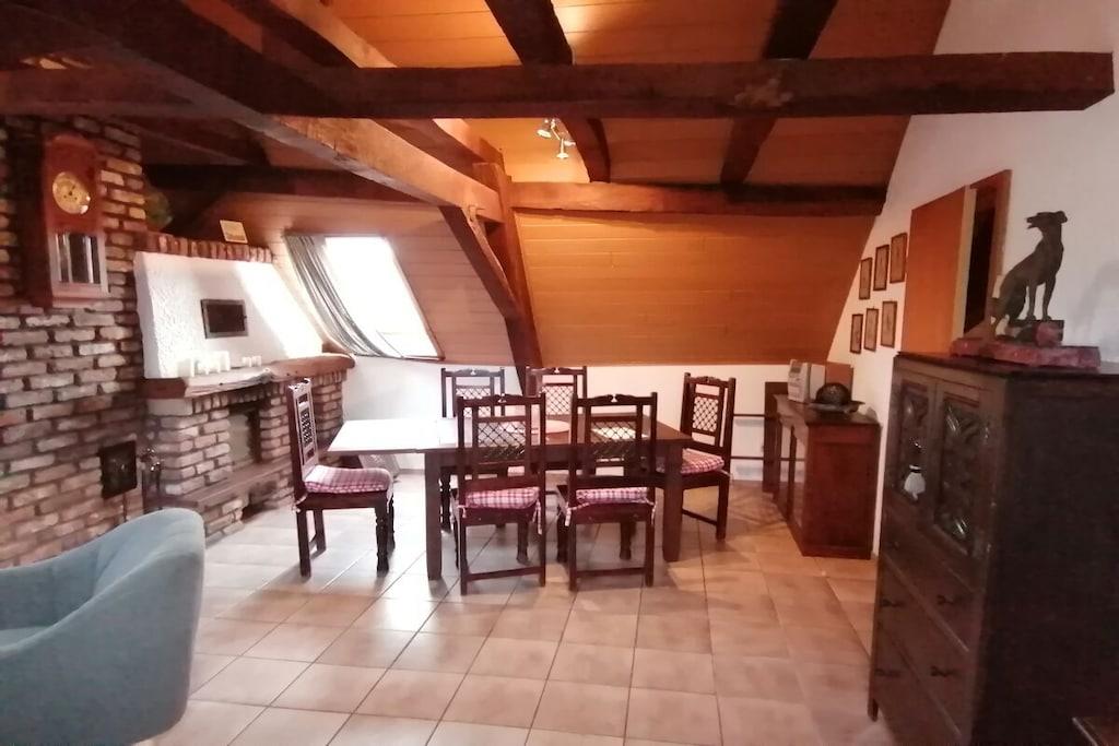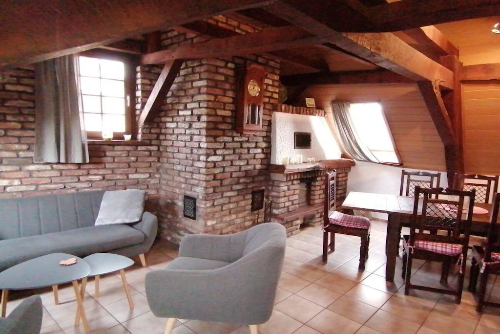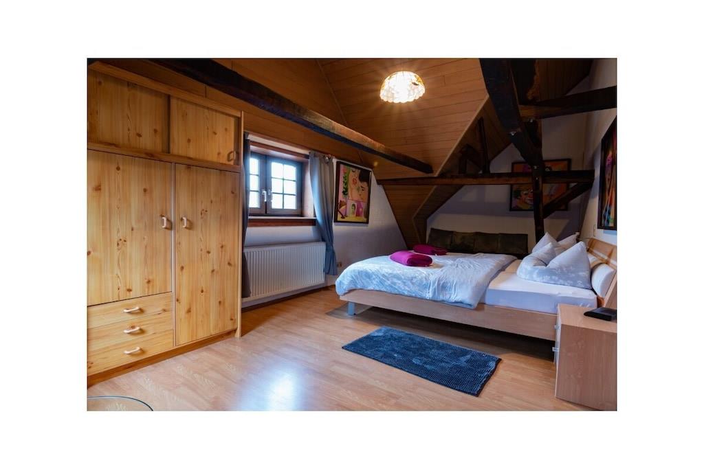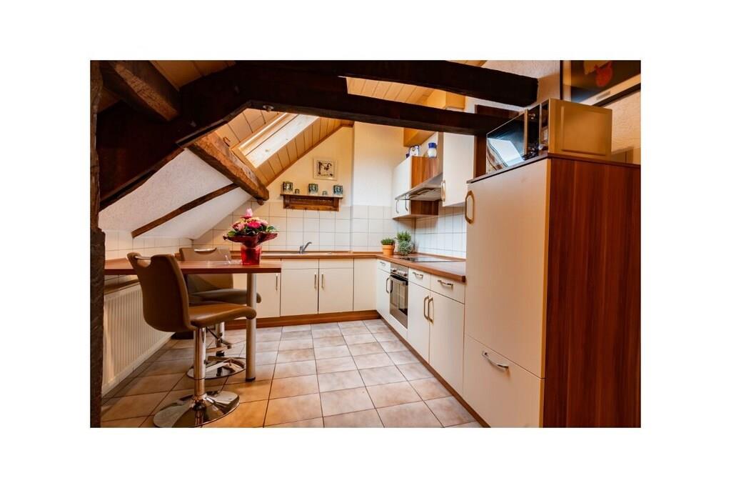 Ihr betretet das Treppenhaus der Ferienwohnung durch einen separater Eingang und gelangt über eine Wendeltreppe in die eigentliche Wohnung. In zwei gemütlichen Schlafzimmern lässt es sich gut schlafen. Euch gemütlich schlafen. Im Badezimmer steht Euch eine Badewanne sowie eine Dusche zur Verfügung. An einen Föhn braucht Ihr nicht zu denken, der liegt hier bereit. Falls Ihr Lust zum kochen habt, steht Euch in der Küche ein Vierplattenherd mit Backofen, Mikrowelle sowie einKühlschrank mit kleinem Gefrierfach zur Verfügung Im Wohn- und Esszimmer könnt Ihr den Tag ausklingen lassen,bei kälteren Temperaturen sogar am Kamin. Ein Unterstellplatz für die Fahrräder befindet sich im Eingang der Ferienwohnung.