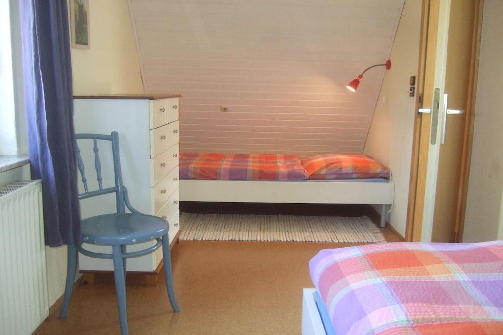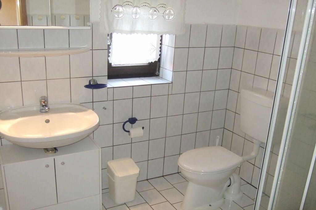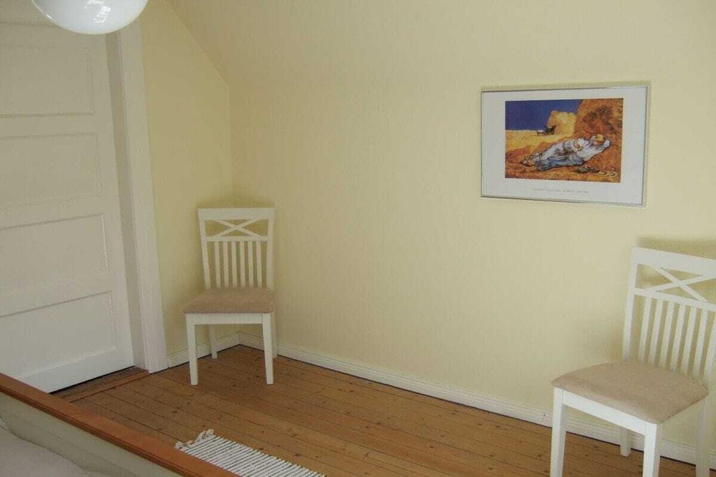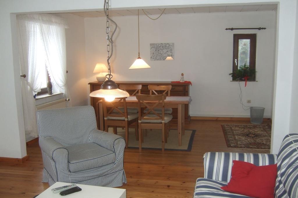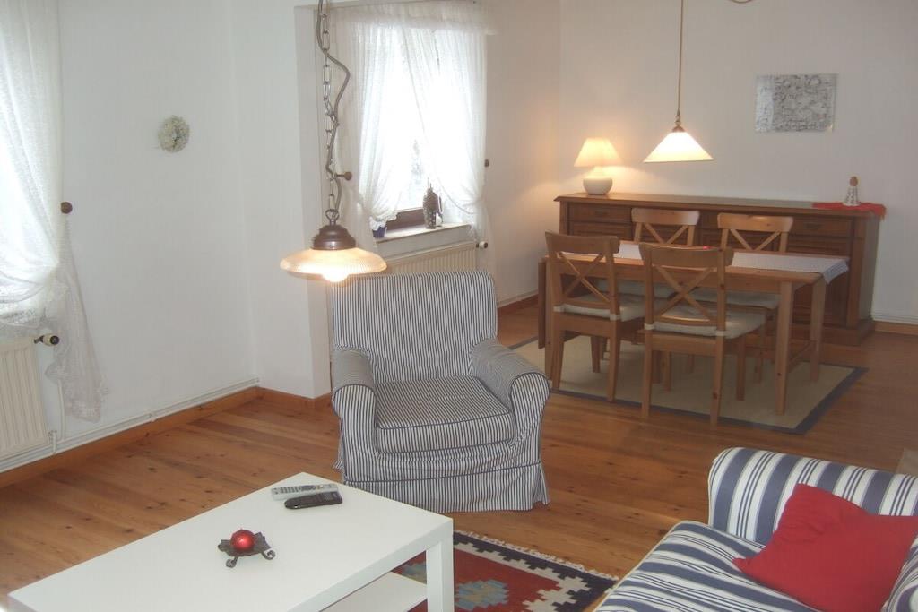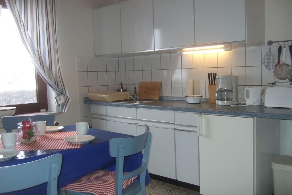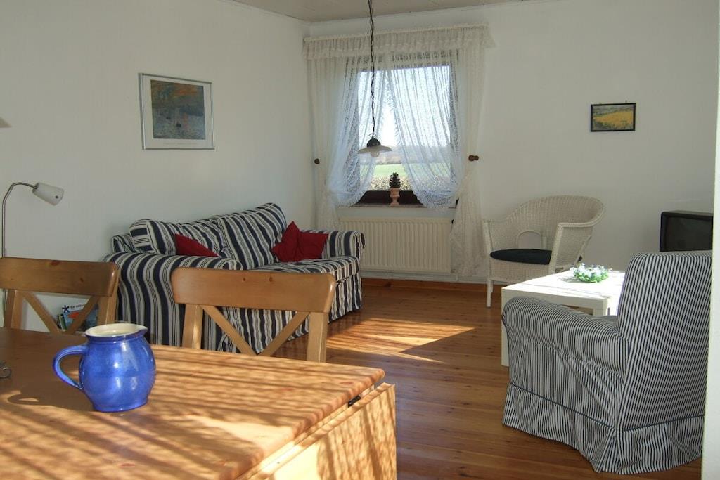 Feriehuset med en lille have og terrasse ligger cirka 200 meter fra vores gård, roligt i udkanten af landsbyen med en smuk udsigt over markerne. Det er cirka 75 kvadratmeter stort og har en stue, 2 soveværelser, et køkken og et badeværelse med bruser. Hvis du har lyst, er du velkommen til at komme til vores gård når som helst for at lege (gynge, vippe, sandkasse, bordtennisbord osv.) og kæle med vores dyr (katte, kaniner, kyllinger, grise).