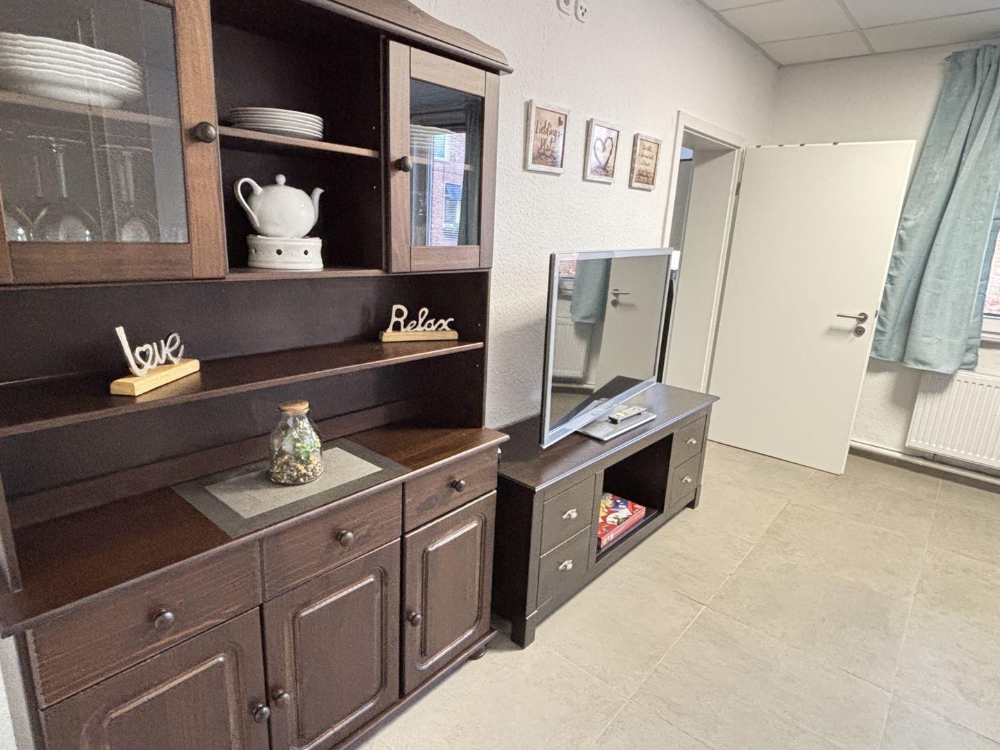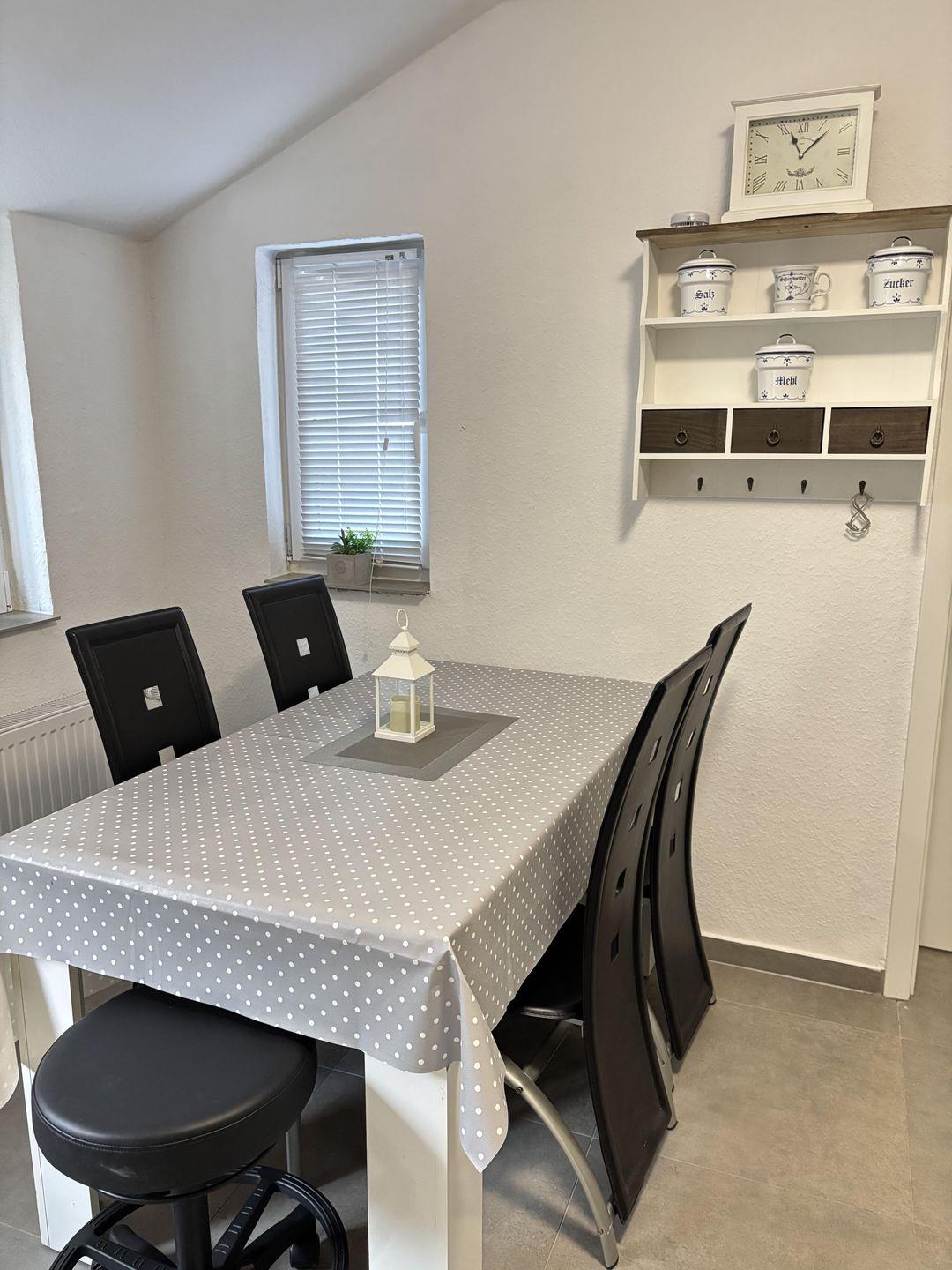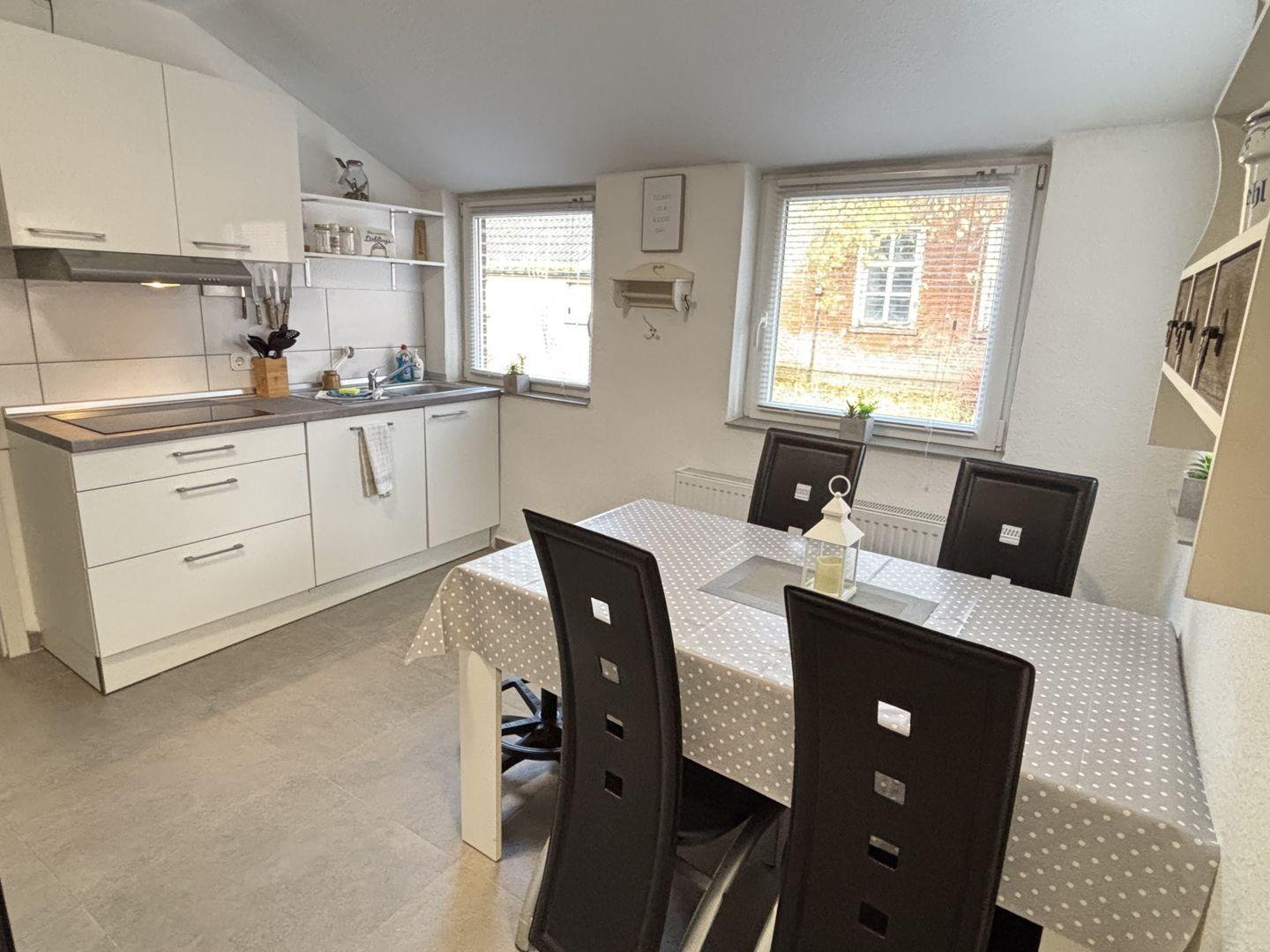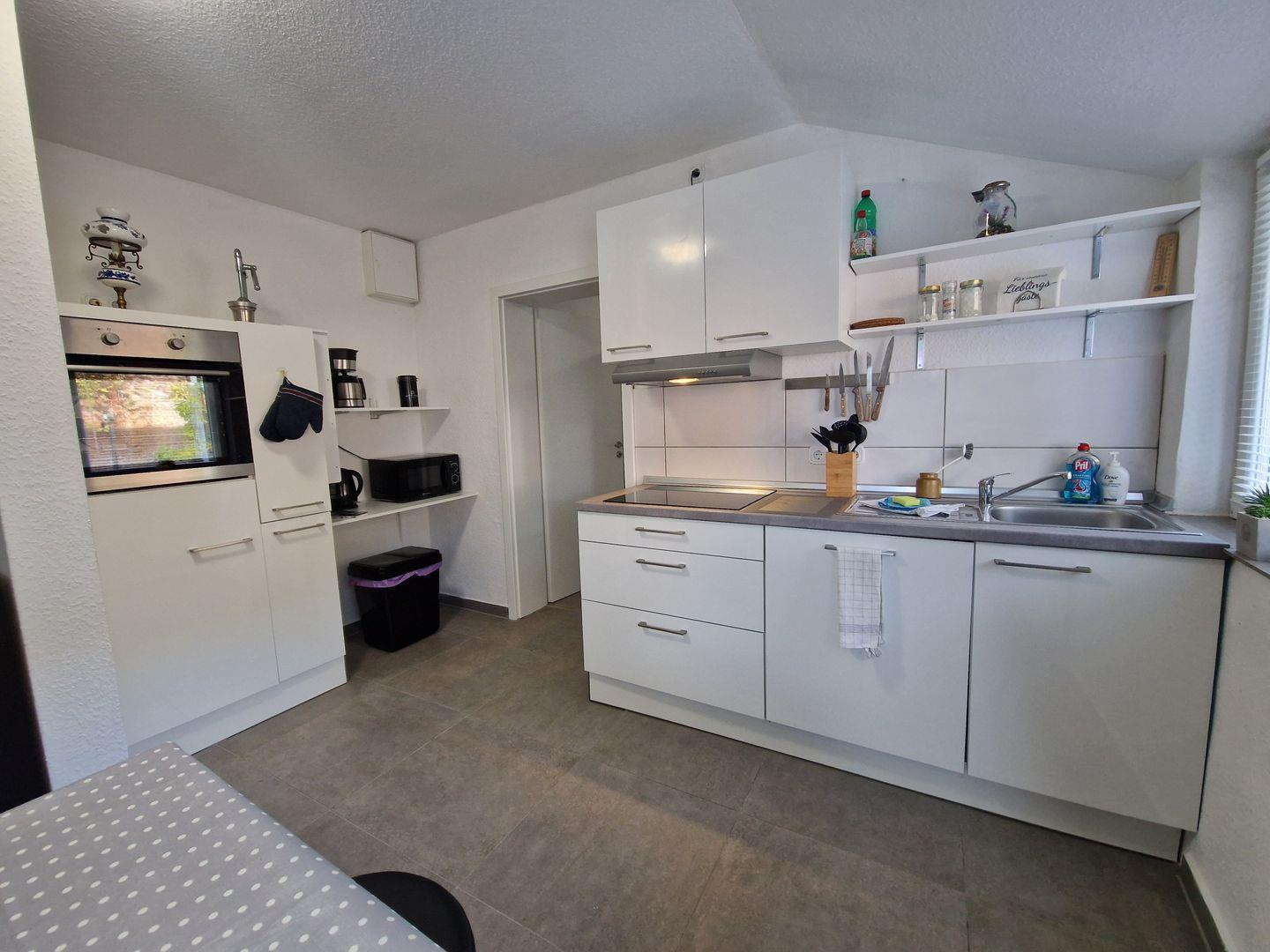 Mit ihren insgesamt fünf Räumen überzeugt die Ferienwohnung durch einen durchdachten Grundriss und eine umfangreiche Ausstattung. Das separate Wohnzimmer mit Sofa, Sessel, Kommode und Fernseher lädt zum Entspannen ein. Der Essbereich, ausgestattet mit Esstisch und Stühlen, befindet sich in der abgeschlossenen Küche, die sämtliche Annehmlichkeiten für die Selbstversorgung bietet: Ein 4-Platten-Elektroherd, Backofen, Mikrowelle, Kühlschrank mit Gefrierfach, Spülmaschine, Kaffeemaschine, Wasserkocher, Toaster sowie umfangreiche Küchenutensilien und Geschirr sind vorhanden. Außerdem stehen Ihnen Gewürze sowie Geschirrhandtücher zur Verfügung.