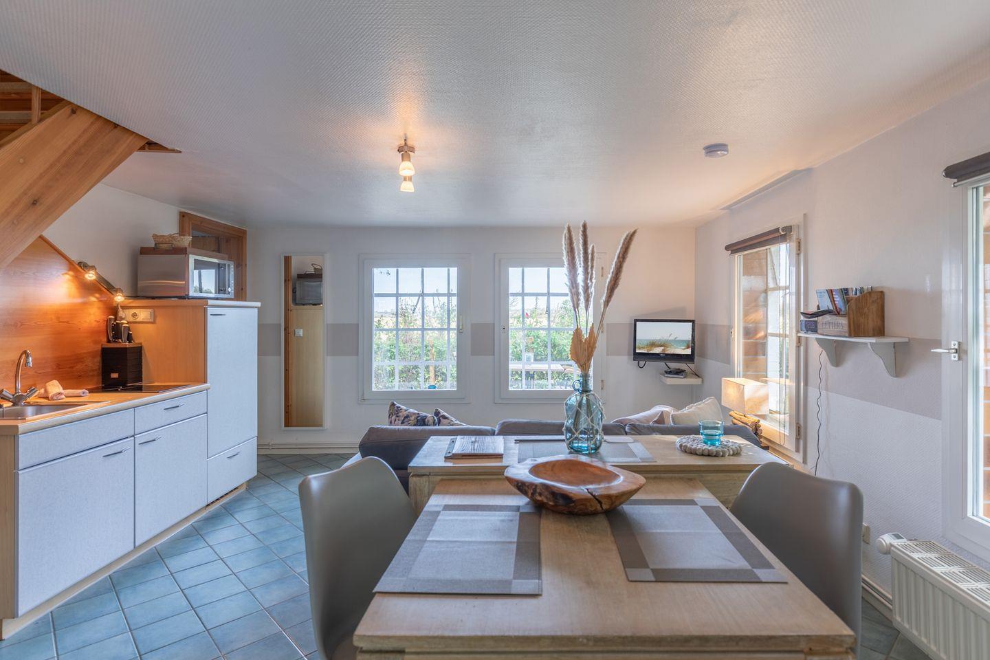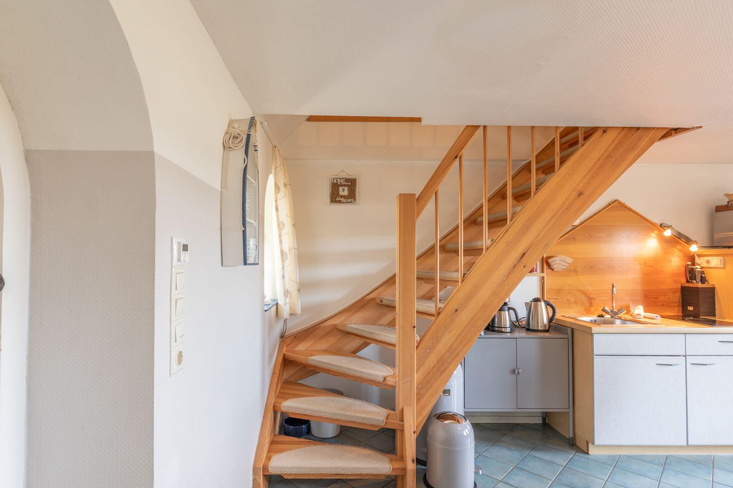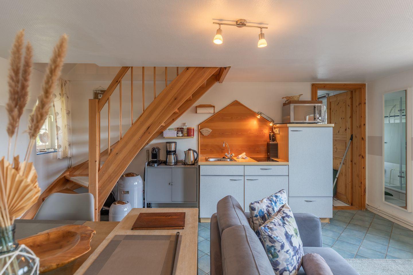 Das Apartment für zwei Personen erstreckt sich über 2 Etagen: im großen Wohnbereich finden Sie eine gemütliche Sitzecke mit Sofa, Flachbildschirm. Die offene Küchenzeile ist mit einem 2-Platten-Herd, einer Mikrowelle, Nespresso Maschine, Kaffeemaschine (Filtergröße 4) ausgestattet. Das Duschbad im Erdgeschoss rundet das Bild ab.