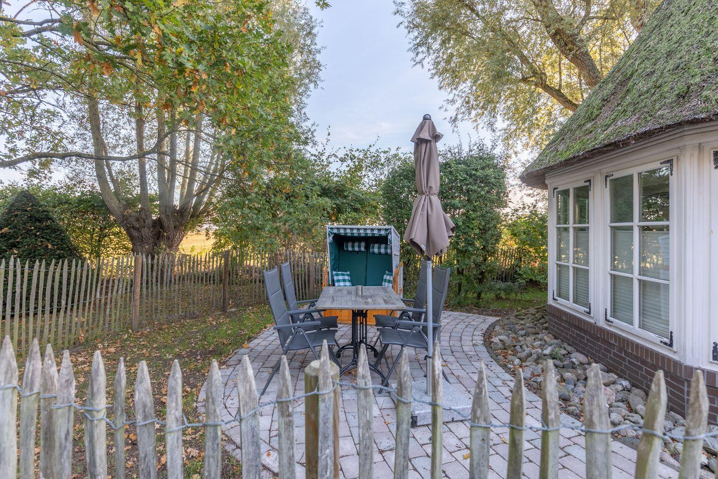 Auf der eingezäunten Terrasse können Sie Ihren Tag gemütlich im Strandkorb ausklingen lassen.