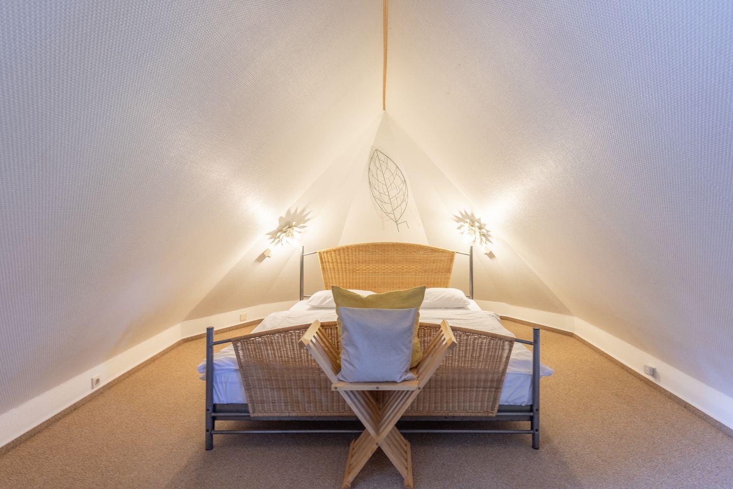 Über eine offene Treppe erreichen Sie das Schlafzimmer im Obergeschoss mit einem Doppelbett (180 x 200).