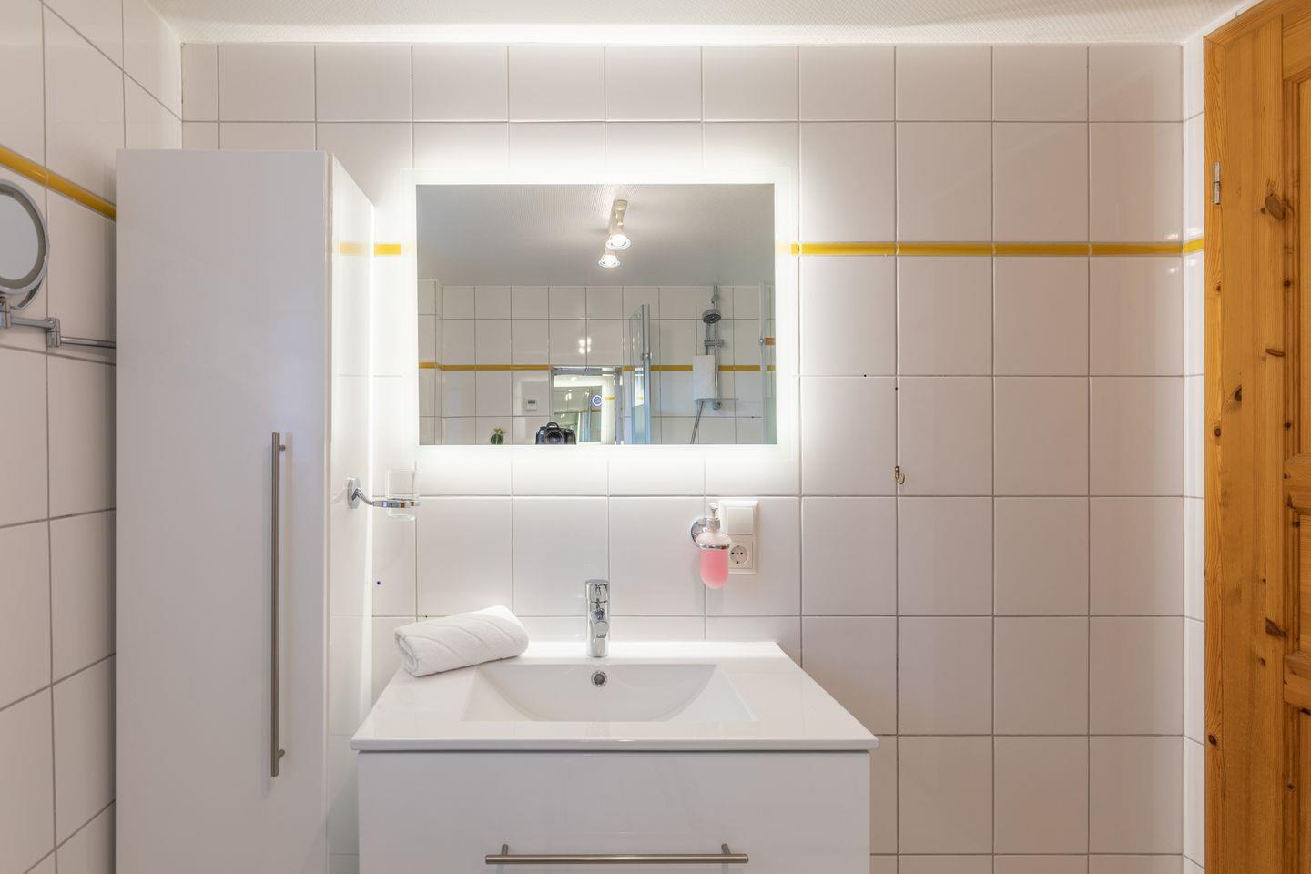 Das Apartment für 2 Personen erstreckt sich über 2 Etagen: im großen Wohnbereich im hellen Wintergarten finden Sie eine gemütliche Sitzecke mit Sofa, Sessel und großem Flachbildschirm. Die separate Küche ist mit einem Herd mit Backofen, einer Mikrowelle, Nespressomaschine, Kaffeemaschine (Filtergröße 4) eingerichtet. Das Duschbad im Erdgeschoss rundet das Bild ab.