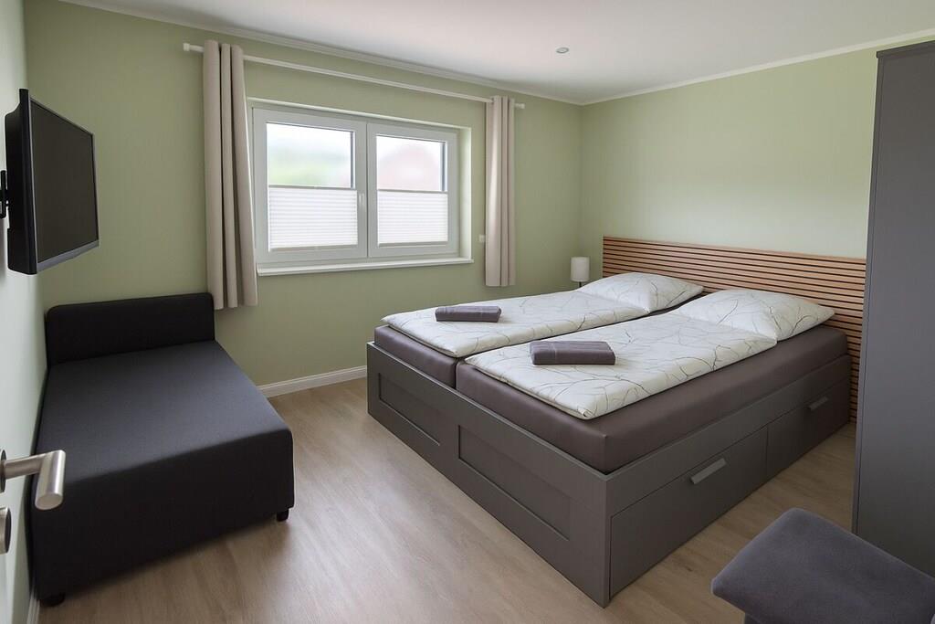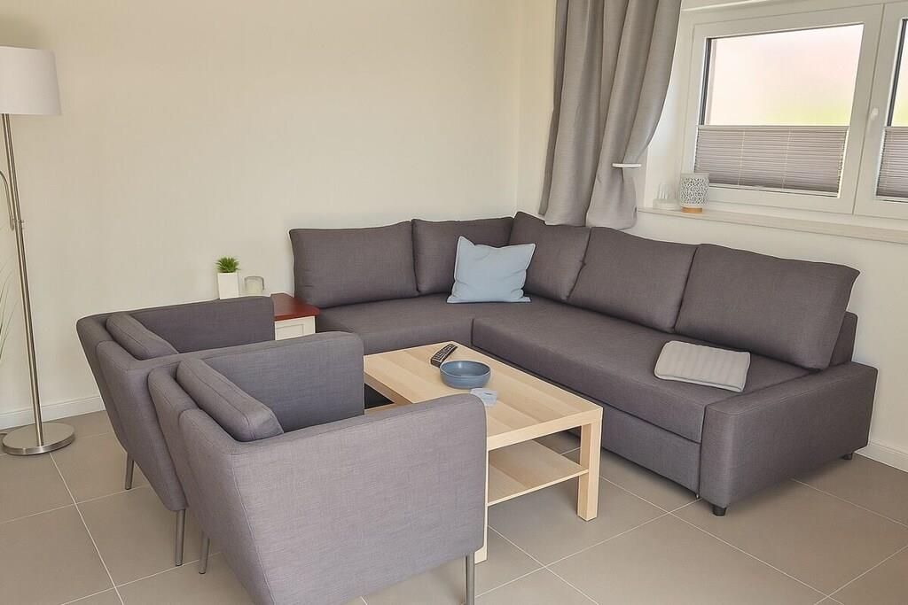 Denne kærligt møblerede lejlighed tilbyder rigelig plads til familier eller små grupper. Den har to separate soveværelser: et med en dobbeltseng og en ekstra sovesofa, og det andet med to enkeltsenge – ideelt til børn. En yderligere sovesofa er tilgængelig i stuen, der komfortabelt rummer op til seks personer. Den rummelige opholdsstue inviterer dig til at slappe af og tilbyder et komfortabelt siddeområde, en spiseplads og adgang til det fuldt udstyrede køkken. Det moderne badeværelse har både bruser og badekar.