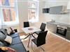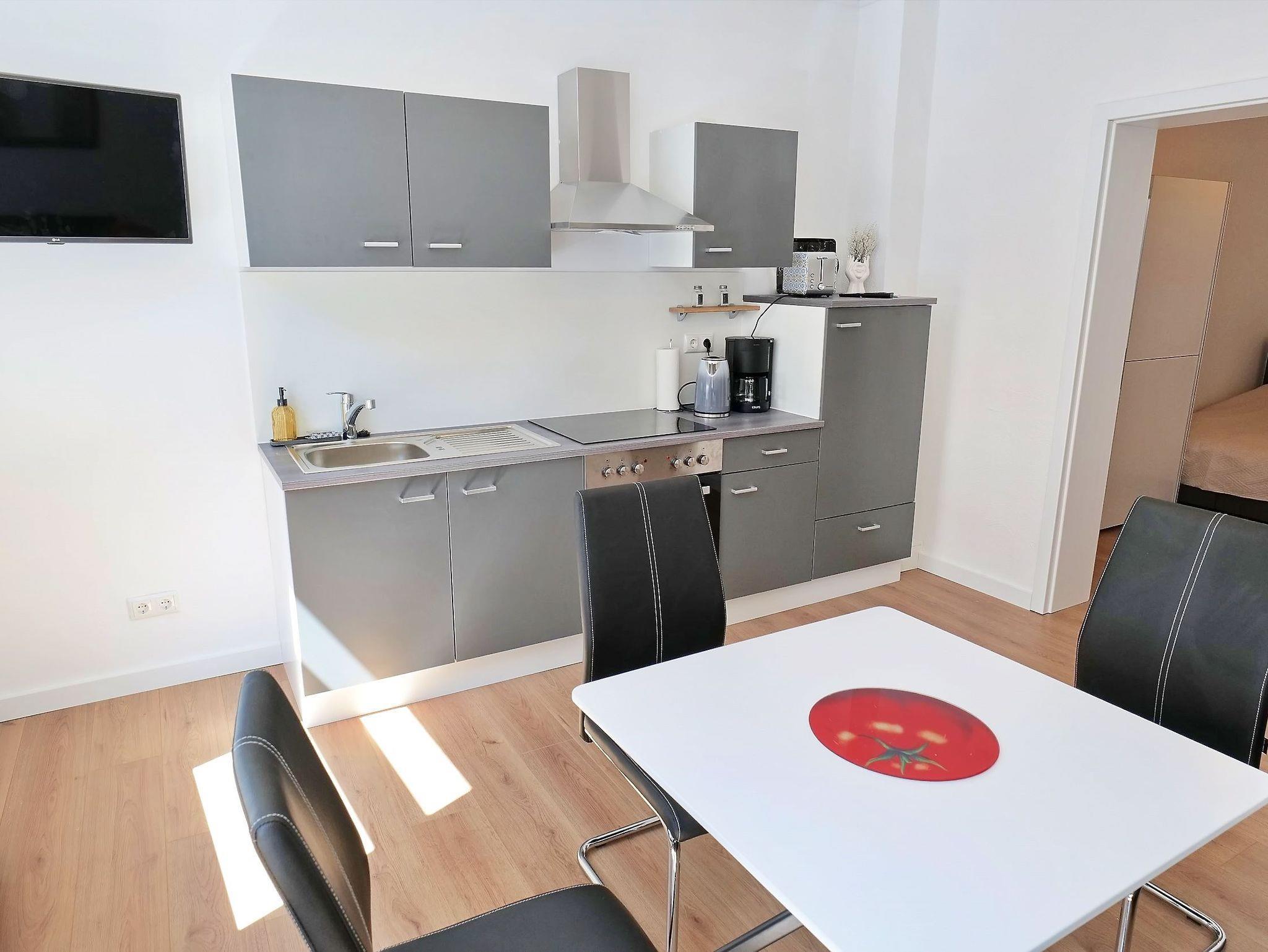 - 1 Wohnzimmer mit offener Küche, Couch, Flat-TV (Fernsehen über Intenet)