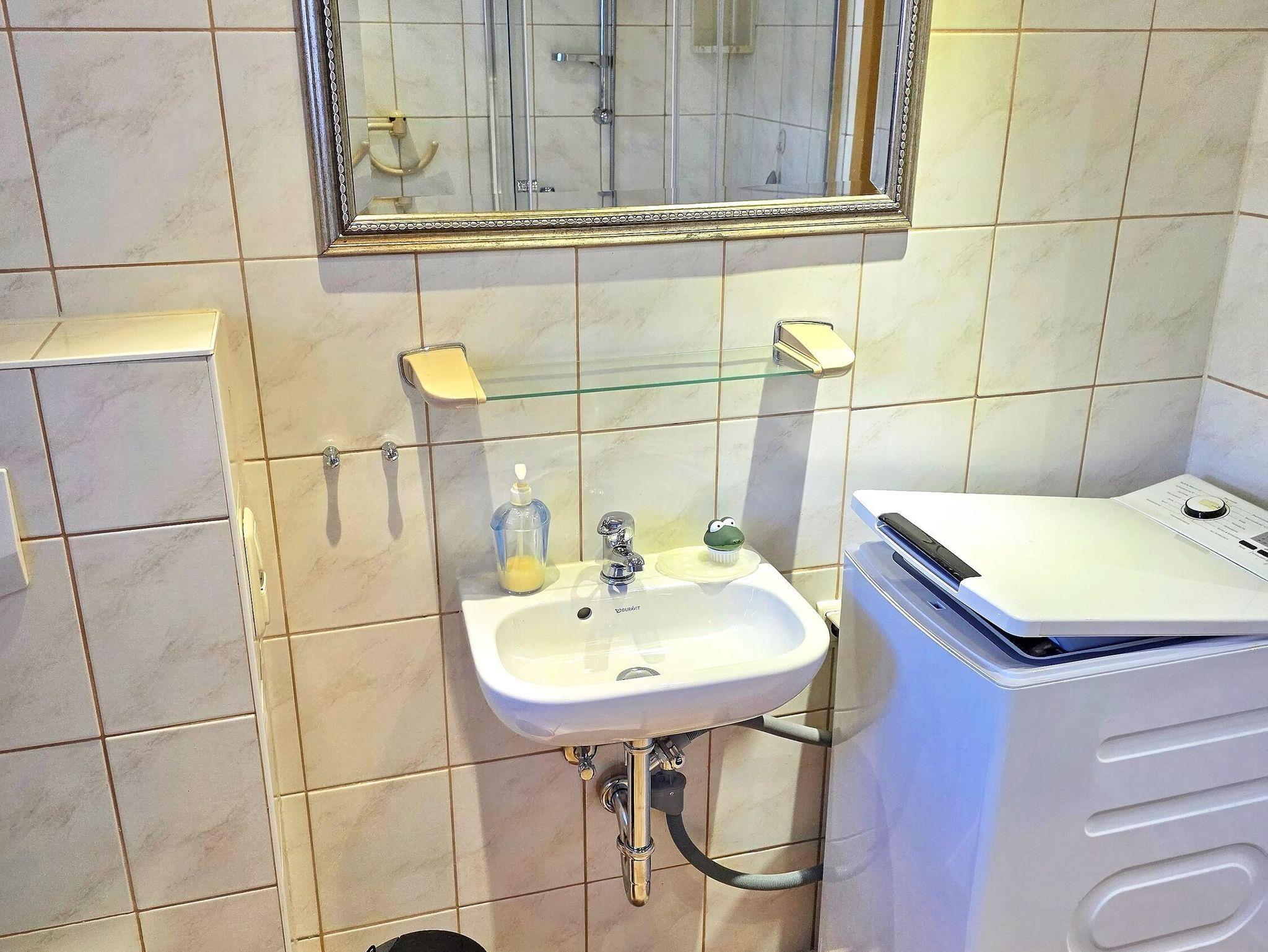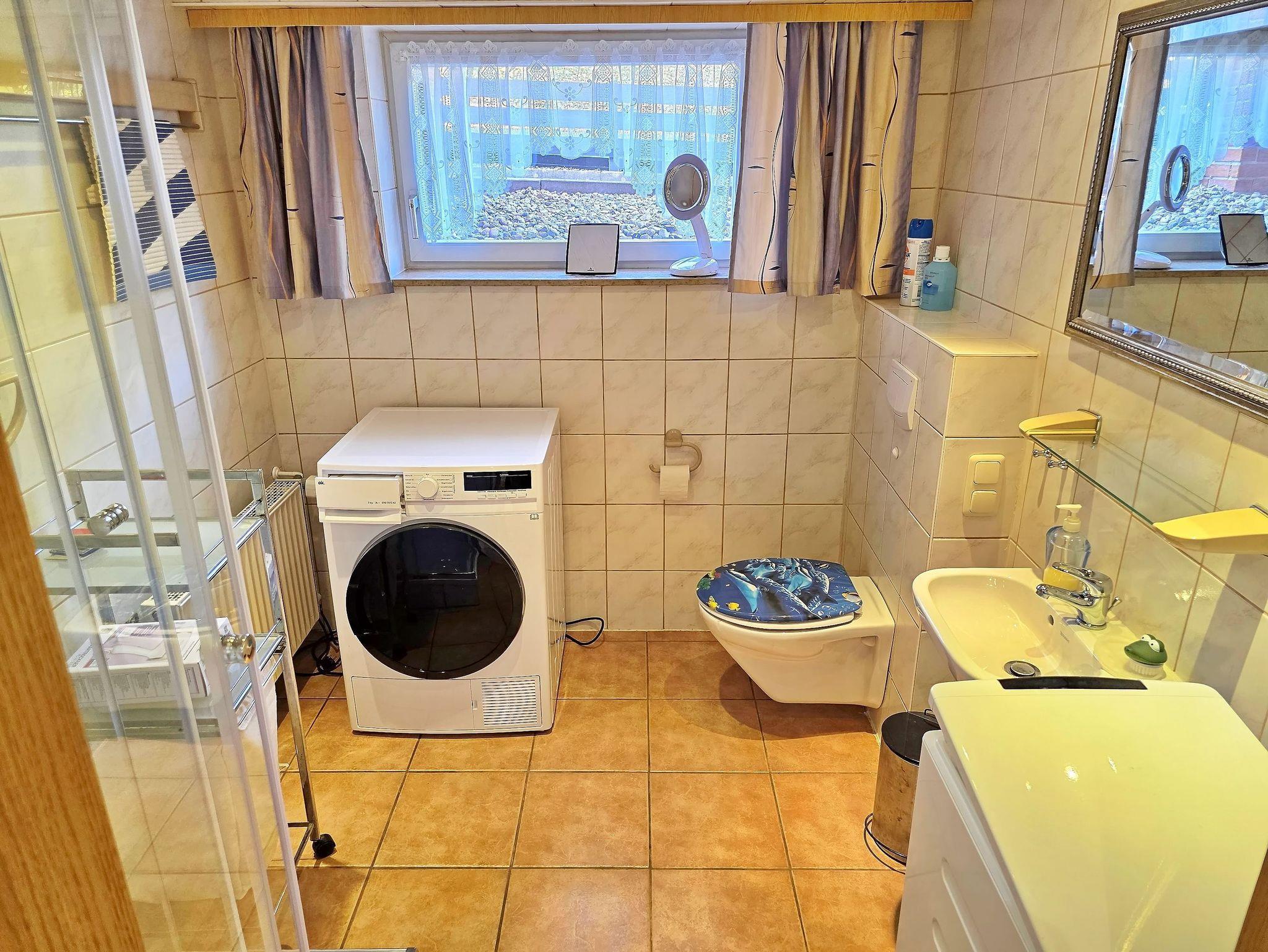 Toilette, Waschbecken und Dusche, Toplader-Waschmaschine für 4 kg Wäsche, Wäschetrockner, Haartrockner