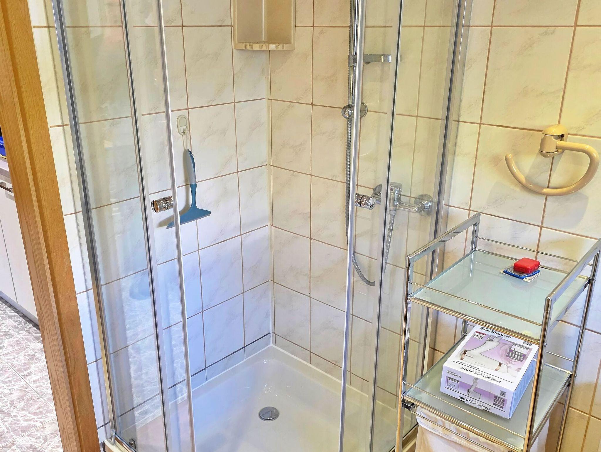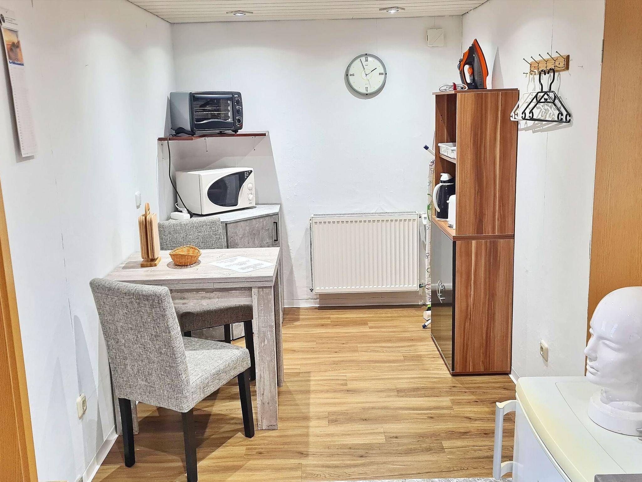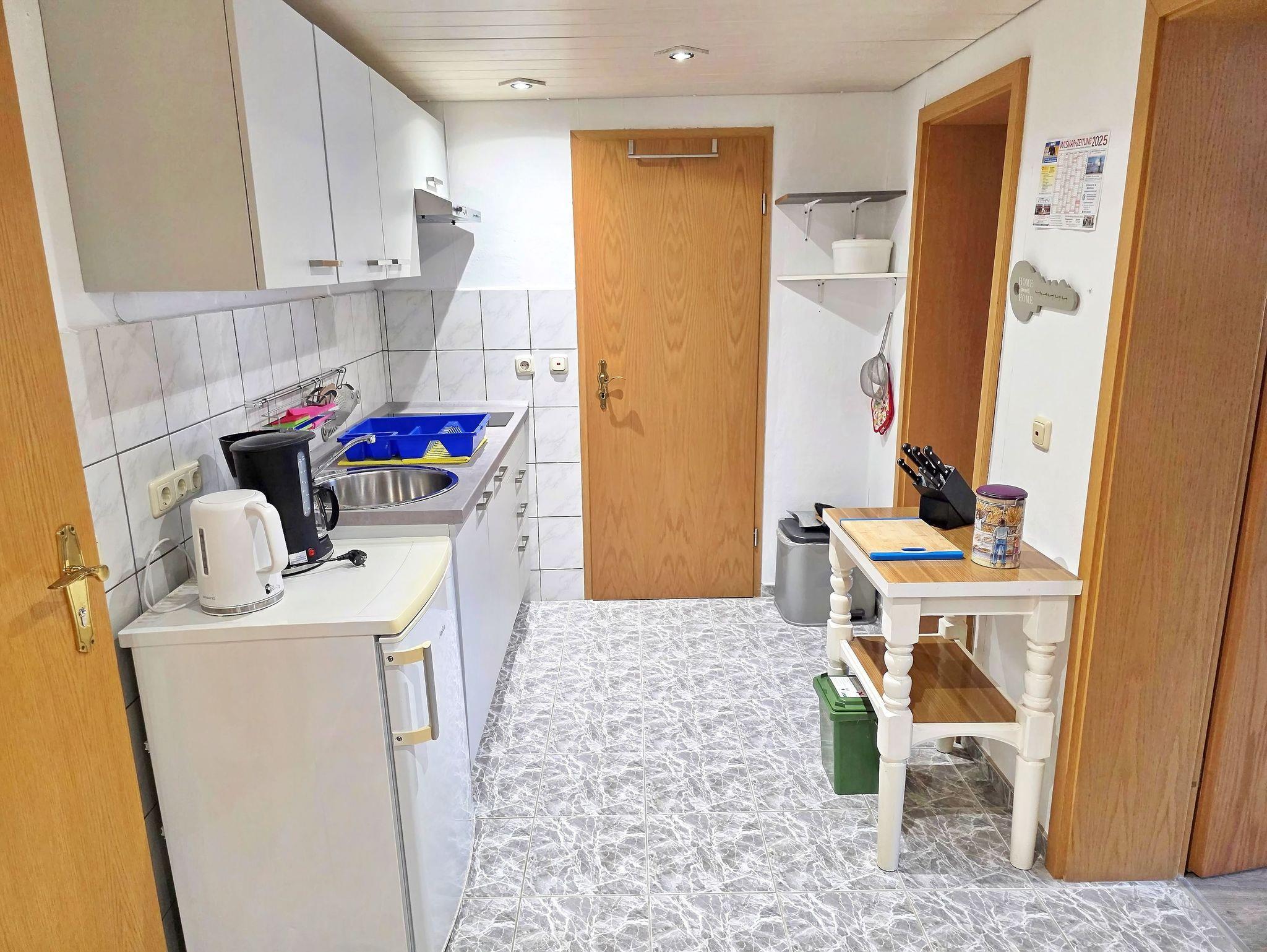 Küchenzeile mit Geschirrspüler, Kühlschrank mit Gefrierfach, Doppelkochfeld, Dunstabzug, Minibackofen, Mikrowelle, Toaster, Kaffeemaschine (Filtergröße 2), Wasserkocher, Stabmixer, Handrührgerät, Waffeleisen, diverse Kochtöpfe und Pfannen, ausreichend Geschirr, Gläser und Besteck, Kochutensilien wie Schneebesen, Pfannenwender, Salatbesteck, Schüsseln, etc. Mülleimer, Handfeger und Kehrblech, sowie Geschirrtücher sind ebenfalls vorhanden. Kleiner Esstisch mit 2 Stühlen, Garderobenhaken, Bügeleisen und Bügelbrett, Staubsauger, Putzeimer, Schrubber, usw.