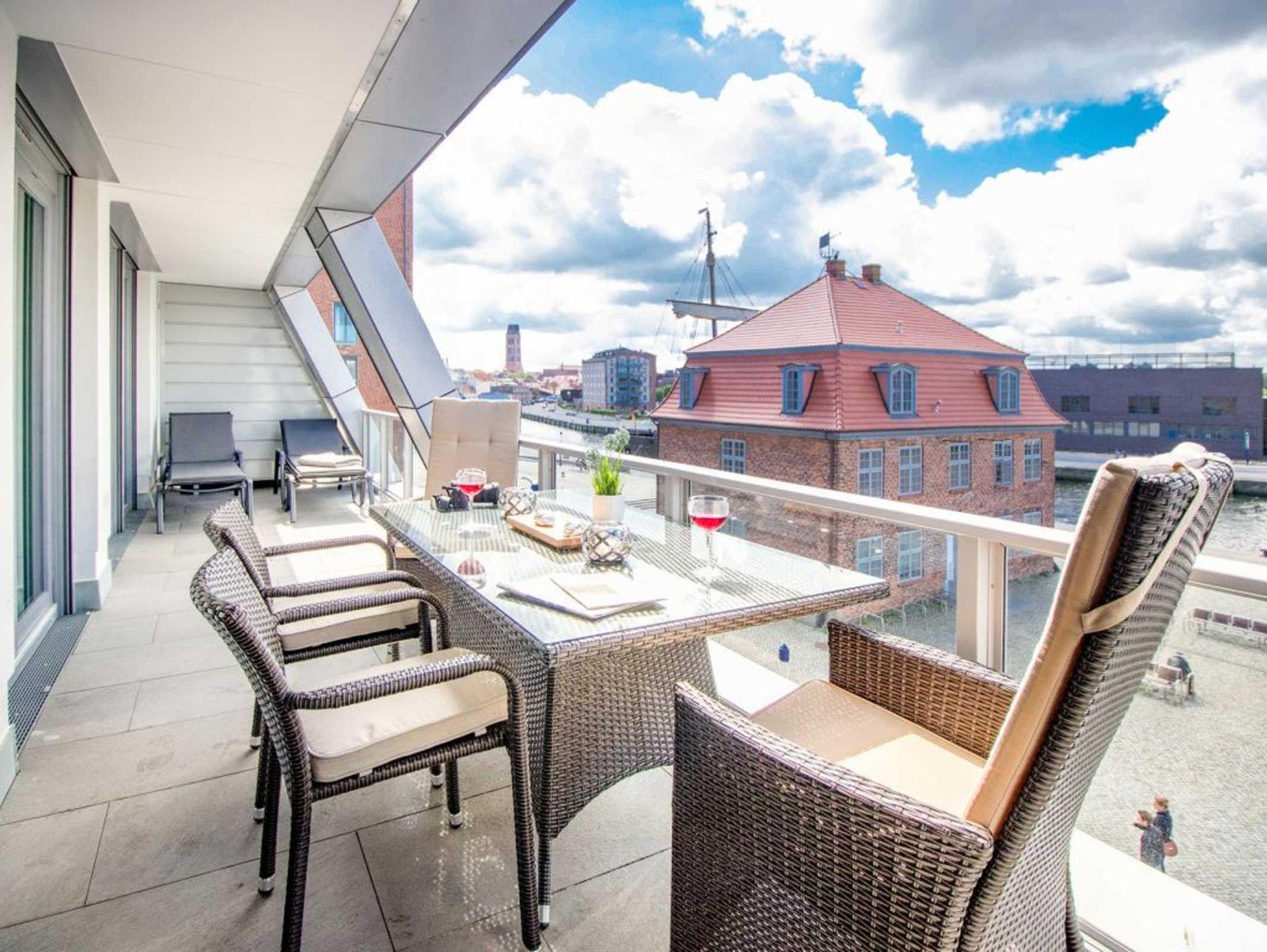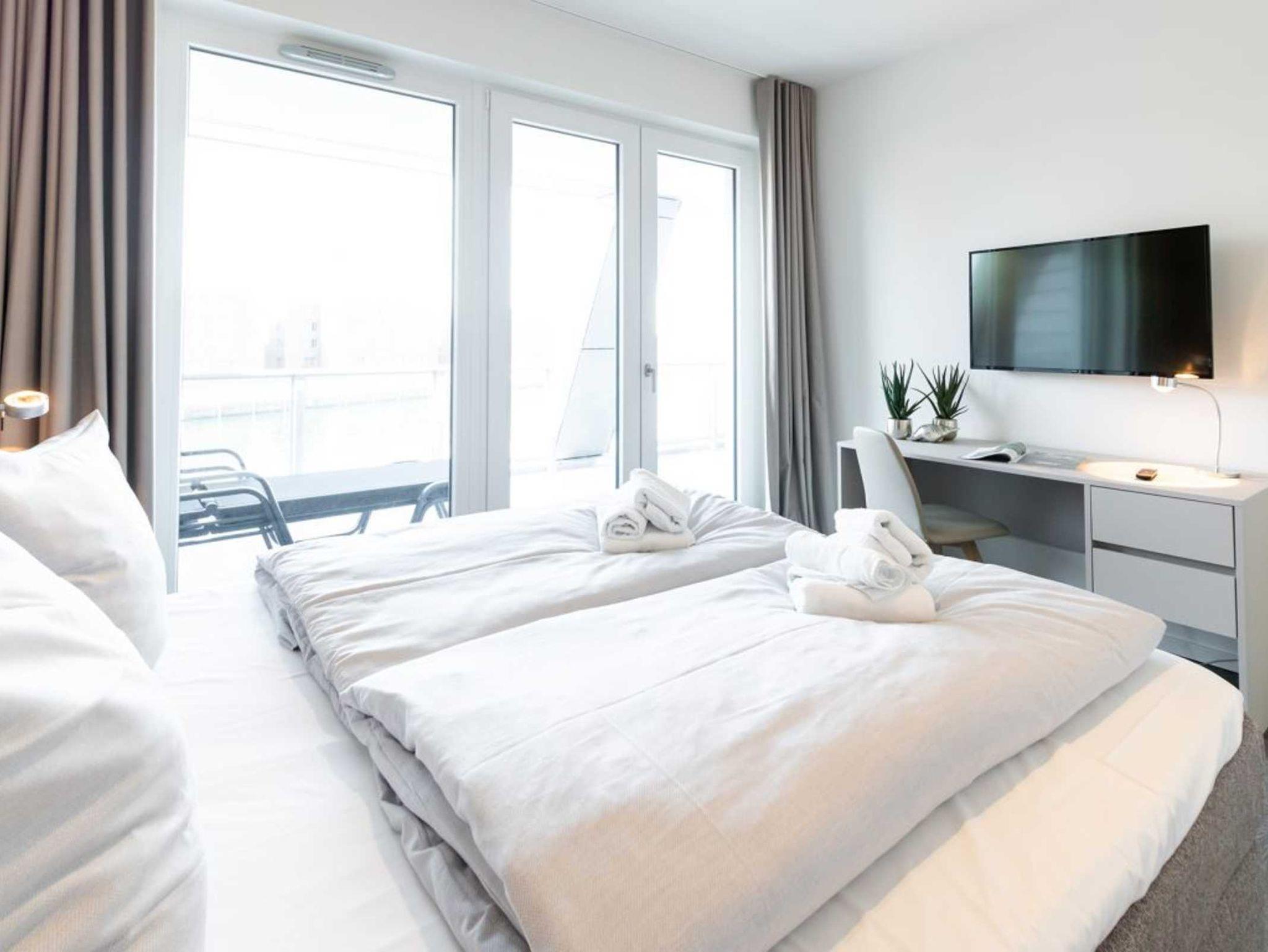 Das Design Ferienappartement Hafenspitze 24 ist eine 2-Zimmer Wohnung mit sonnigem Balkon und Sicht auf den Hafen. Die geräumige Wohnfläche beträgt 65qm. Eine Belegung ist mit maximal 4 Personen möglich. Die Ferienwohnung besitzt eine hochwertige Wohnküche und ist daher auch bestens für Urlauber geeignet, die sich selbst versorgen möchten. Ein separates Schlafzimmer sowie 1 modernes Duschbad gehören sind zugehörig. Bei Anreise mit 2 Personen sind bezogene Betten und Handtücher bereits inklusive. Weitere Wäschepakete erhalten Sie gerne gegen Gebühr. Es handelt sich um eine Wohnung für Nichtraucher. Parkmöglichkeiten gegen Gebühr ermöglicht das Parkhaus am Alten Hafen in 300 Meter.