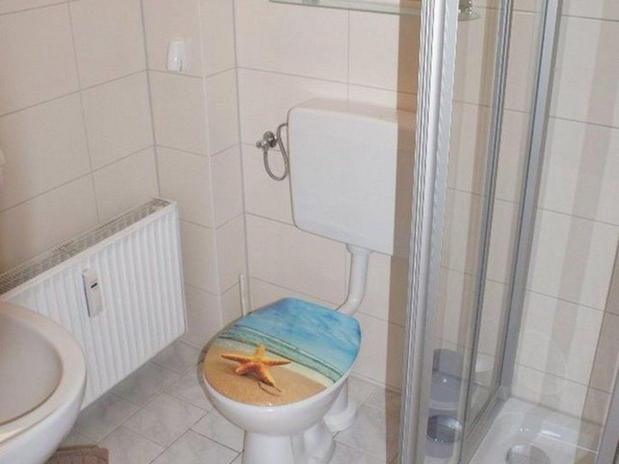 - Badezimmer mit Dusche, Waschbecken, Spiegel und WC