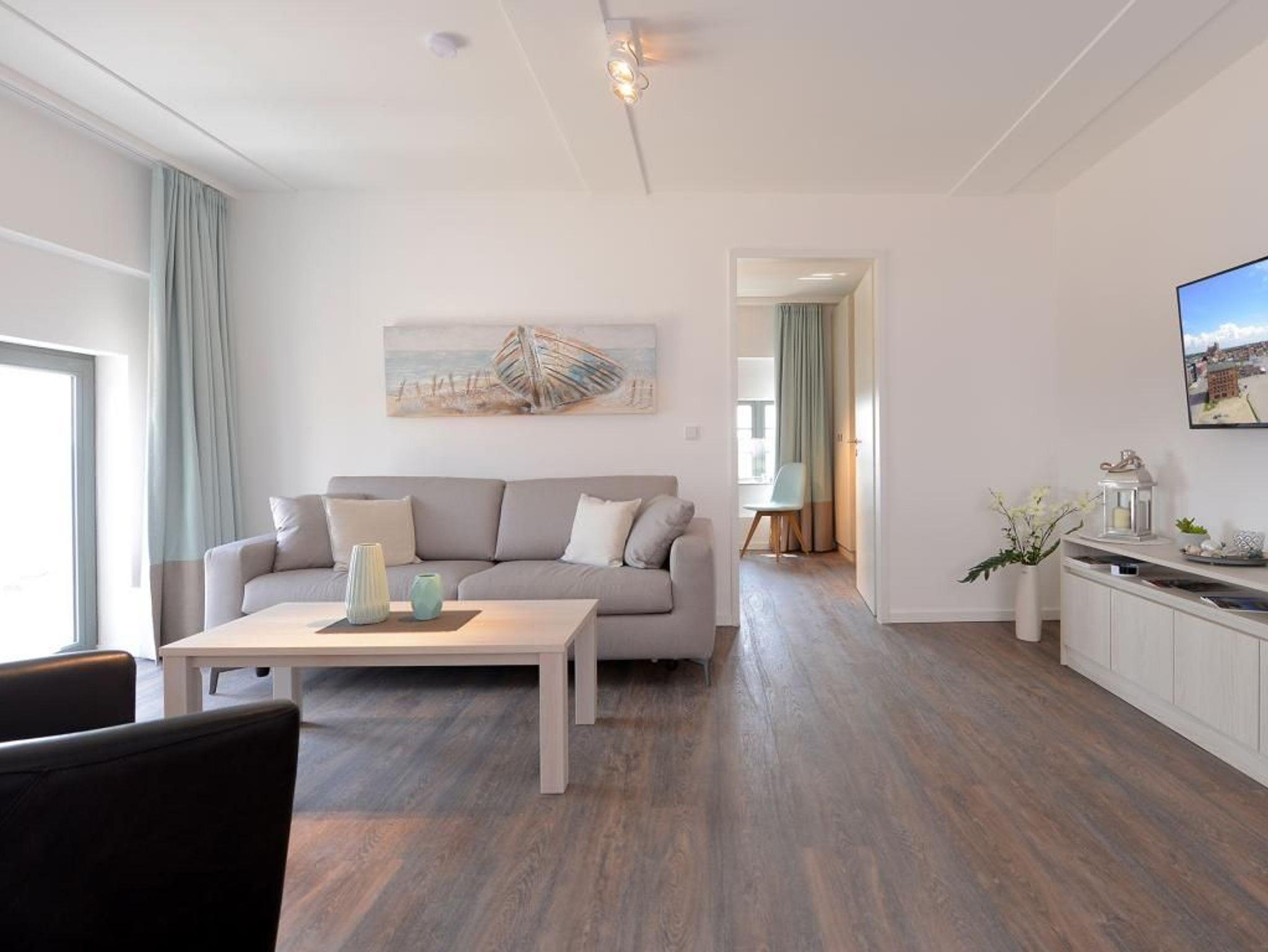 separatem Schlafzimmer mit Doppelbett. Ein gemütliches Sofa und ein Flachbild- TV laden