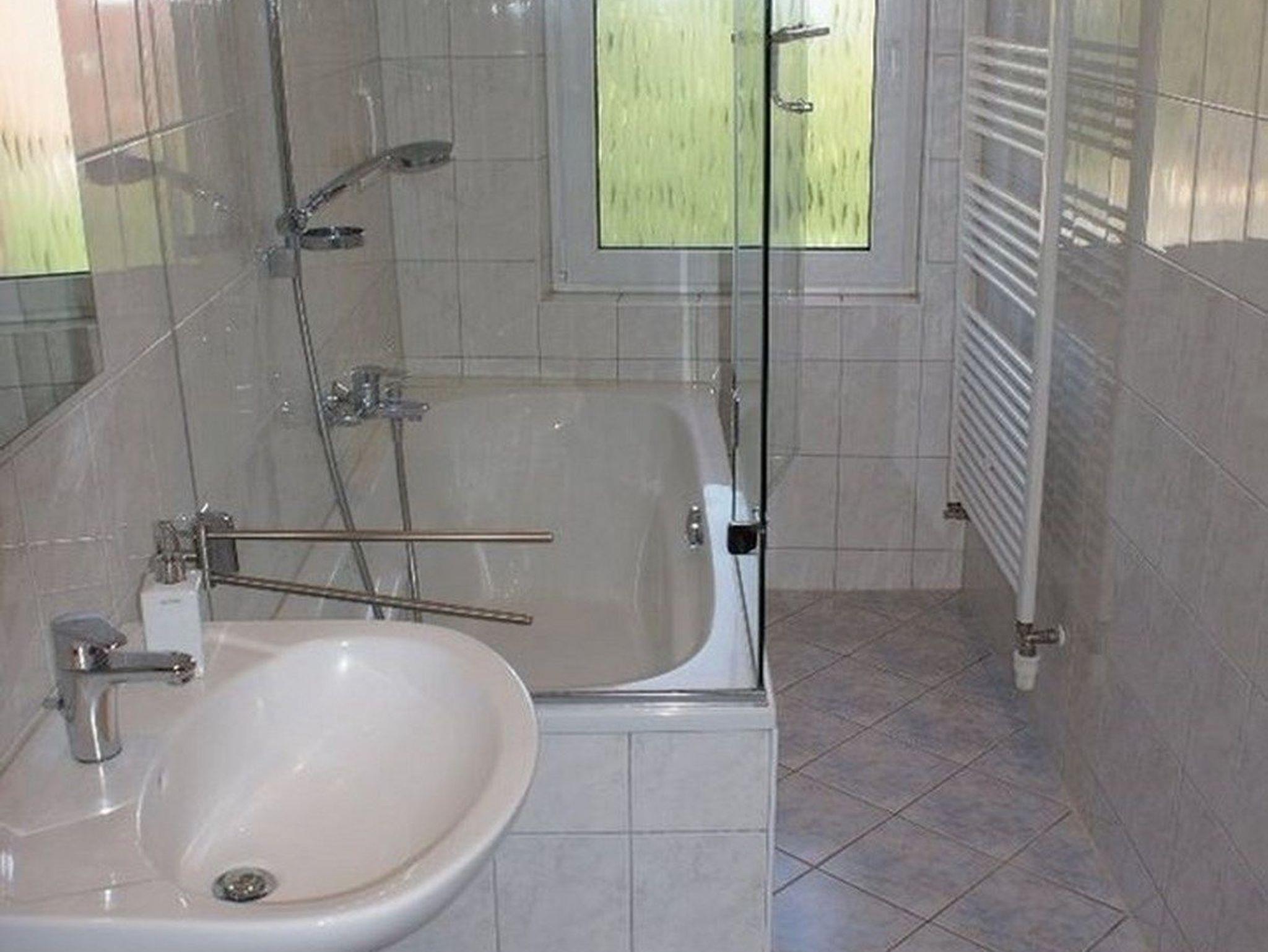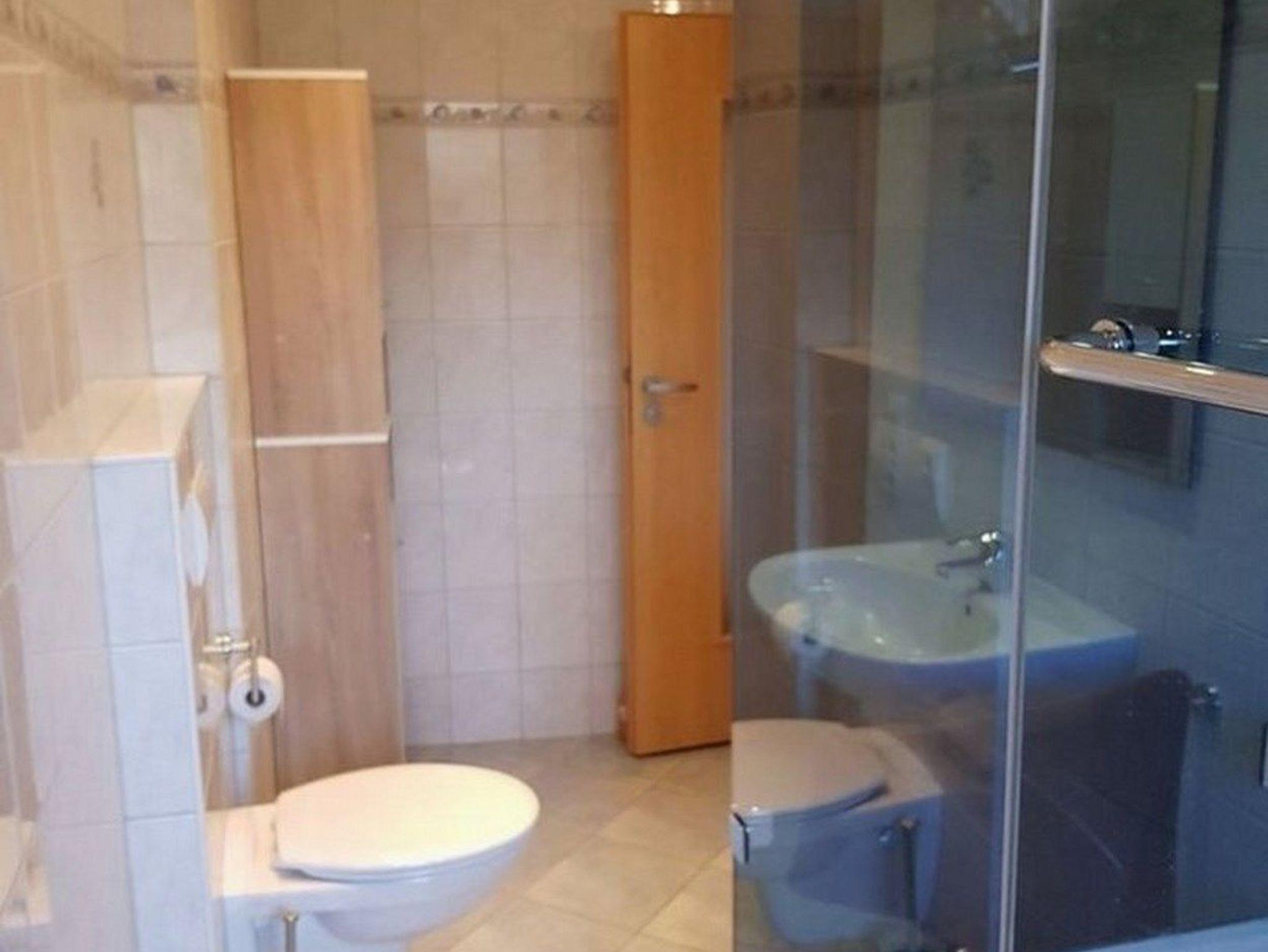 - Badezimmer mit Badewanne (Duschfunktion), WC, Spiegel