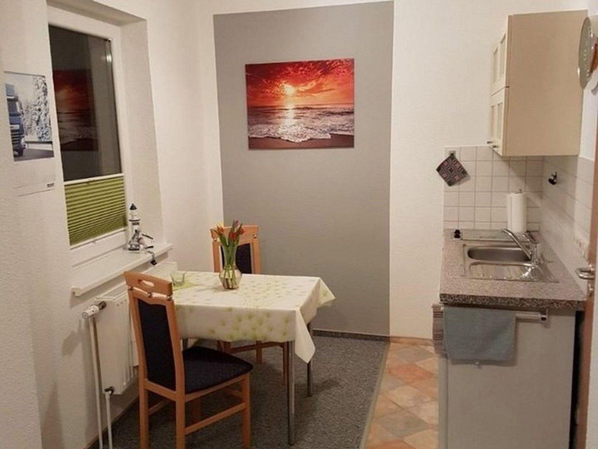 - Pantryküche mit Kühlschrank, 2-Plattenceranfeld-Herd, Kaffeemaschine, Toaster und Geschirr für 2 Personen, kleine Essecke mit Ausblick auf den Hofgarten.