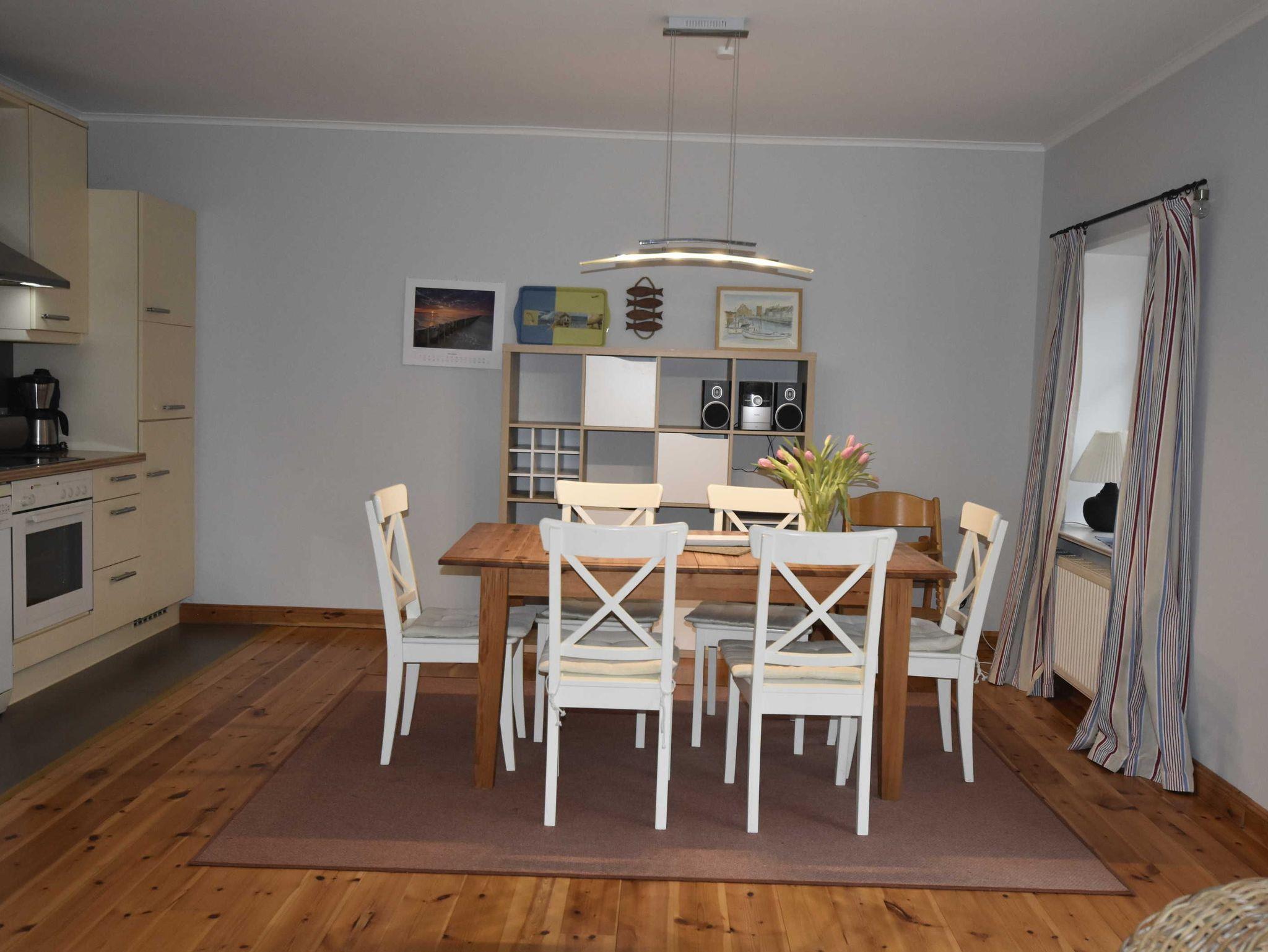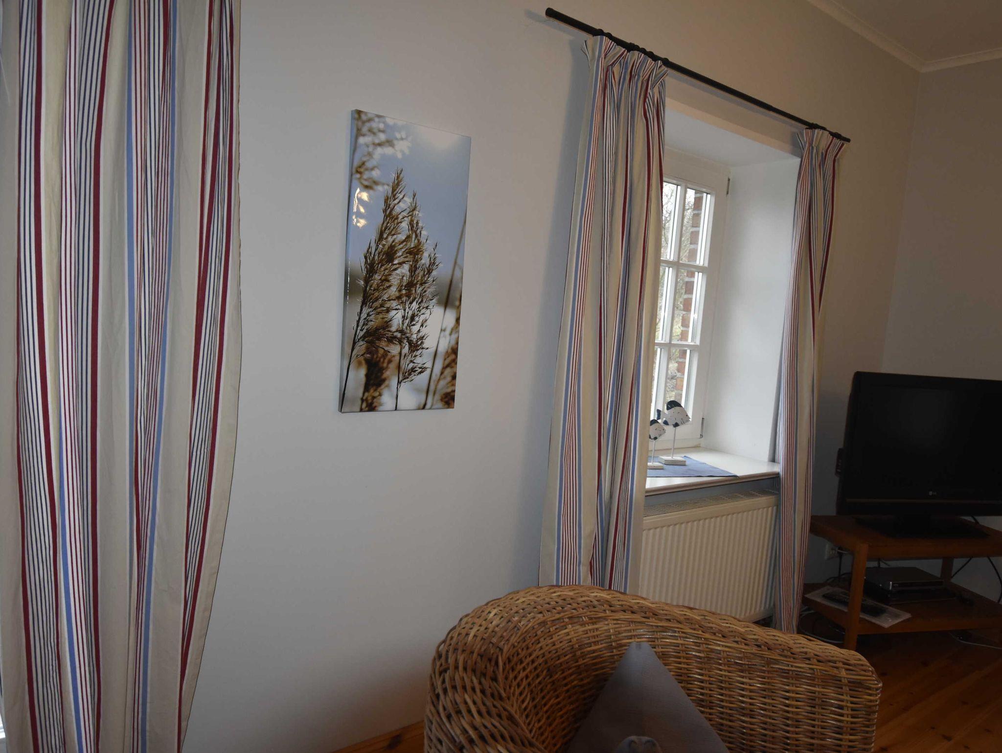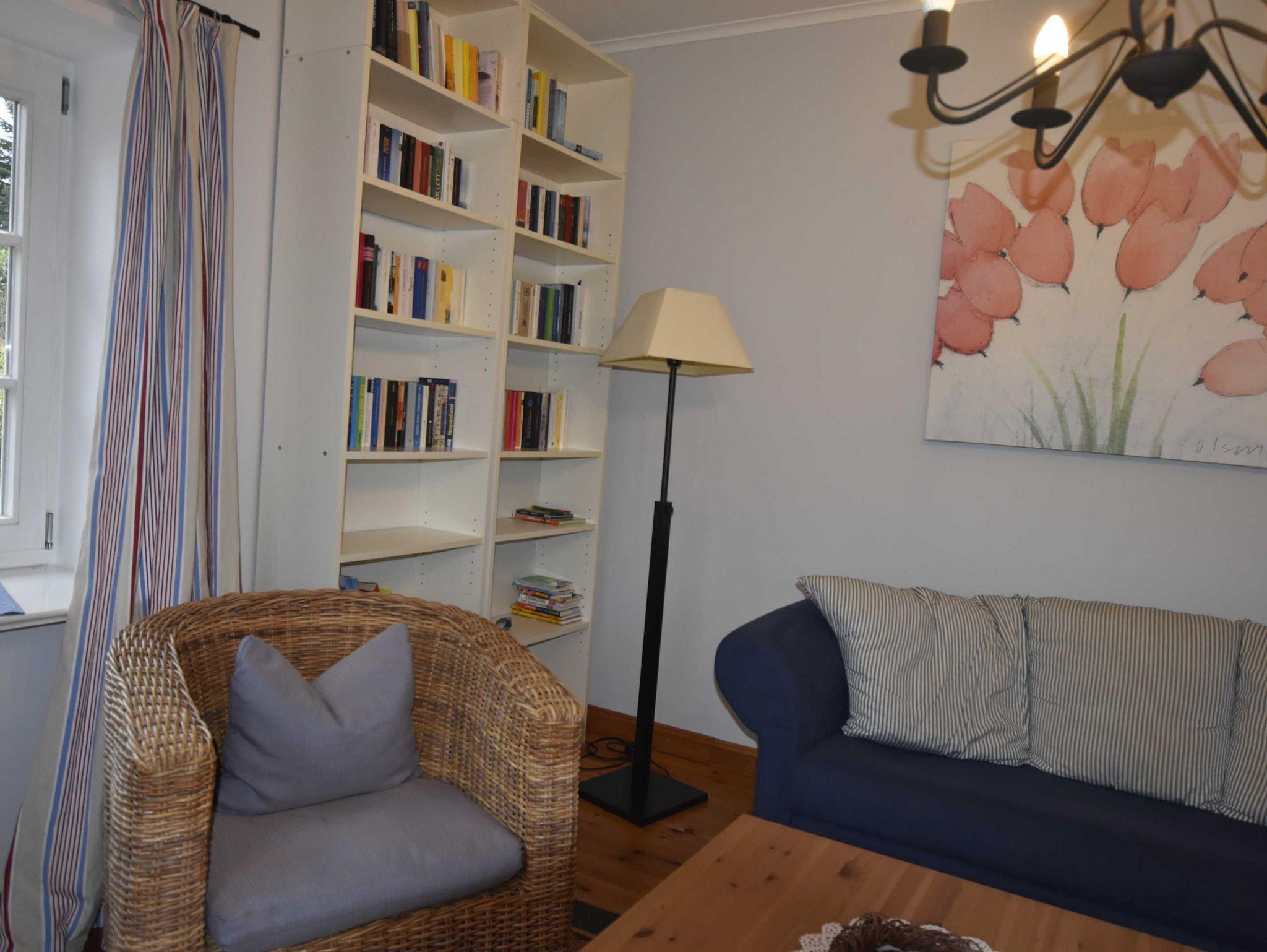 3-Raum-Ferienwohung im eleganten Landhausstil. Wohnbereich mit gemütliche Sitzecke und Eßbereich und Zugang zur Terrasse. Küche mit Backofen, 4-Plattenherd, Mikrowelle, Geschirrspüler, Kühlschrank mit Gefierfach, Toaster, Kaffeemaschine, Wasserkocher. 1 Schlafzimmer mit Doppelbett, 1 Schlafzimmer mit Einzelbett und ausklappbaren Schrankbett Zusätzliche Aufbettung für 2 Personen auf Schlafcouch im Wohnzimmer. Badezimmer mit Du / WC / Waschmaschine.