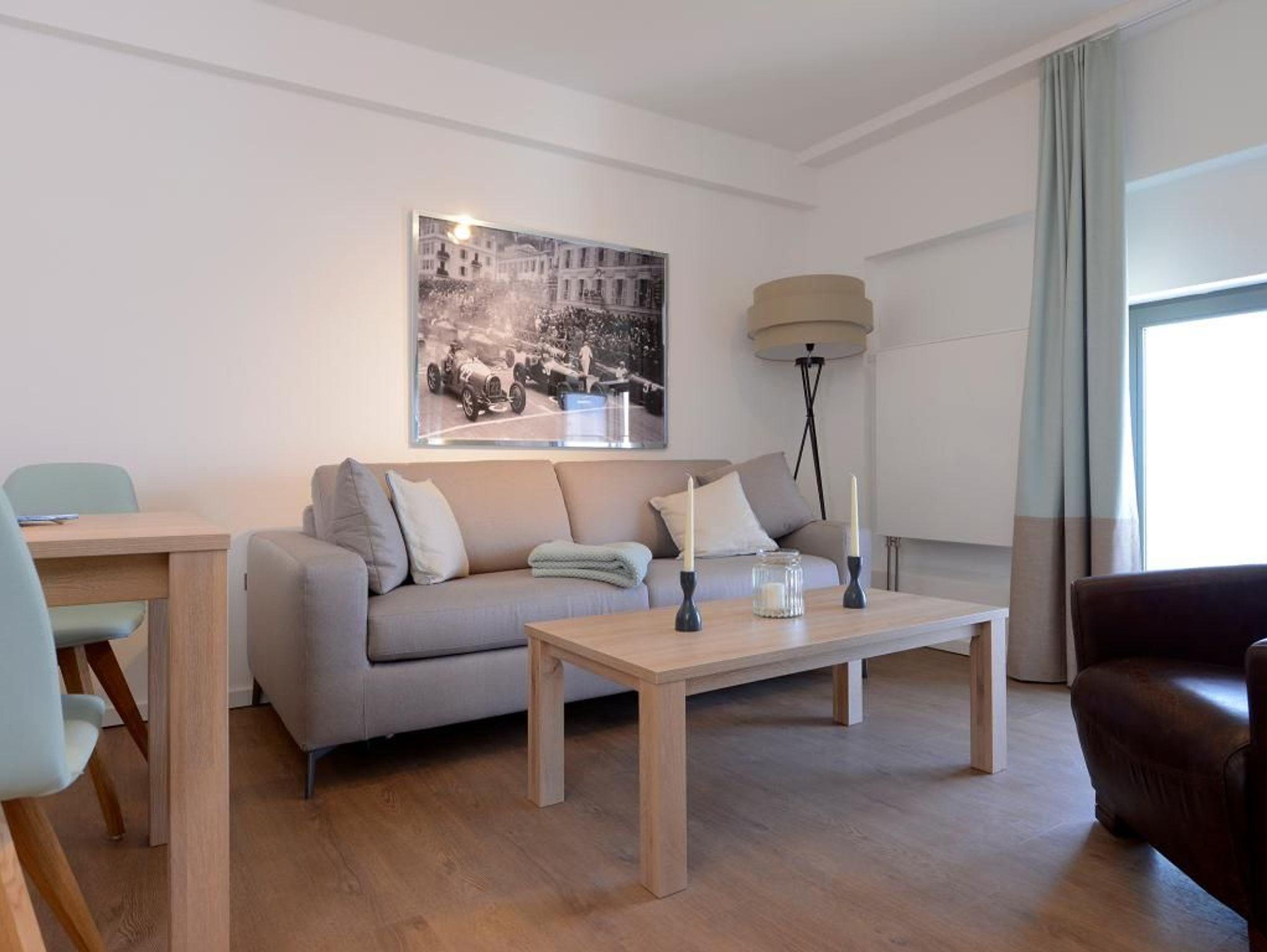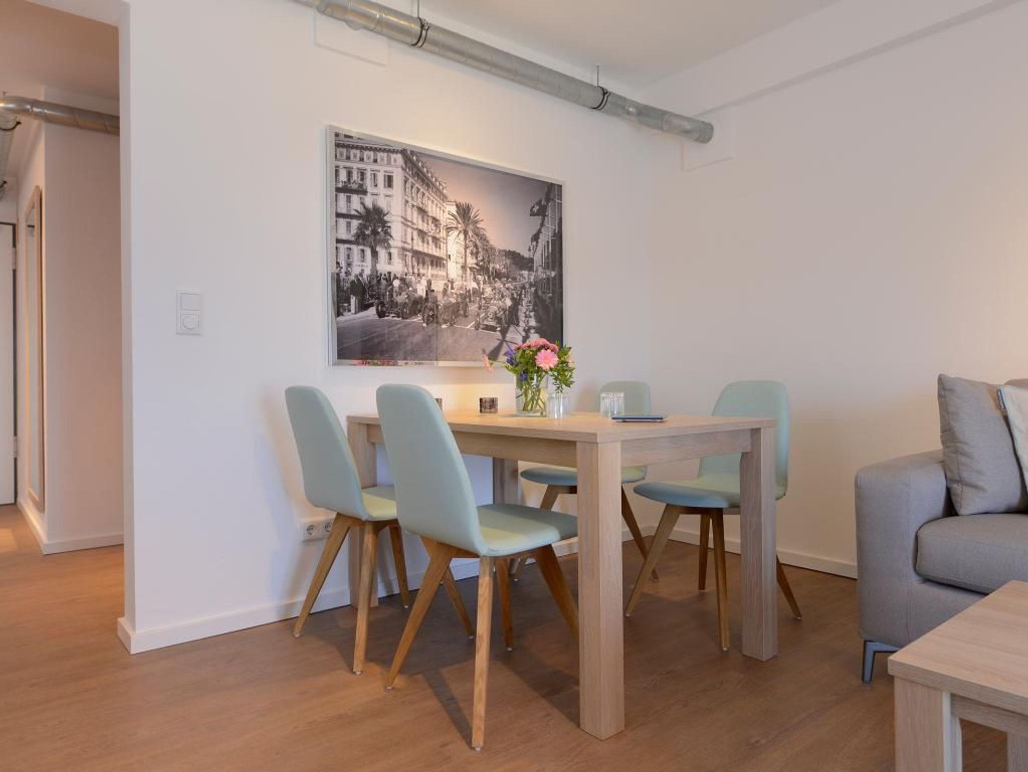 Esstisch und einem Flachbild- TV zum Verweilen ein. Die voll ausgestattete, separate Küche verfügt über einen Geschirrspüler, eine Mikrowelle, eine Kaffeemaschine, ein Wasserkocher und vieles mehr. Ein großes Doppelbett im Schlafzimmer sorgt für die nötige Erholung. Das Badezimmer ist sehr elegant eingerichtet. Bei Anreise sind 2 Betten bezogen und Handtücher liegen für Sie bereit. WLAN steht Ihnen kostenfrei zur Verfügung. In unmittelbarer Nähe sind öffentliche Parkplätze vorhanden