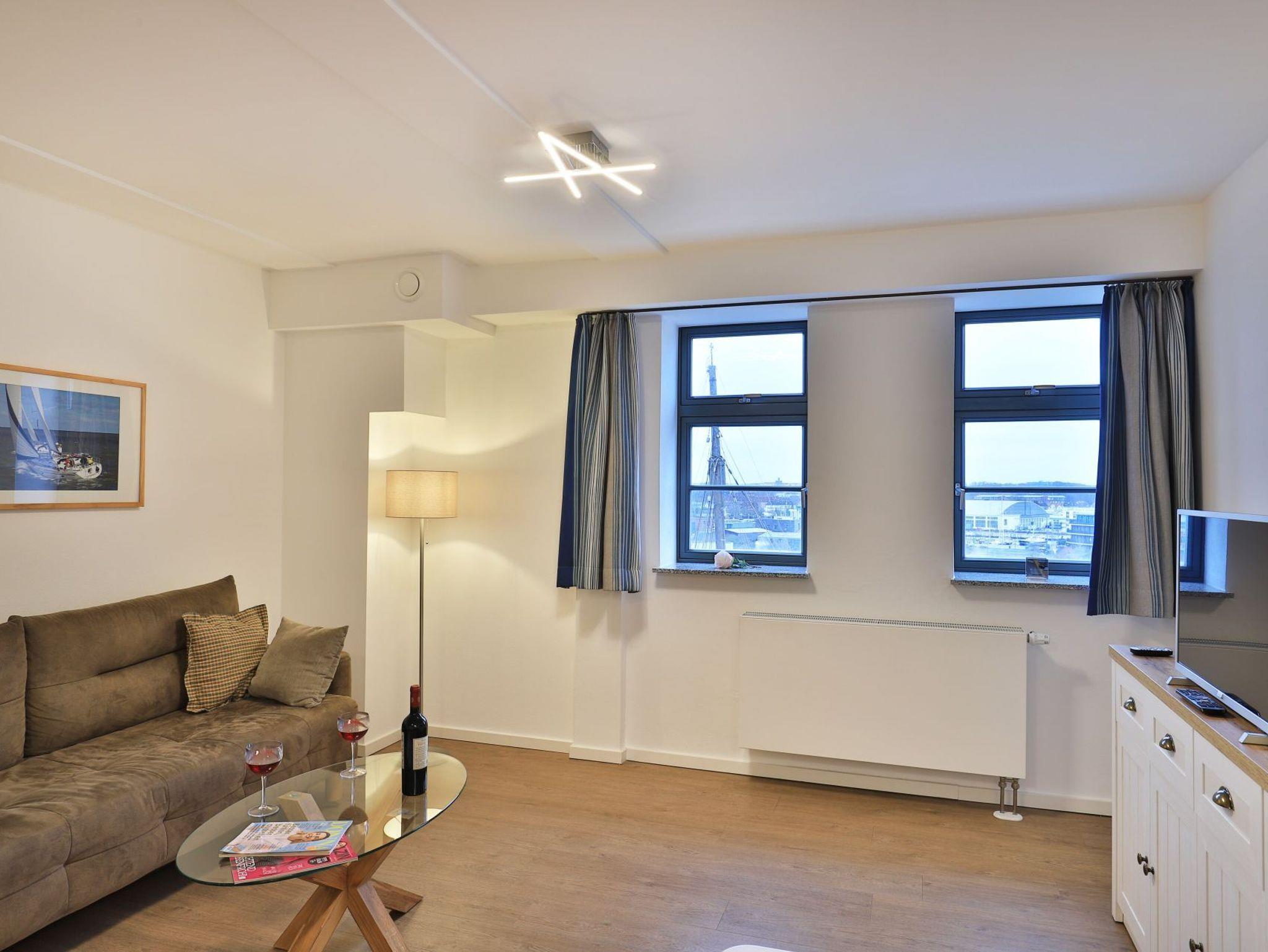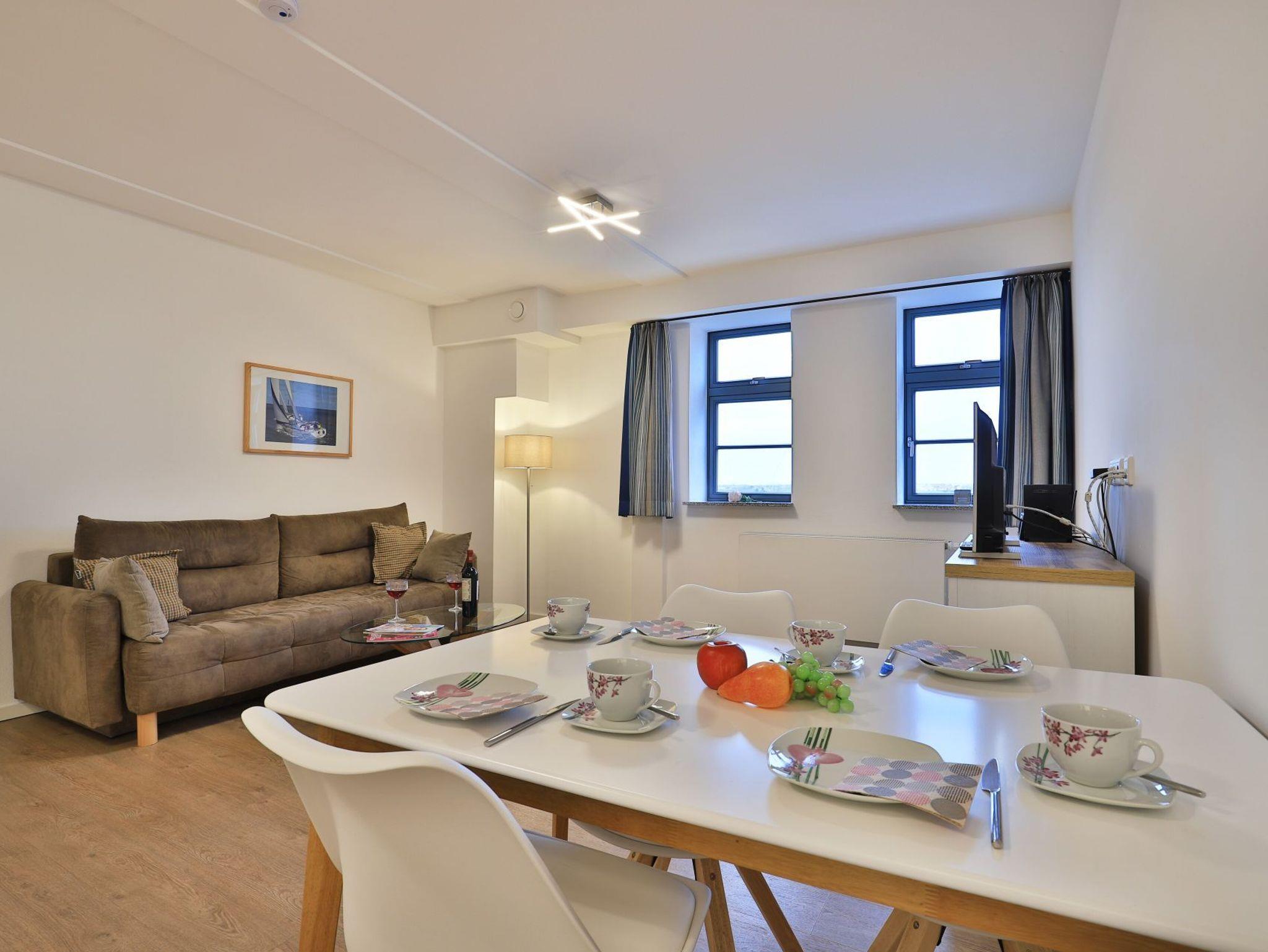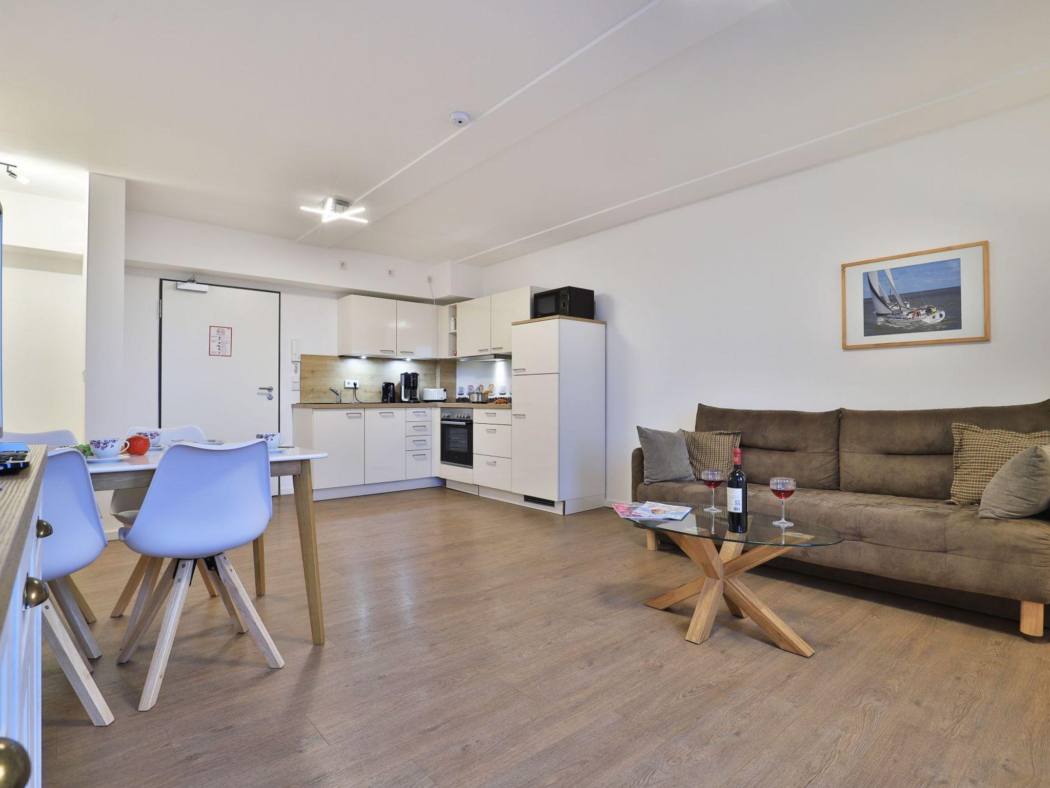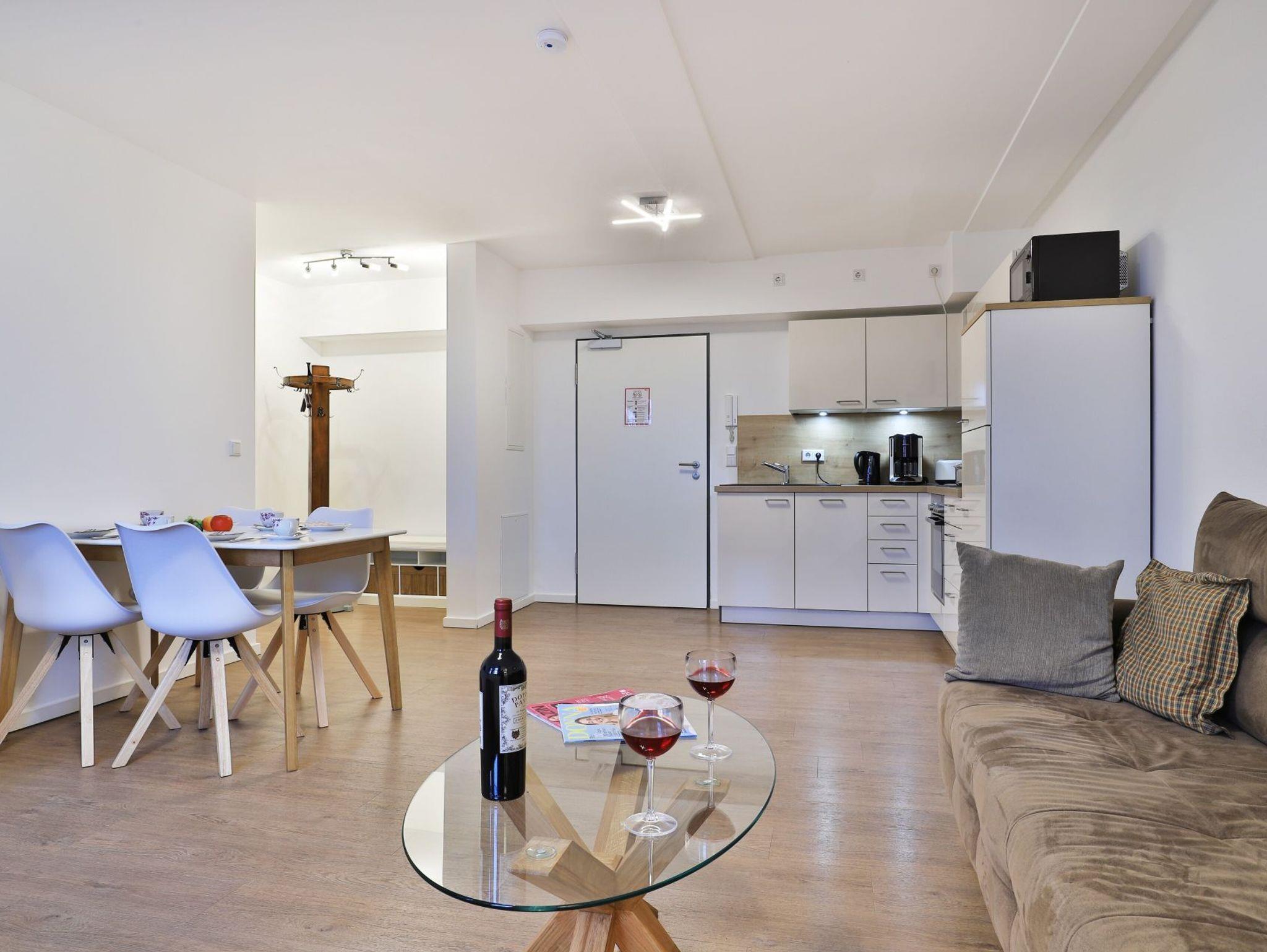 Appartementhaus mit 48 Appartements. Das exklusive 2-Zimmer-Appartement hat eine Größe von 49m². Hier können 2 Personen einen unbeschwerten Urlaub verbringen. Sie residieren in der 6. Etage, die sich ganz einfach durch einen Aufzug erreichen lässt. Der helle Wohn-/ Essbereich mit einem TV-Gerät ist komfortabel ausgestattet. Die hochwertige Küche verfügt über alles, was Sie benötigen. Des Weiteren verfügt das stilvolle Appartement über ein separates Schlafzimmer und ein sehr modern eingerichtetes Duschbad. Bei Anreise sind 2 Betten bezogen und Handtücher liegen für Sie bereit. WLAN steht Ihnen kostenfrei zur Verfügung. In unmittelbarer Nähe sind öffentliche Parkplätze vorhanden.