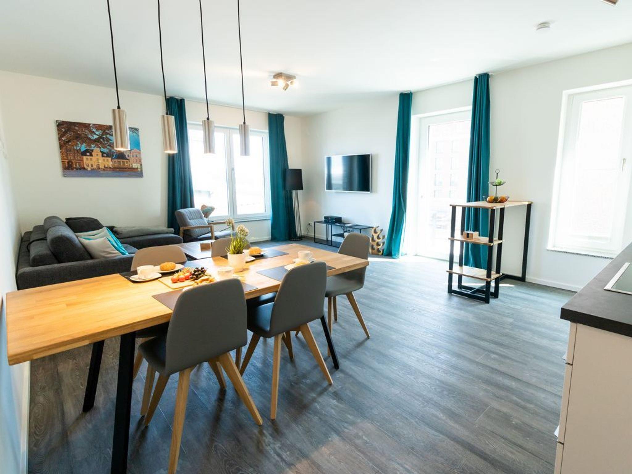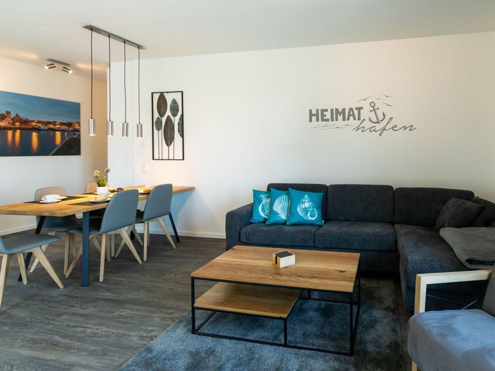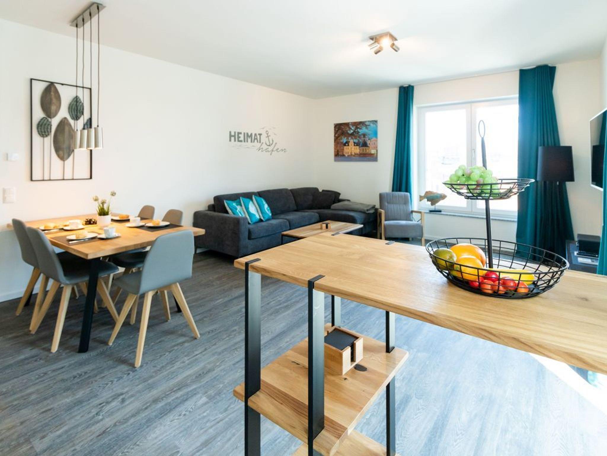 Das 3-Zimmer-Ferienappartement Hafenspitze 36 besitzt eine geräumige Wohnfläche von 81qm und ist für eine Belegung mit bis zu 6 Personen sehr geeignet. Die saisonal möblierte Loggia ist zum benachbarten Ohlerich Speicher ausgerichtet. Mit dem Fahrstuhl erreichen Sie die 2. Etage und gelangen über den Treppengang zu Ihrem modernen Domizil im 3. Obergeschoss. Es empfängt Sie ein heller und schick möblierter Wohn-Essbereich, in dem eine bequeme Sitzgruppe sowie ein Esstisch zudem Flachbild-TV wie auch Internetradio mit Hotelmodus absoluten Wohlfühlkomfort bieten. Kostenfrei nutzen Sie den Internetzugang über WLAN.