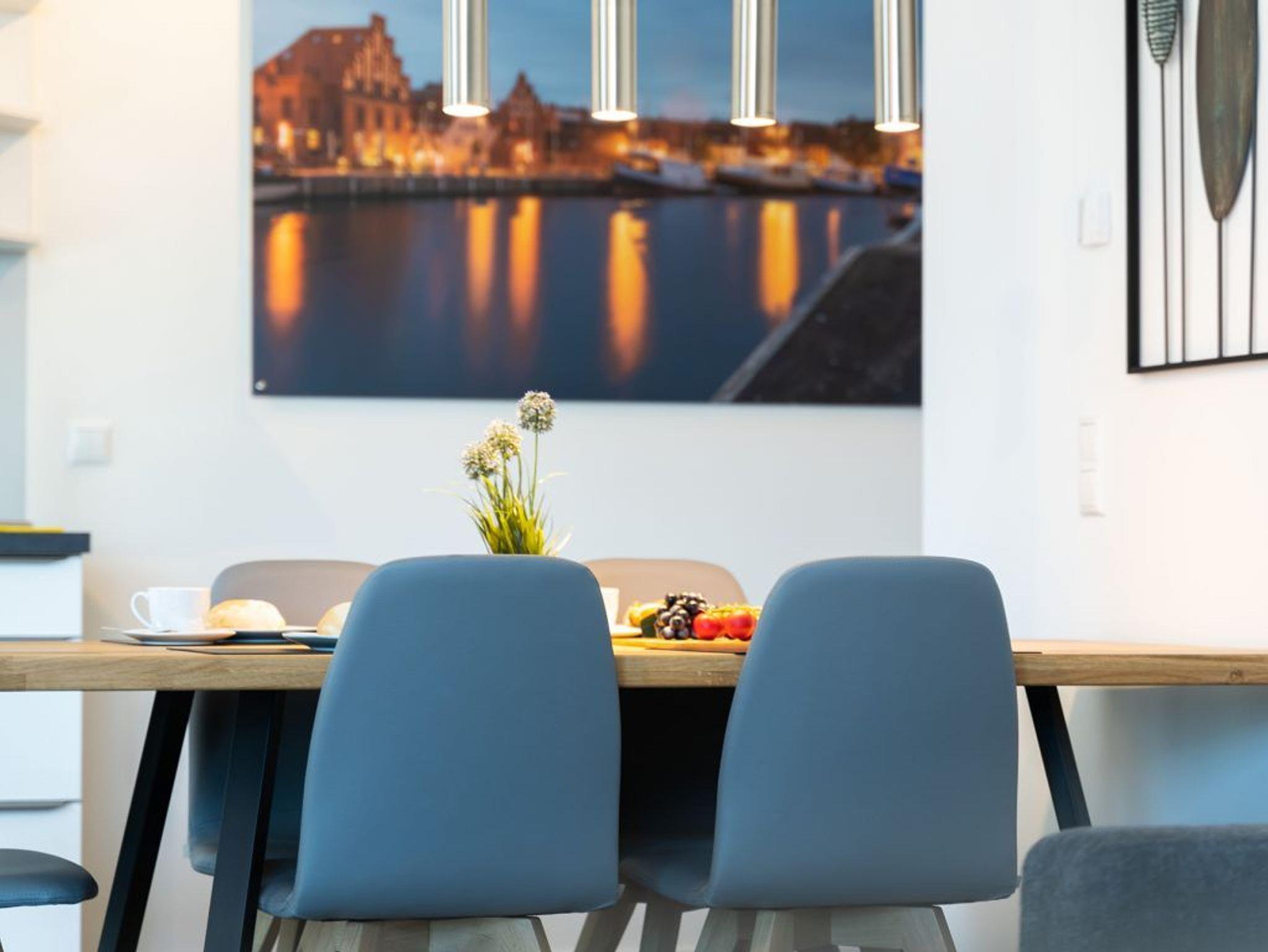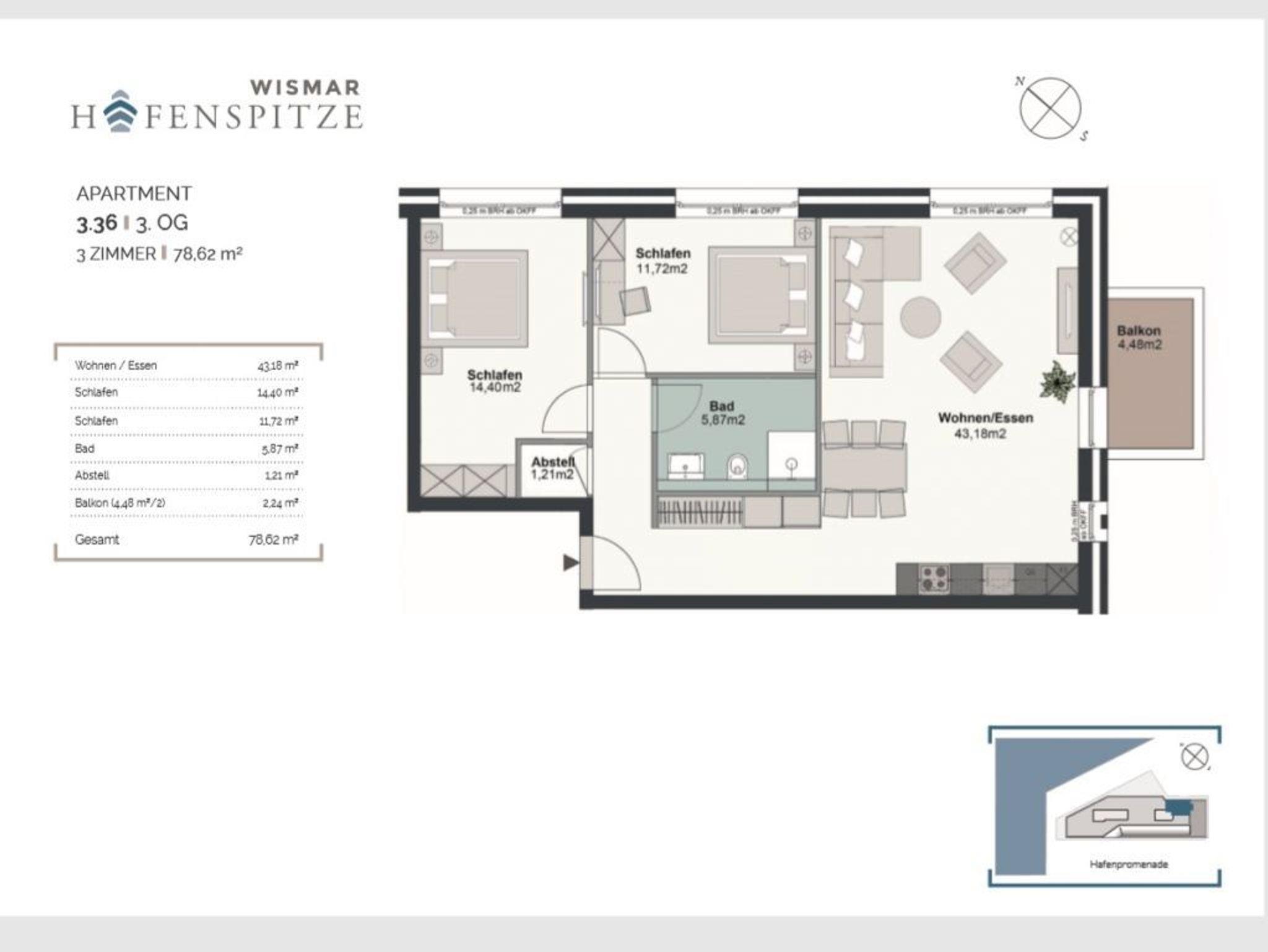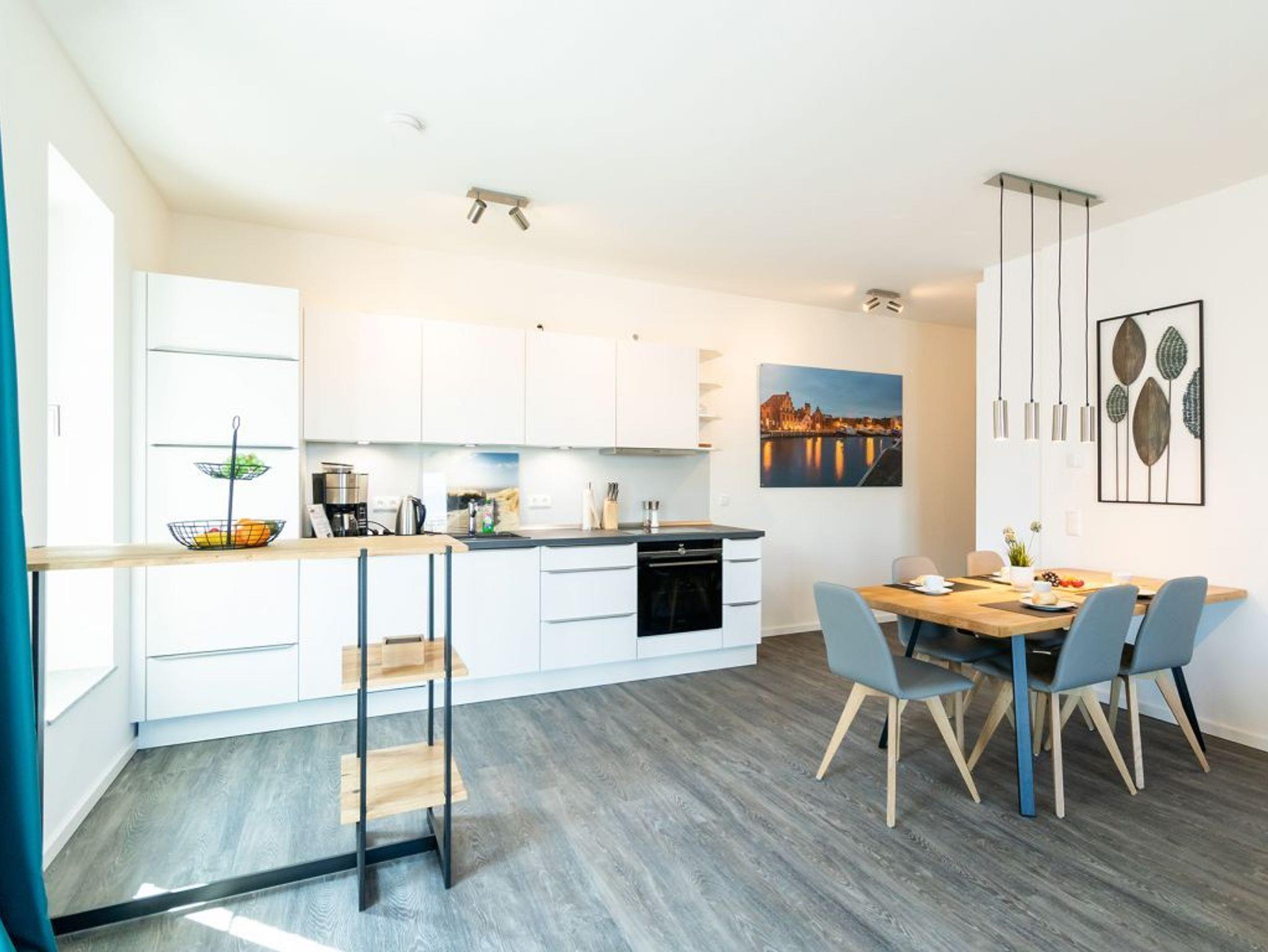 Das 3-Zimmer-Ferienappartement Hafenspitze 36 besitzt eine geräumige Wohnfläche von 81qm und ist für eine Belegung mit bis zu 6 Personen sehr geeignet. Die saisonal möblierte Loggia ist zum benachbarten Ohlerich Speicher ausgerichtet. Mit dem Fahrstuhl erreichen Sie die 2. Etage und gelangen über den Treppengang zu Ihrem modernen Domizil im 3. Obergeschoss. Es empfängt Sie ein heller und schick möblierter Wohn-Essbereich, in dem eine bequeme Sitzgruppe sowie ein Esstisch zudem Flachbild-TV wie auch Internetradio mit Hotelmodus absoluten Wohlfühlkomfort bieten. Kostenfrei nutzen Sie den Internetzugang über WLAN.
