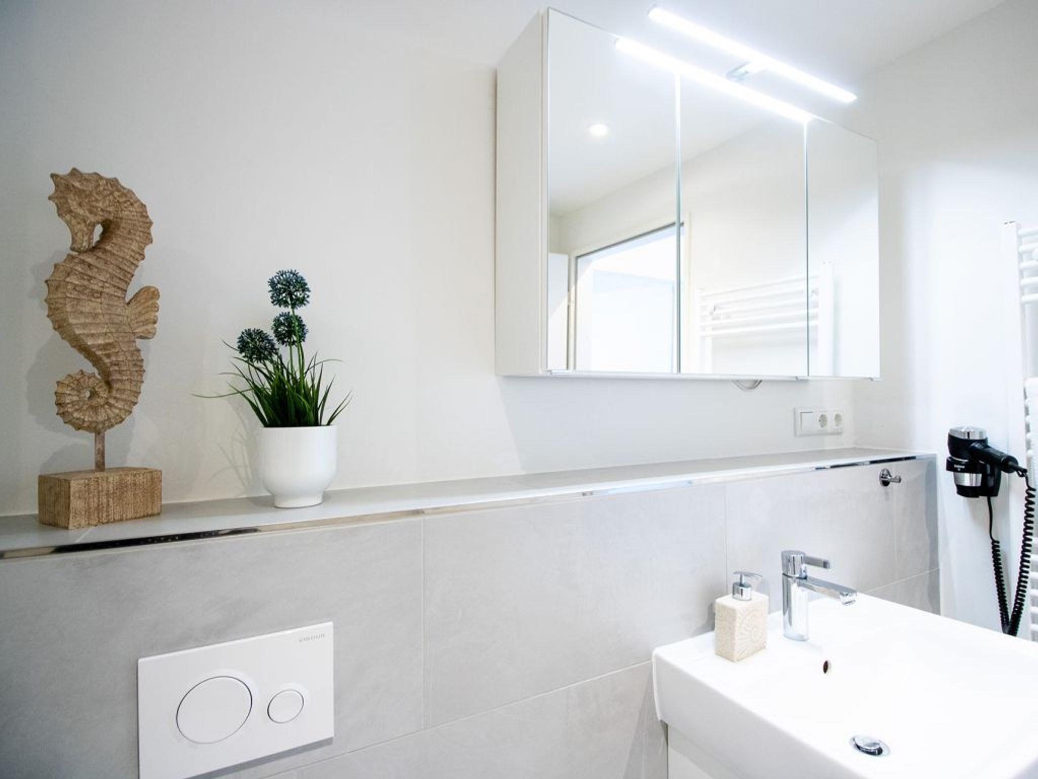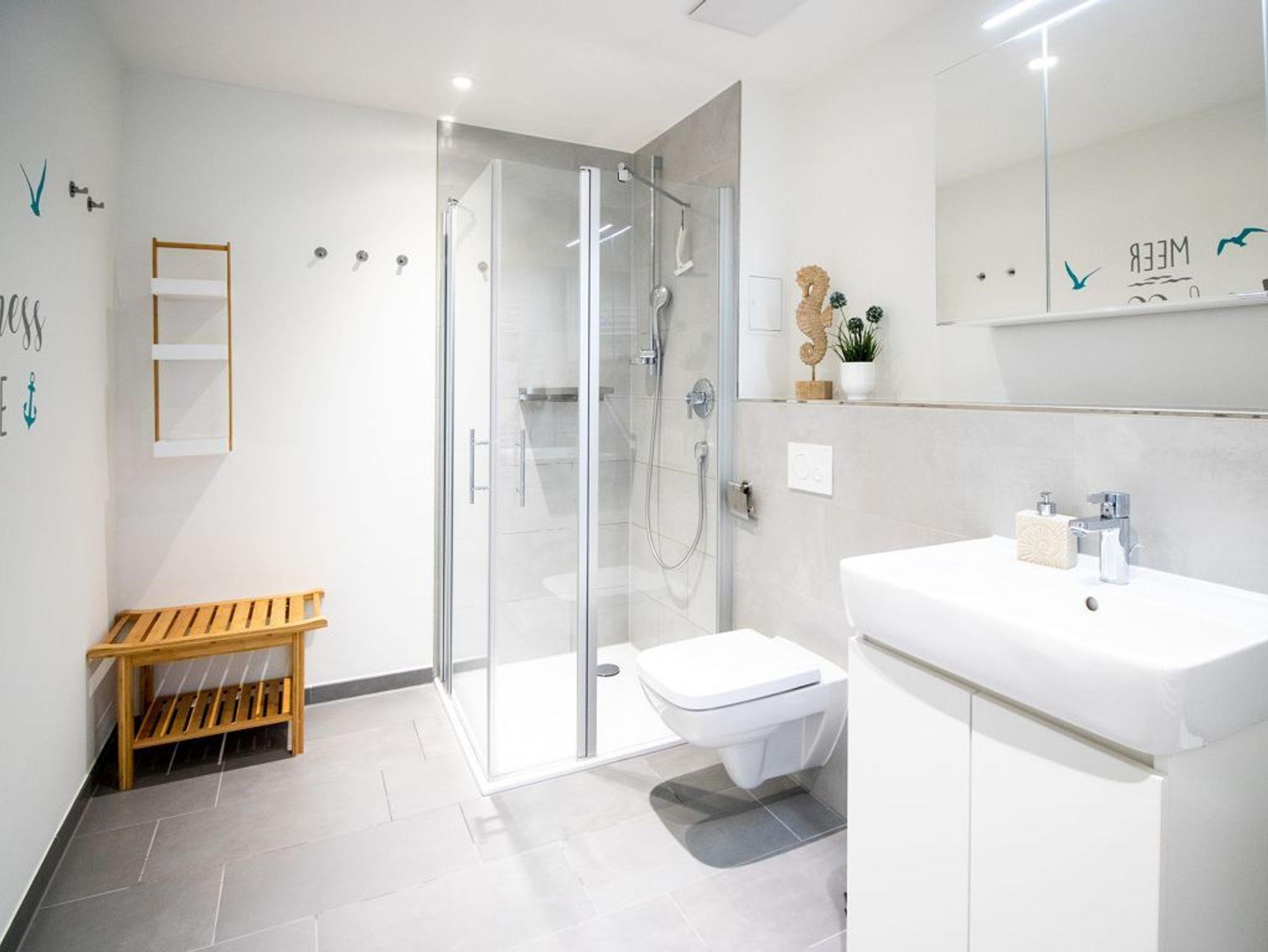 Eine sehr hochwertige Küchenzeile ist im Wohnbereich integriert und mit Ceranherd, Backofen, Mikrowelle, Geschirrspüler sowie Kaffeemaschine, Wasserkocher und Toaster ausgestattet. Somit können Sie sich bei Bedarf auch komplett selbst mit leckeren Urlaubsmahlzeiten versorgen. Außerdem besitzt das Feriendomizil zwei separate Schlafzimmer, wodurch es auch ideale Bedingungen für Familien ermöglicht. Auch das innenliegende Badezimmer mit bodengleicher Dusche, Waschtisch, WC und Handtuchheizkörper verwöhnt mit einer Fußbodenheizung.