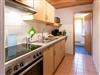 Küche mit E-Herd, Geschirrspüler, Mikrowelle, Kühlschrank, Kaffeemaschine, Toaster