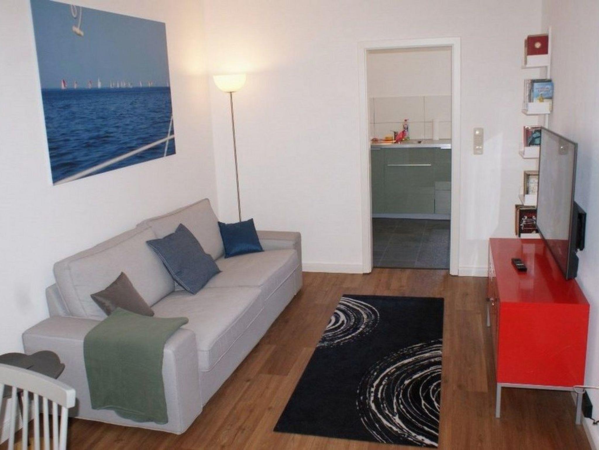 - Wohnzimmer mit Sofa und Esstisch für vier Personen (+ Kleinkind, Kinderstuhl und -bett vorhanden), TV