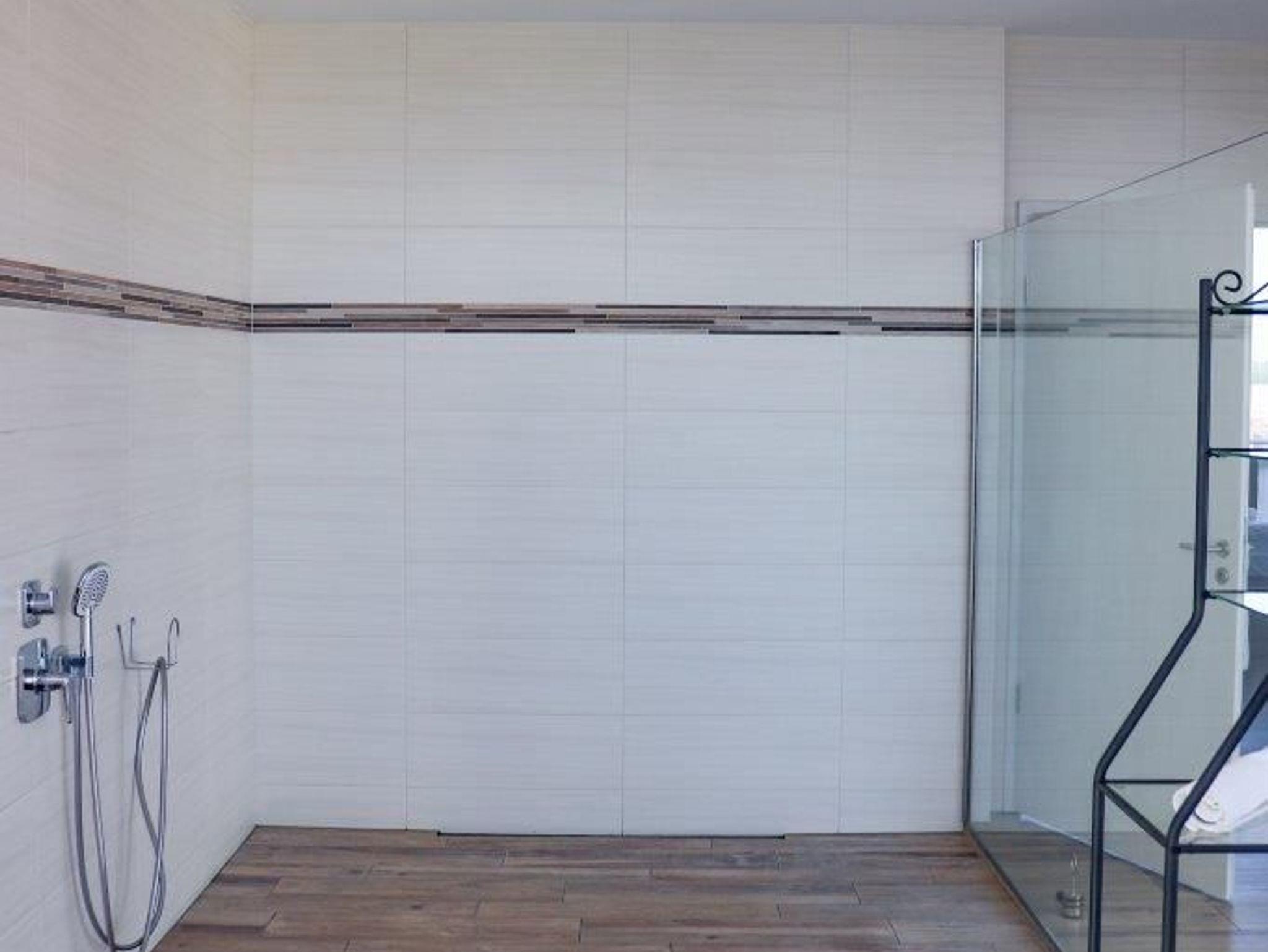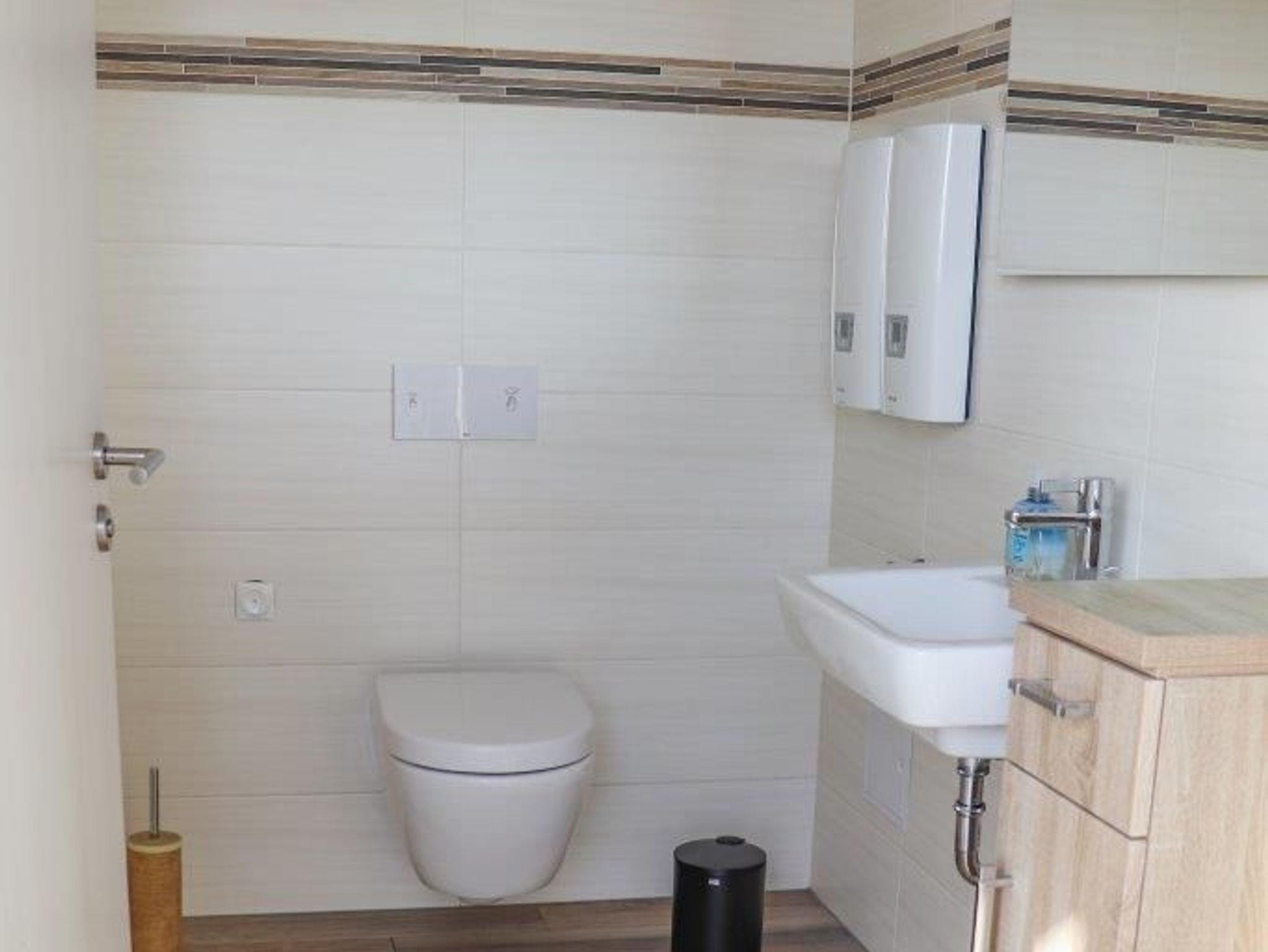 - 1 Badezimmer mit Dusche, WC, Spiegel, Waschbecken