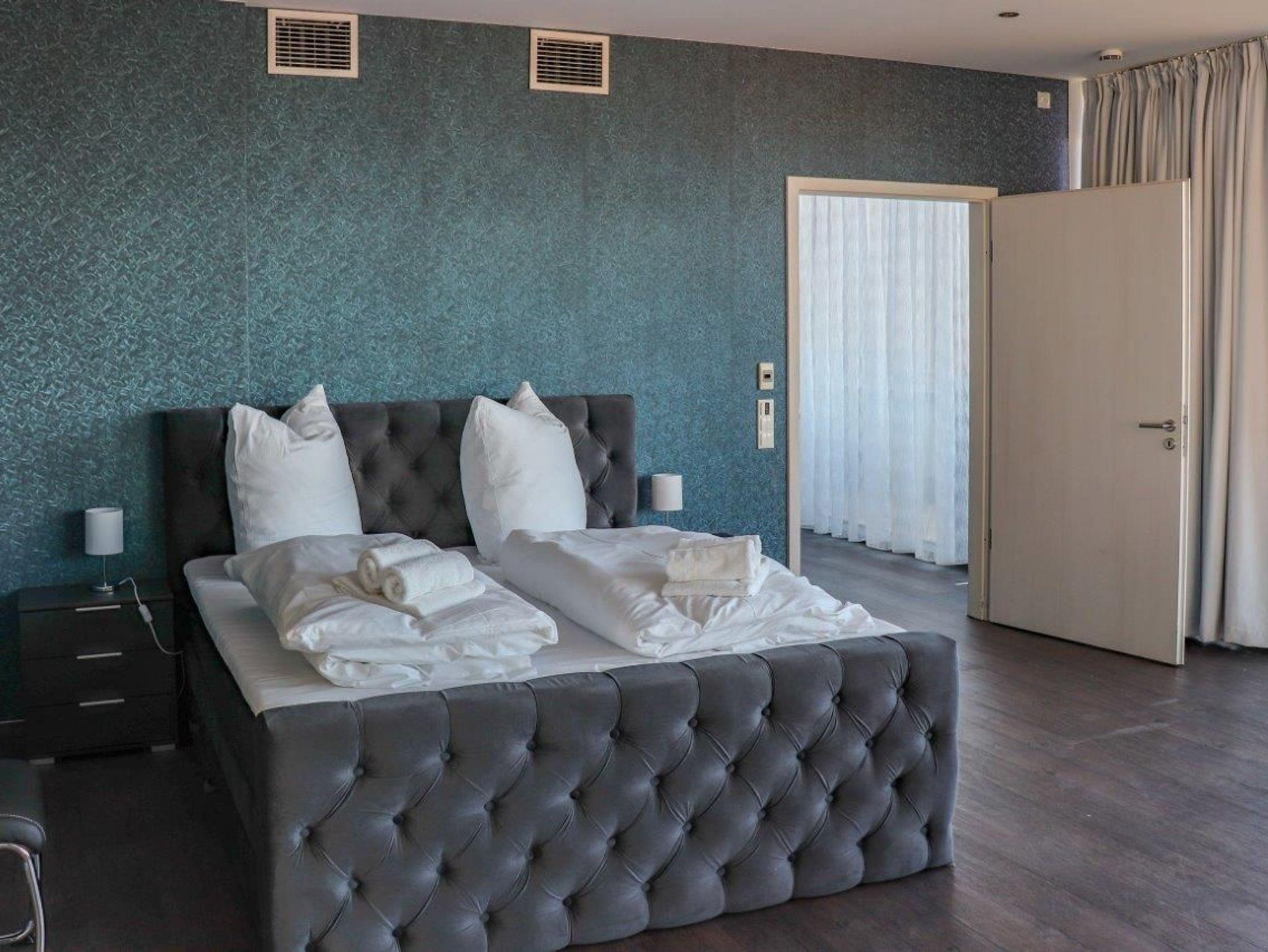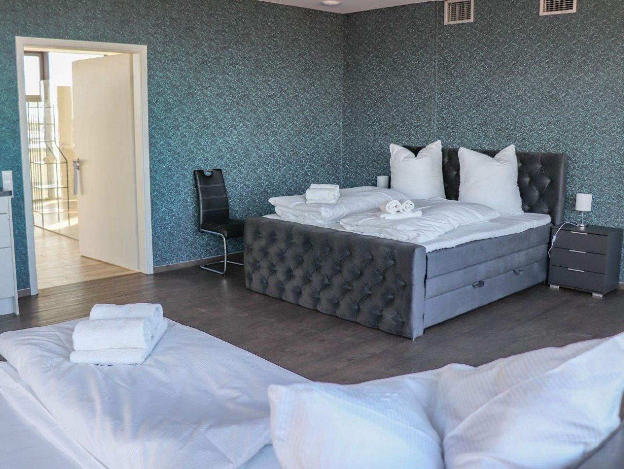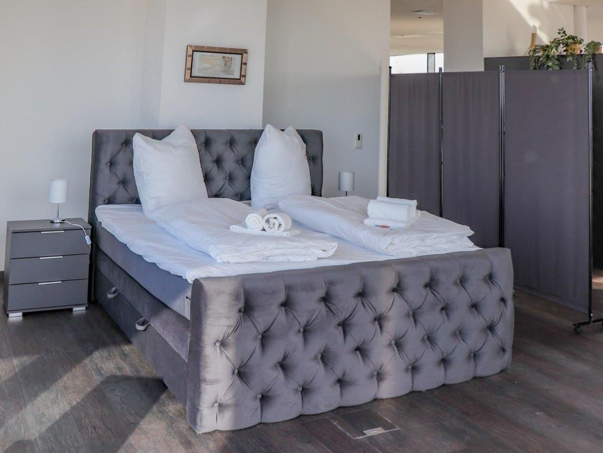- Wohn-/Schlafzimmer mit 2 Sofas (1 Schlafmöglichkeit), Flat-TV, getrennter Schlafbereich mit Boxspring-Doppelbett (1,80 x 2,00 m) mit Nachtisch und Raumtrenner