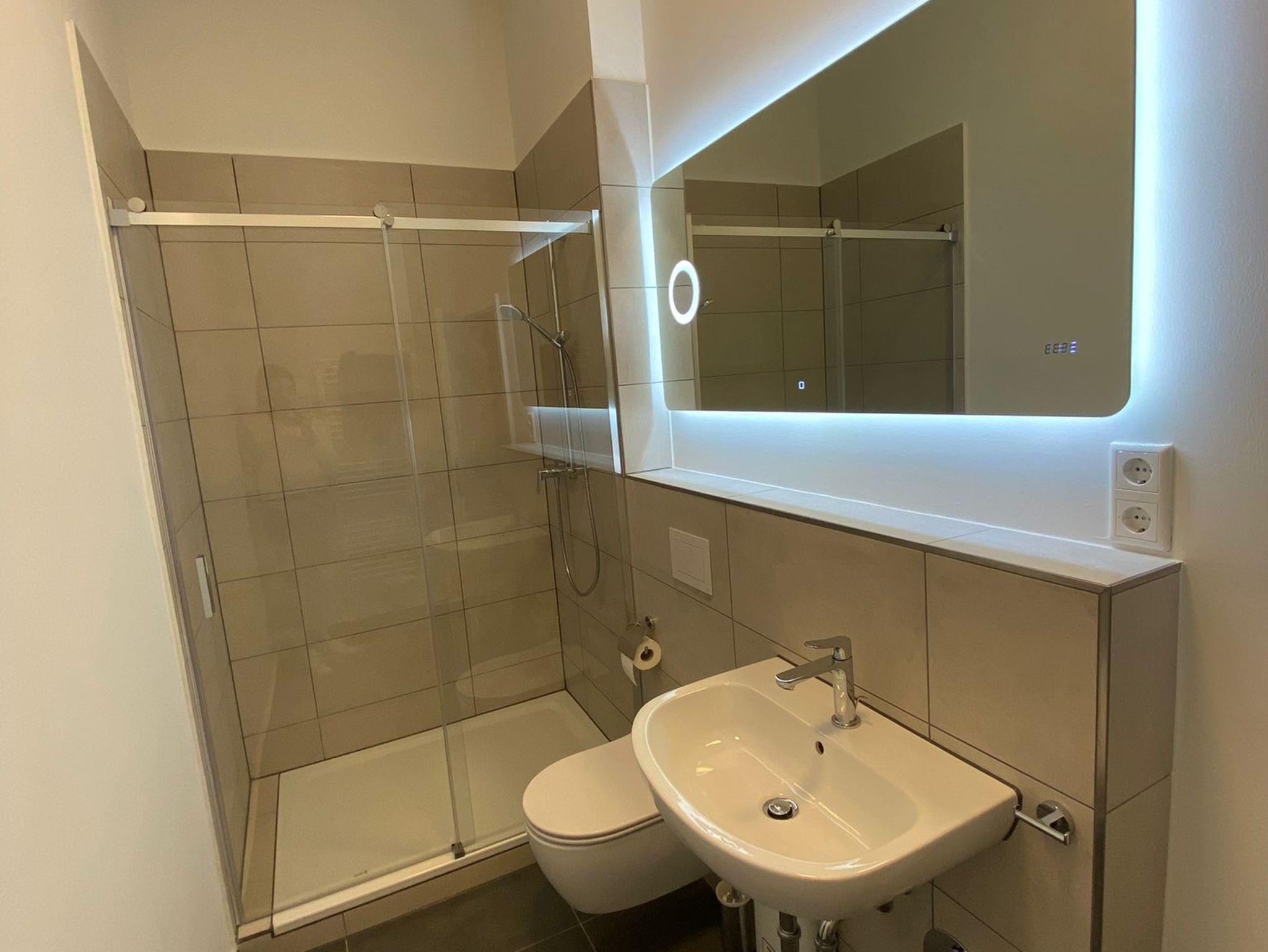 - Badezimmer mit begehbarer Dusche, WC, Waschbecken, Spiegel