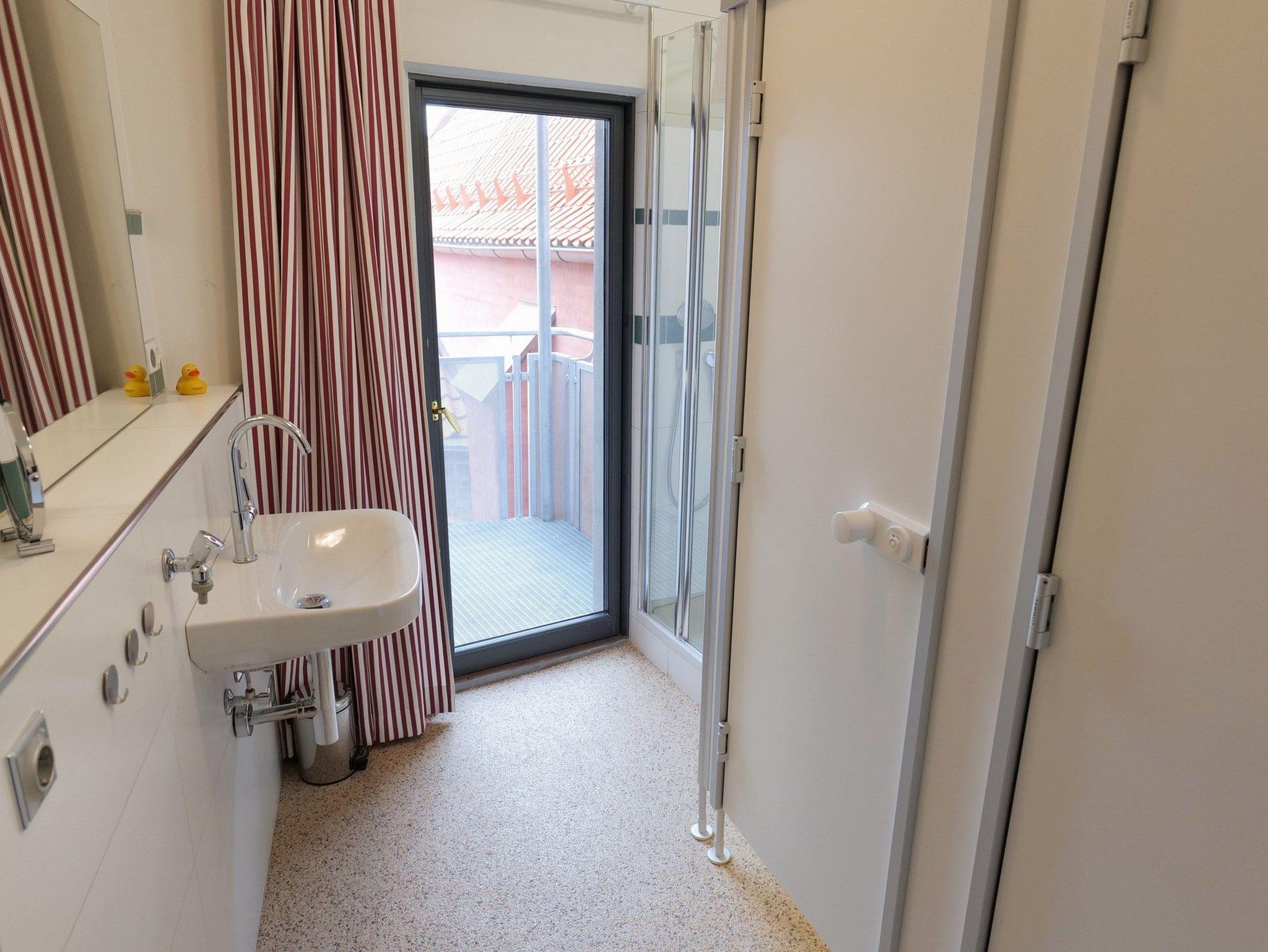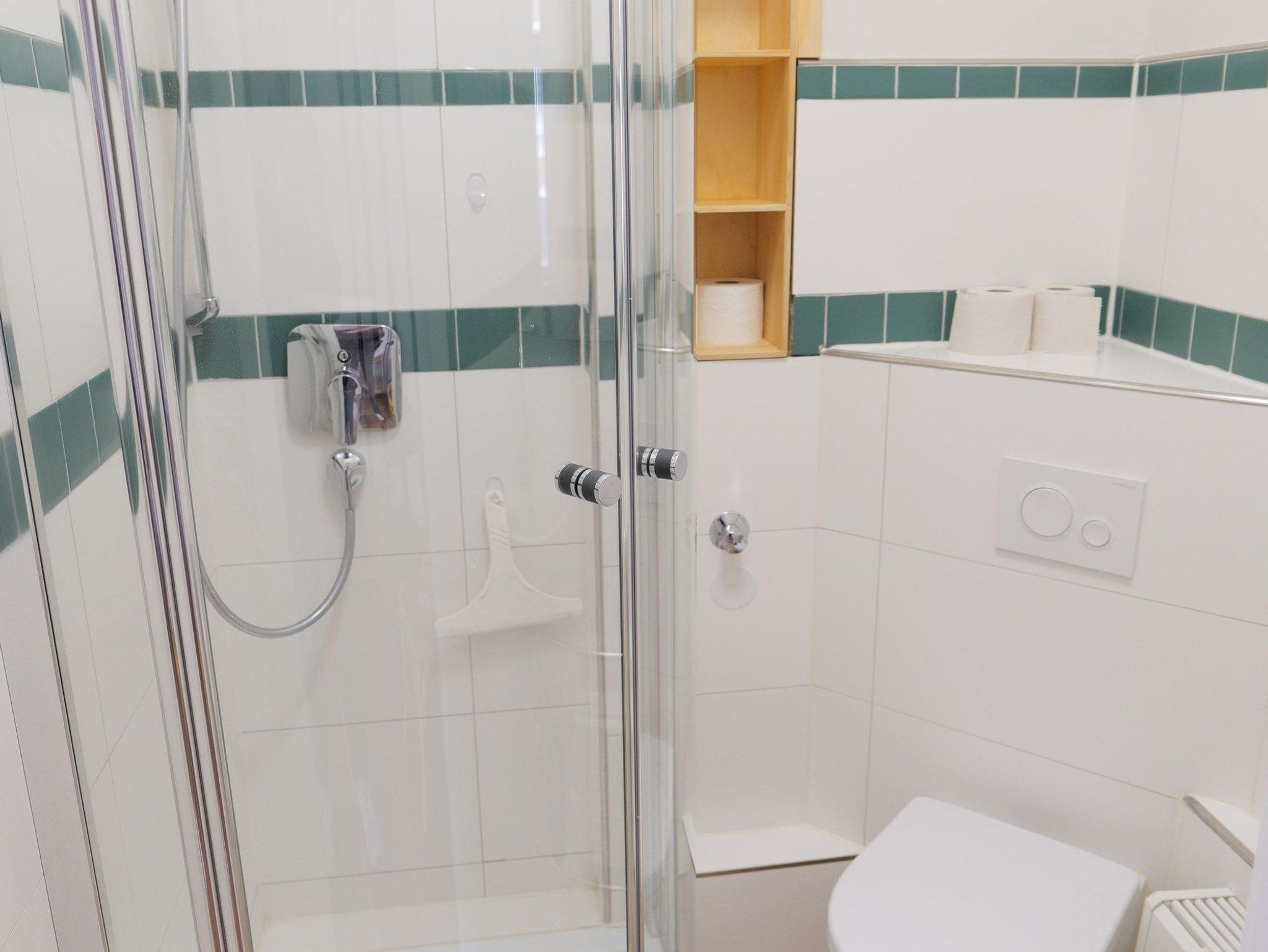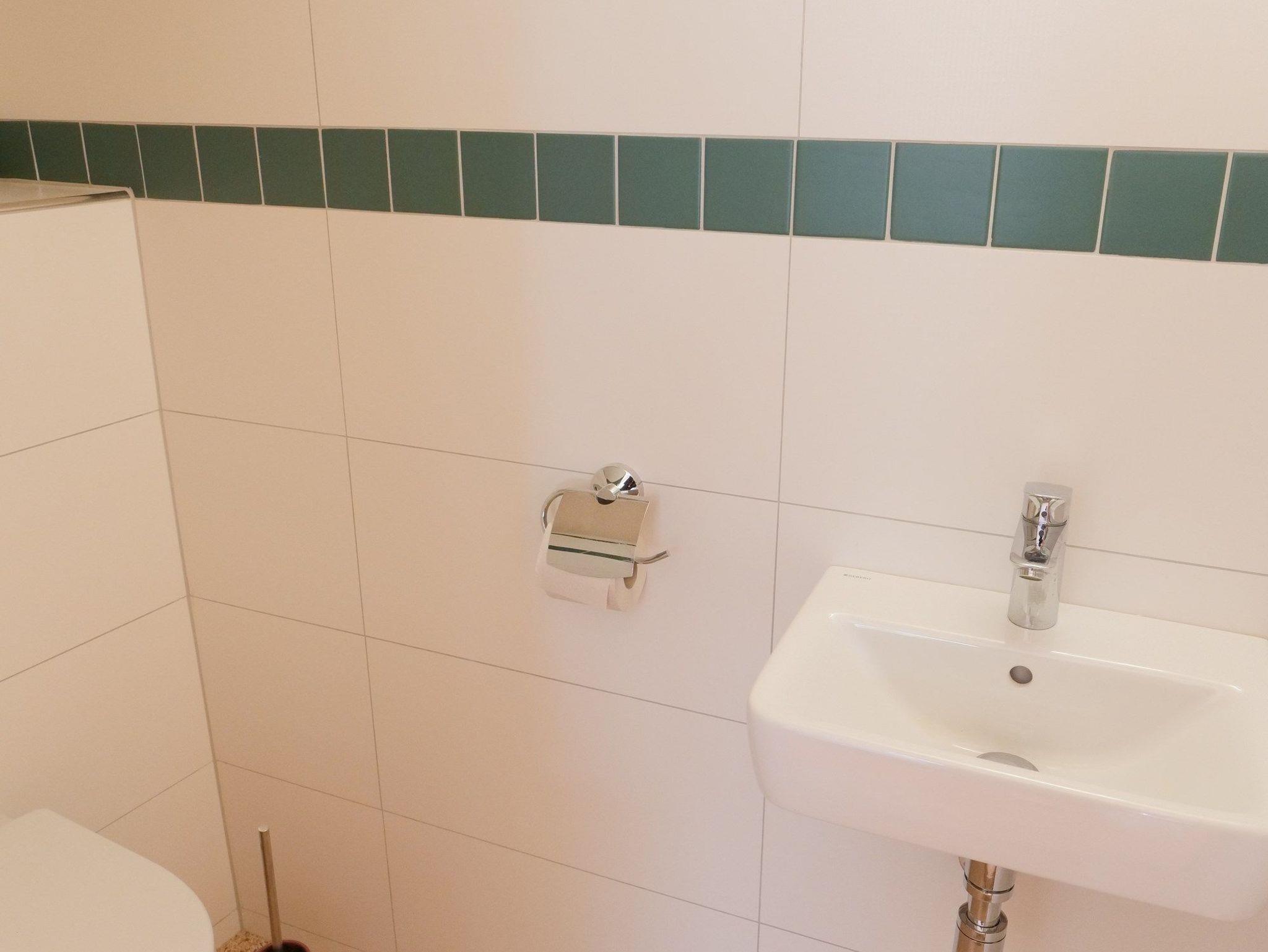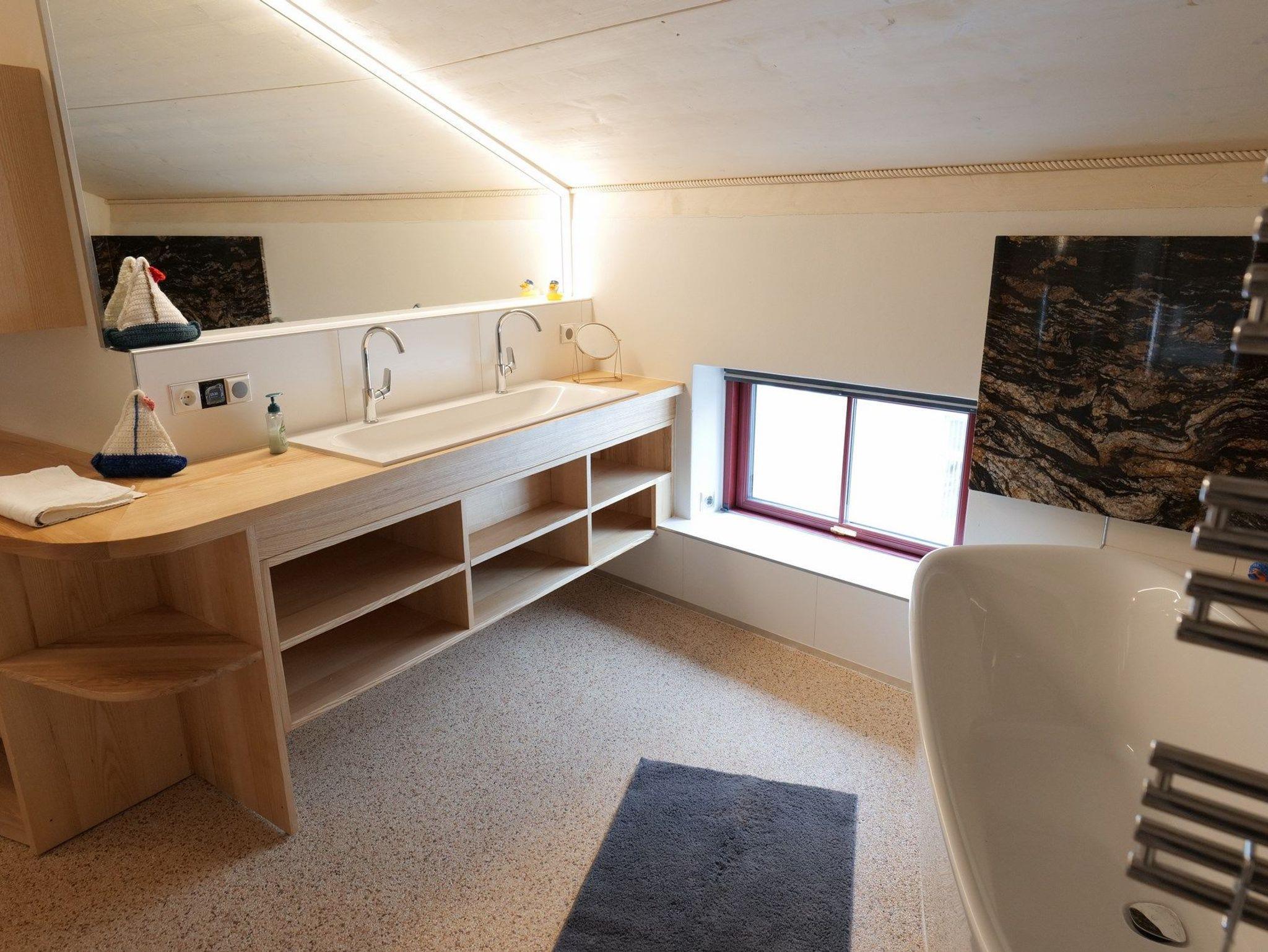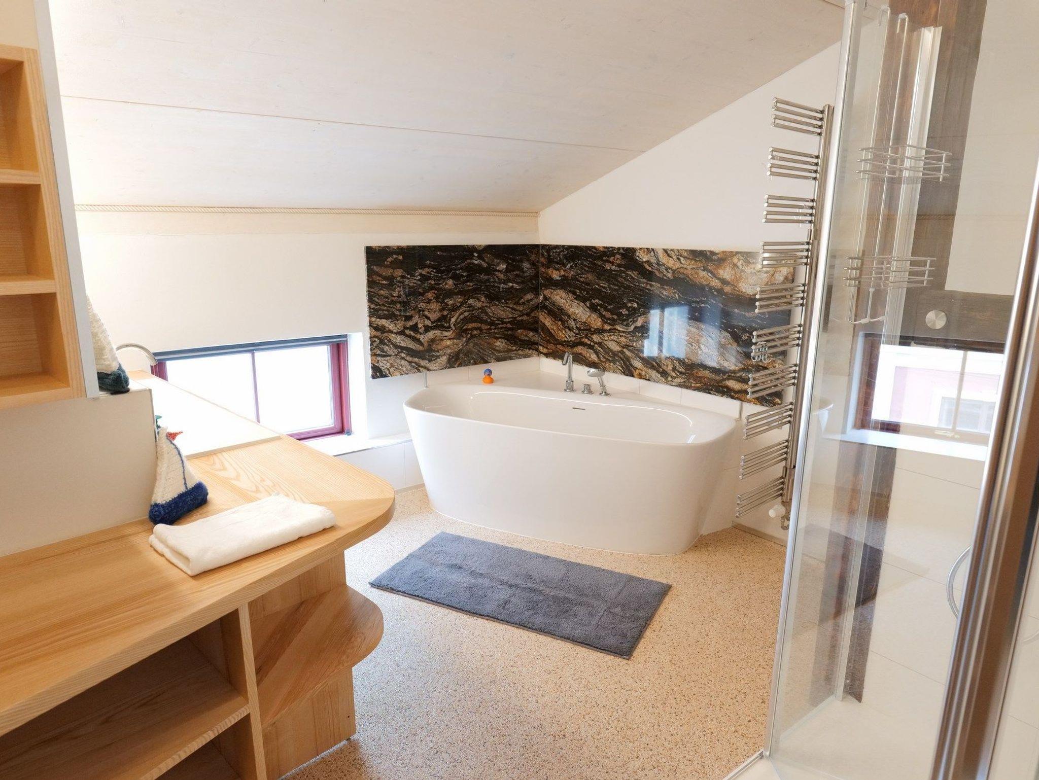 - Badezimmer mit Badewanne, Dusche, WC, Waschmaschine